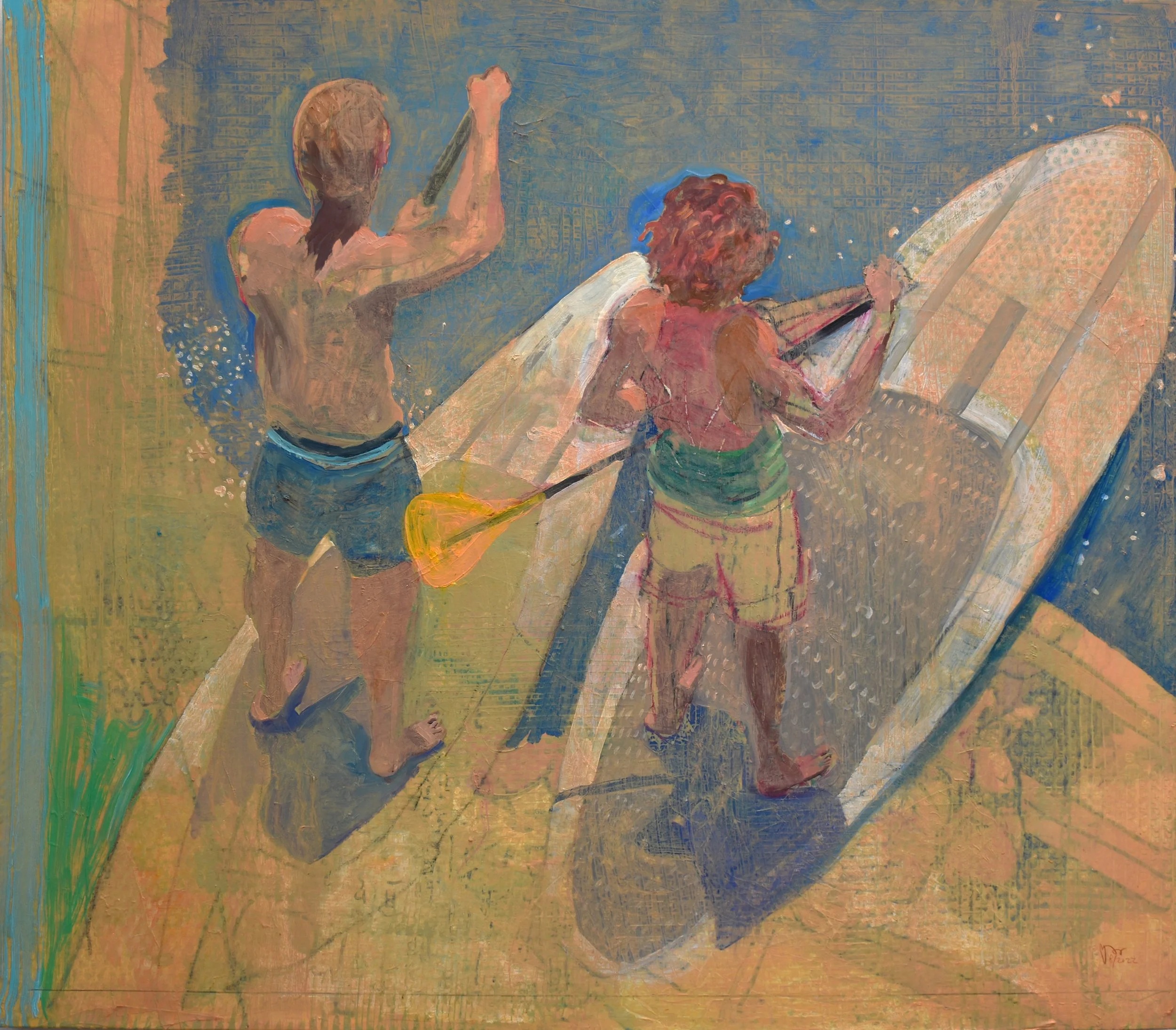 since i discovered and photographed these paddlers, i’ve included them, in one way or another, in numerous paintings, both oils on canvas and watercolor/gouache/collage on paper. so who are they and what do they represent? first of all, they are forms in space. they are headed somewhere. on a voyage. they transport me beyond my familiar spaces and boundaries.