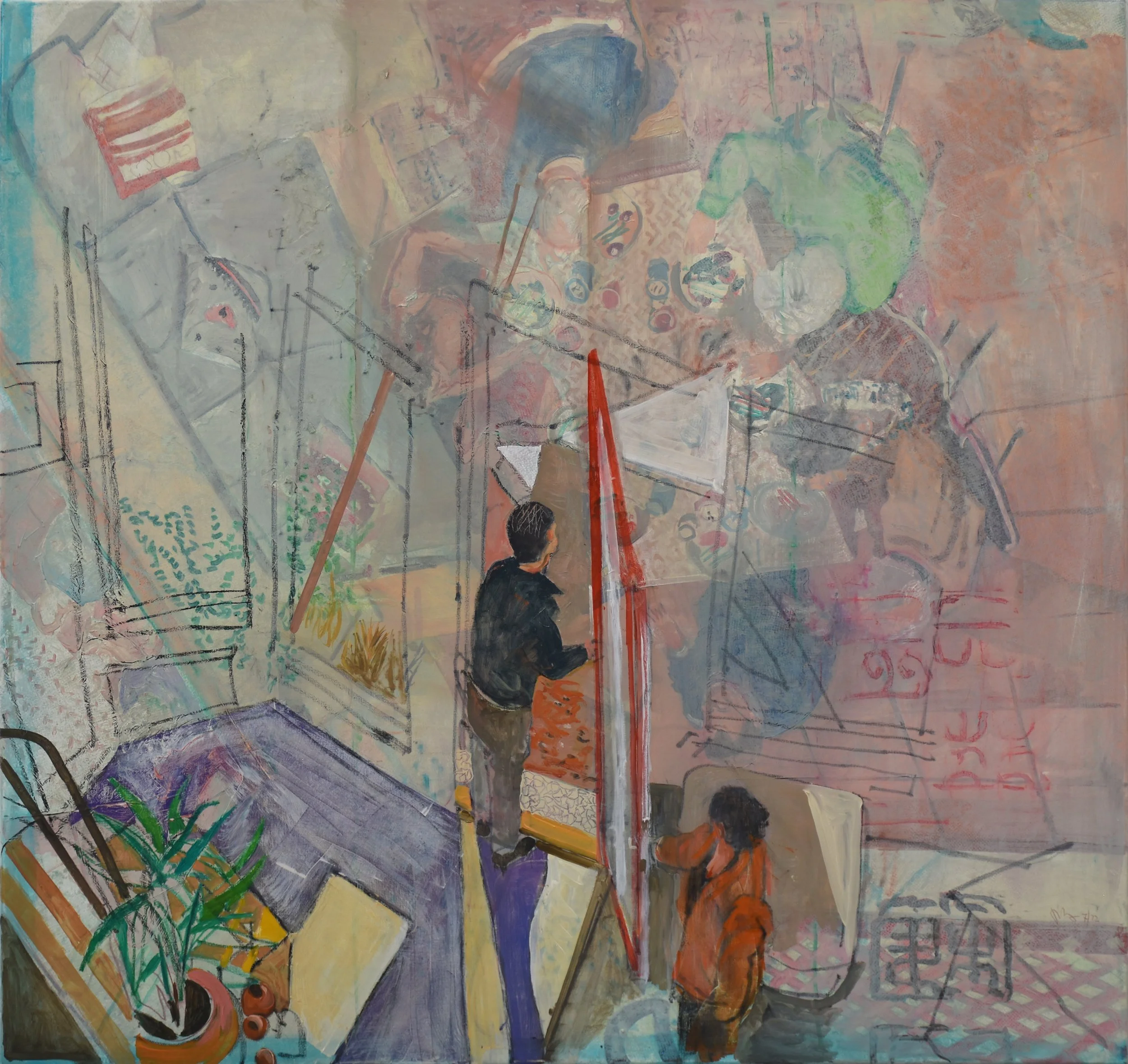 so after she left, i went over the entire painting with that pinkish color i’ve been using lately, and then scraped it to get off the excess solvent & started selectively rubbing into it using an old washcloth. i revealed the two figures, the red door & the plant on the left, then added some diagonal lines in black oil stick inspired by one of my views from above photos of the acropolis museum in athens. architectural structure is often my go-to way of dividing up the space in a composition. in this case, while the underlying bits of an earlier painting remain, those black diagonal lines interspersed with round electric light bulbs allow us to make visual sense of those traces of earlier compositions, while allowing the eye to focus on the two figures.