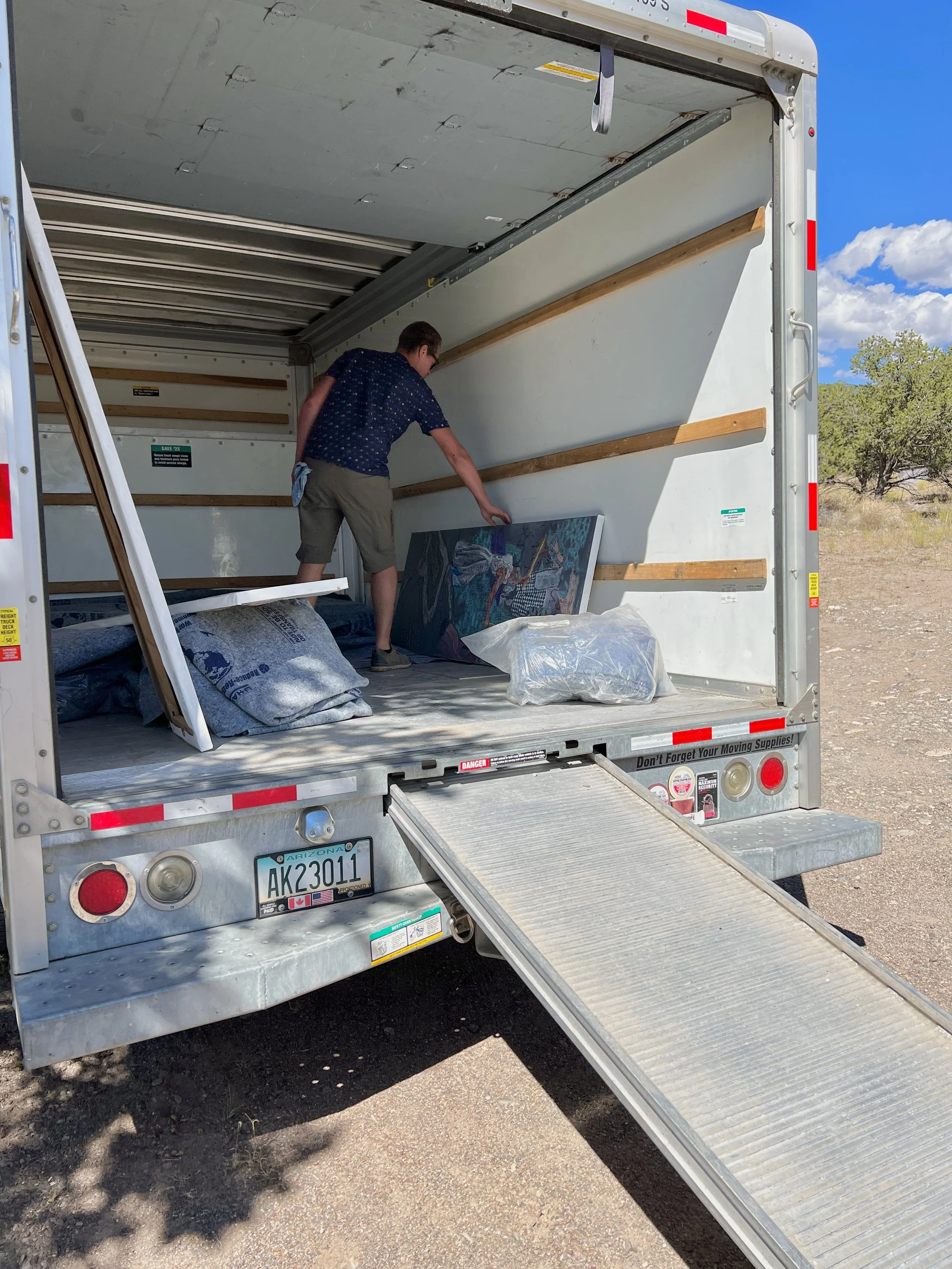 4:11 PM: a few hours ago we loaded the uhaul truck with 28 stretched paintings & 8 watercolor/collages under glass. we’ll get going at 7am tomorrow & should arrive at cmc aspen gallery about 10:30. after unloading the work, we’ll look at what looks best where and take back the ones that don’t seem to fit on the walls. it’s a very varied space, and i suspect it will take more of the paintings than we had suspected.