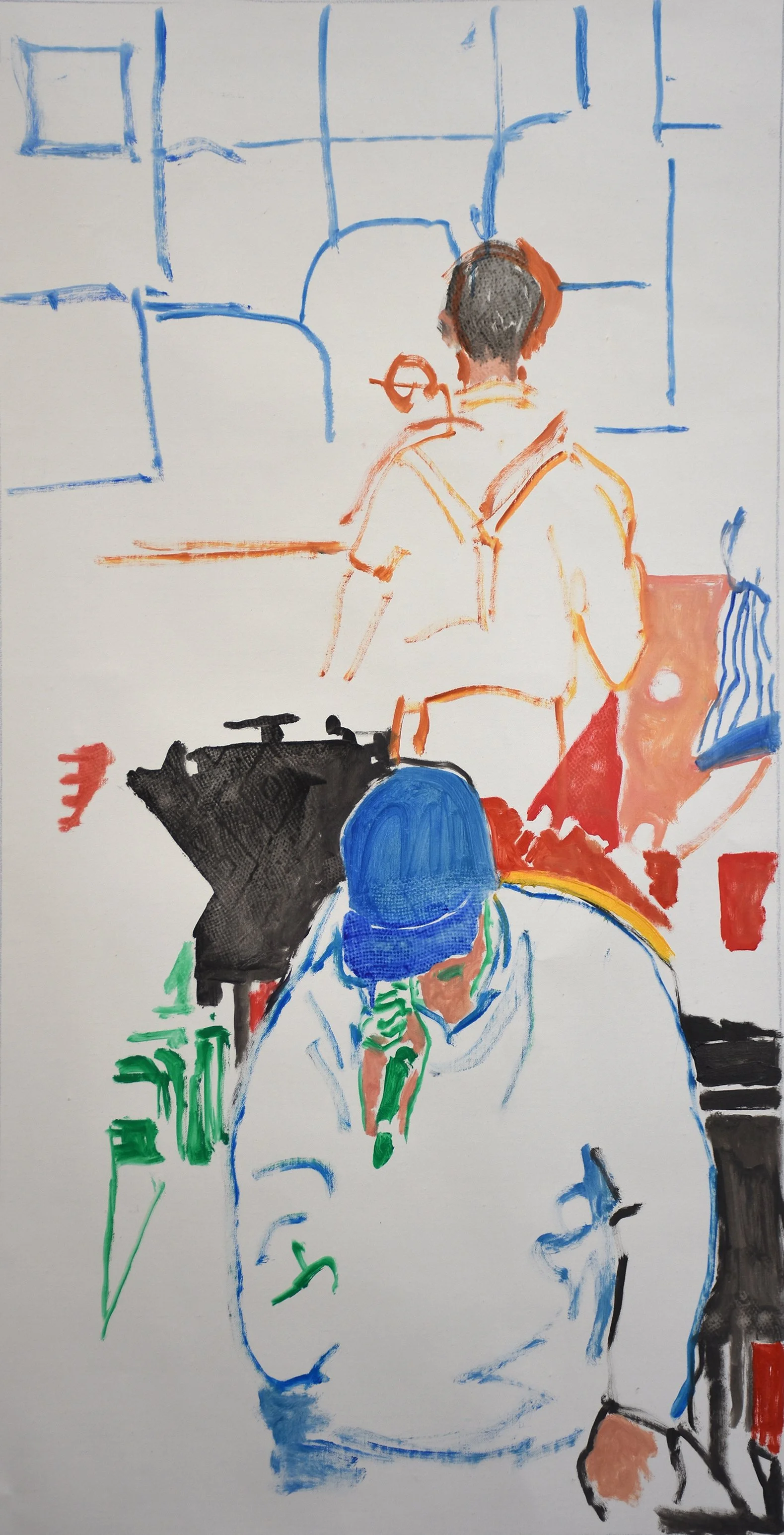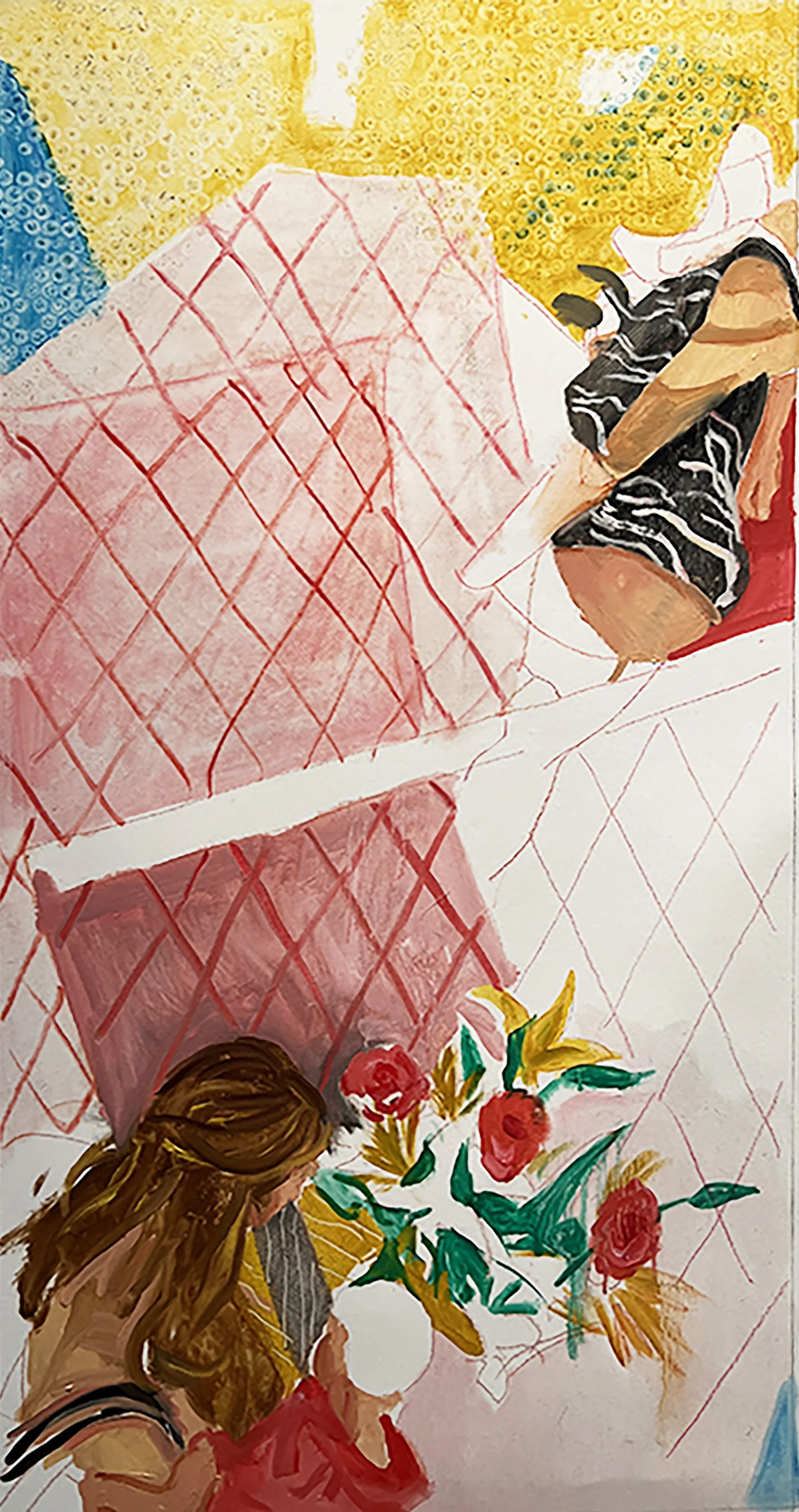 a mother holding her child stands next to a vase of flowers and a second figure is on the upper right. it’s intentionally not clear what that figure is doing, but the forms give you hints, and the viewer will have to determine what’s going on up there. the floor at space does not have the pink and red patterning you see in the painting, so it’s kind of a mix of reality and fantasy.