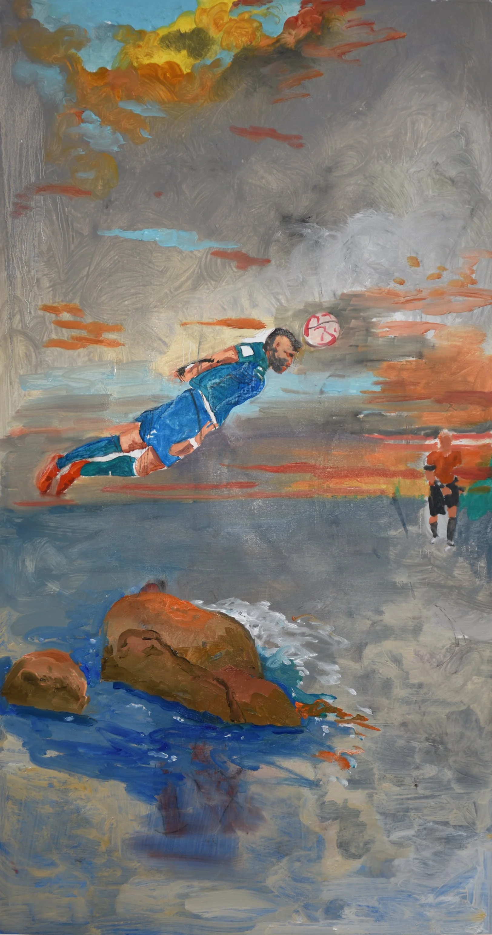 so the world cup soccer player gains new meaning as he flies over the creek at sunset. the referee to the right has thus far survived the transition, and looks on in awe.