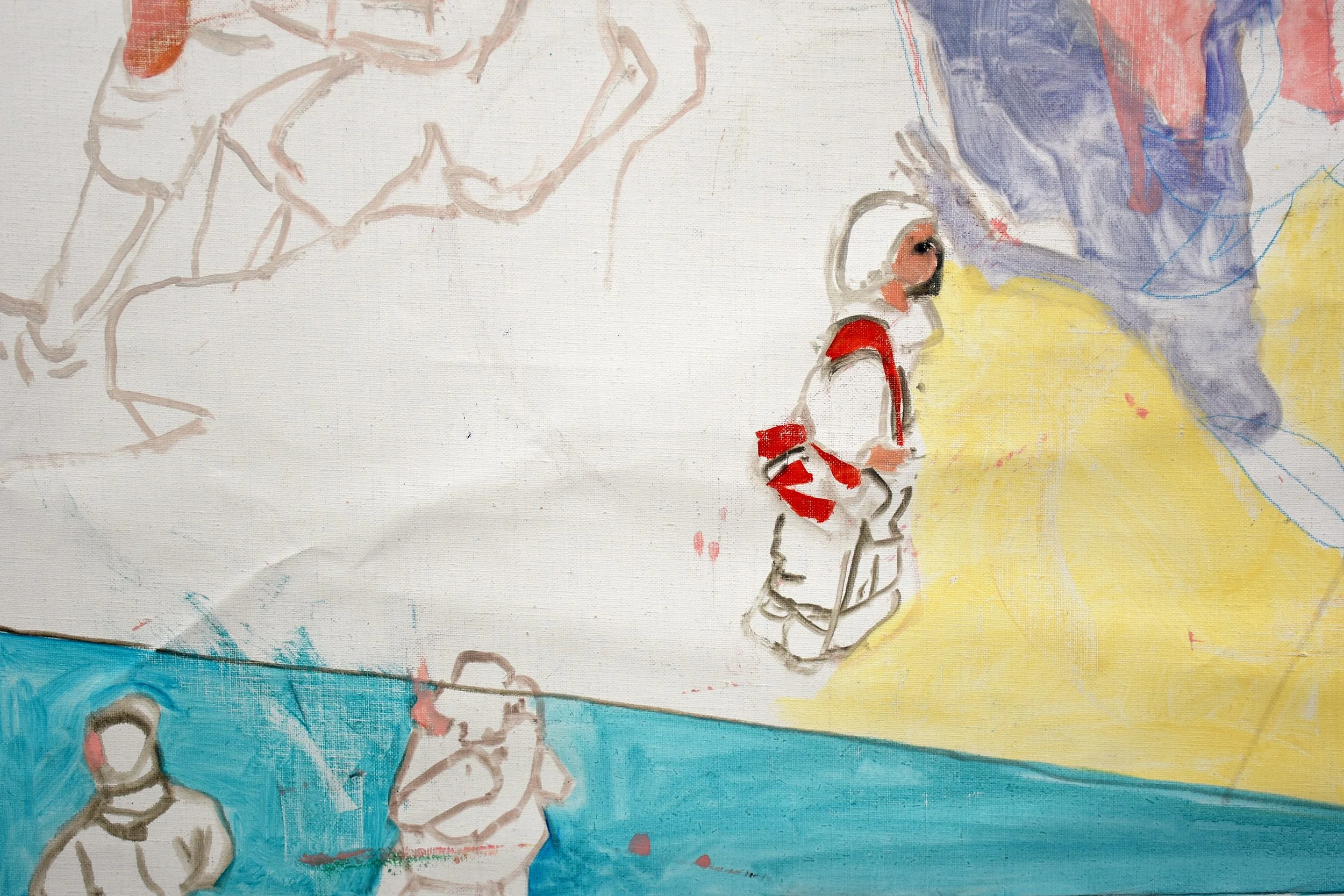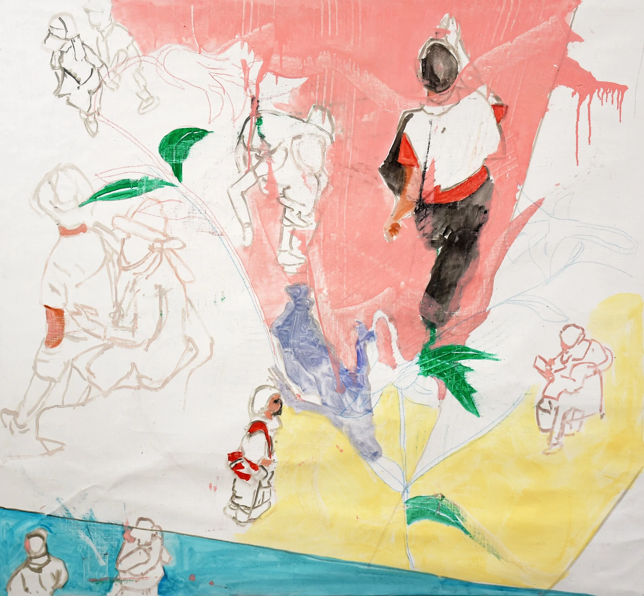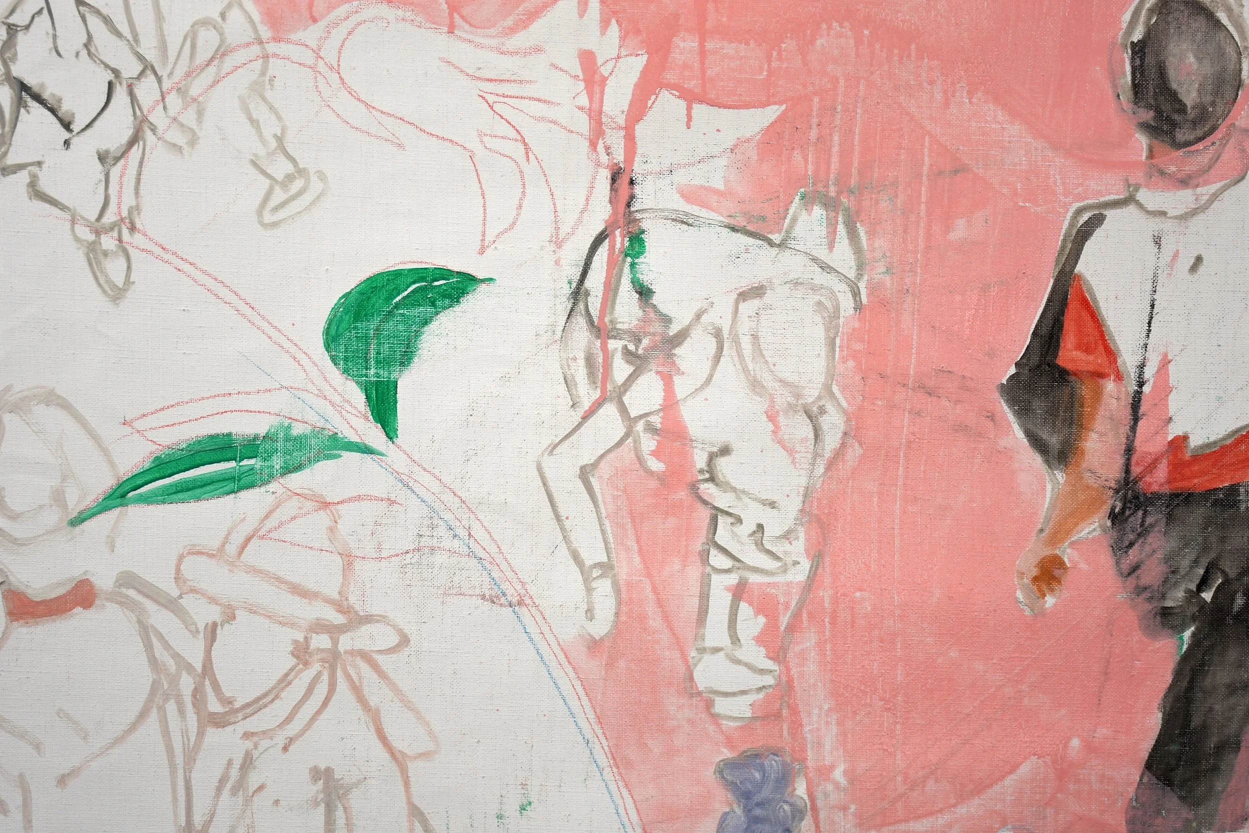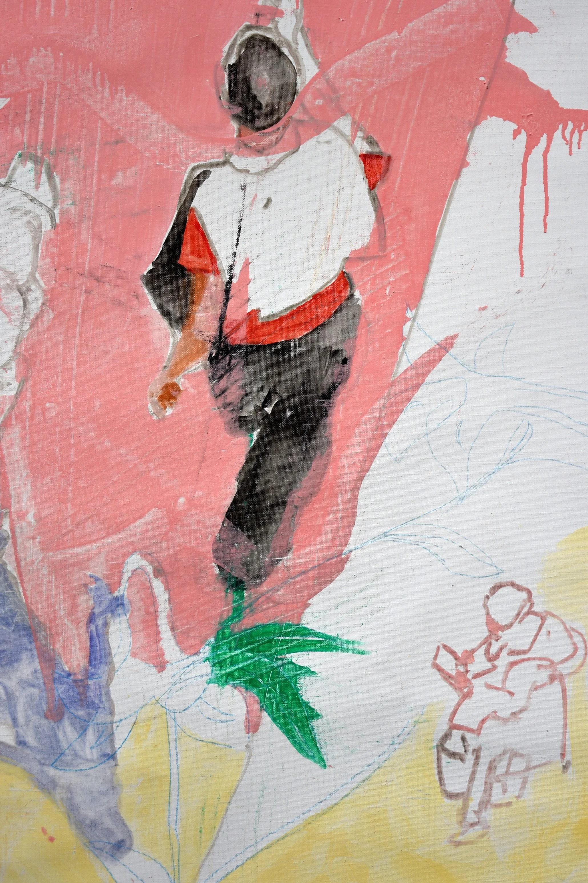 2:21 PM: i took figures from above a bit further today, adding pinks, reds, blues & greens with some pale black., then doing a scrape with one of my larger scraping tools.. it’s too early to know where she’s headed; i’ll pick up where i left off tomorrow, after the 10am Baca Land Trust meeting, which will probably run till noon.