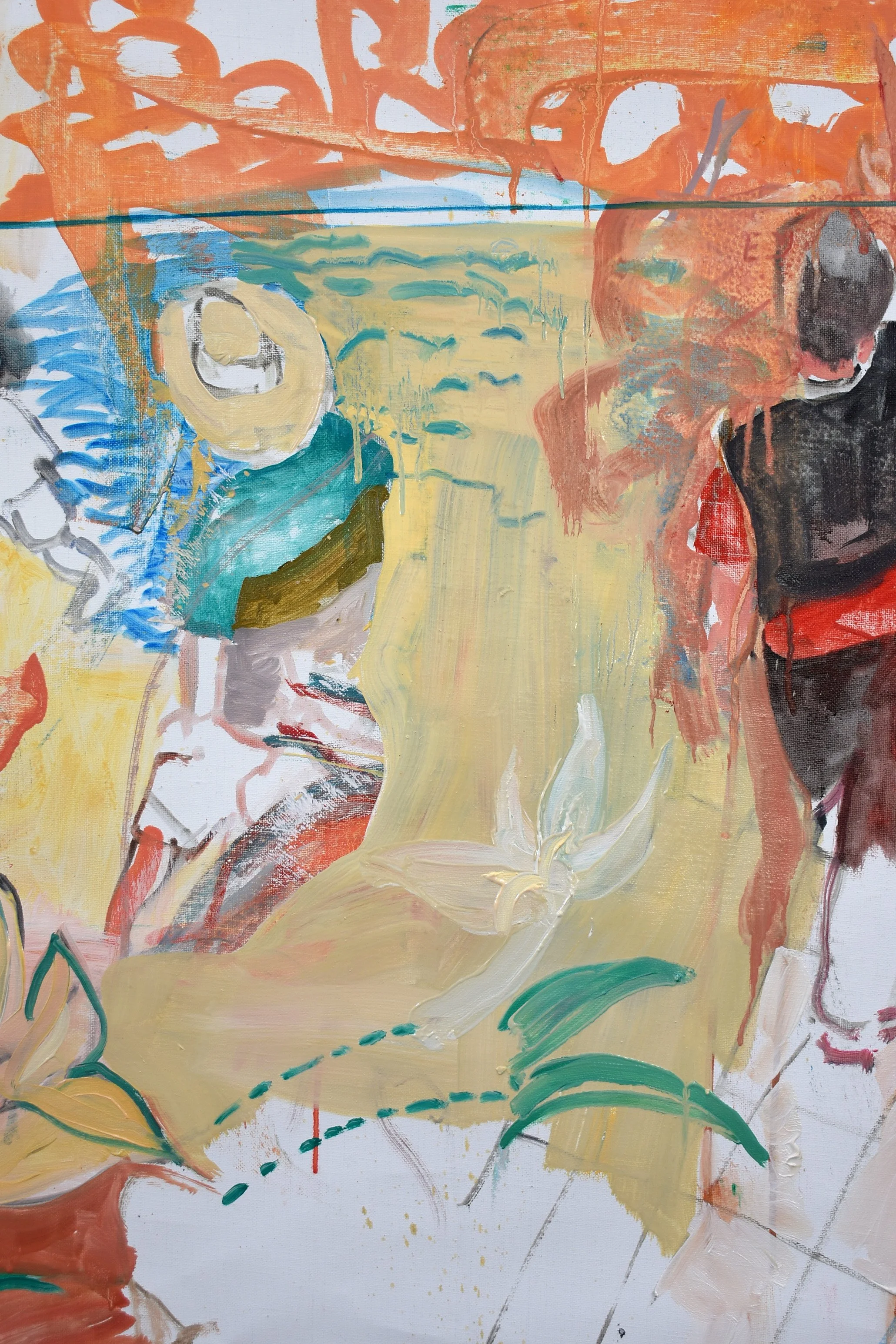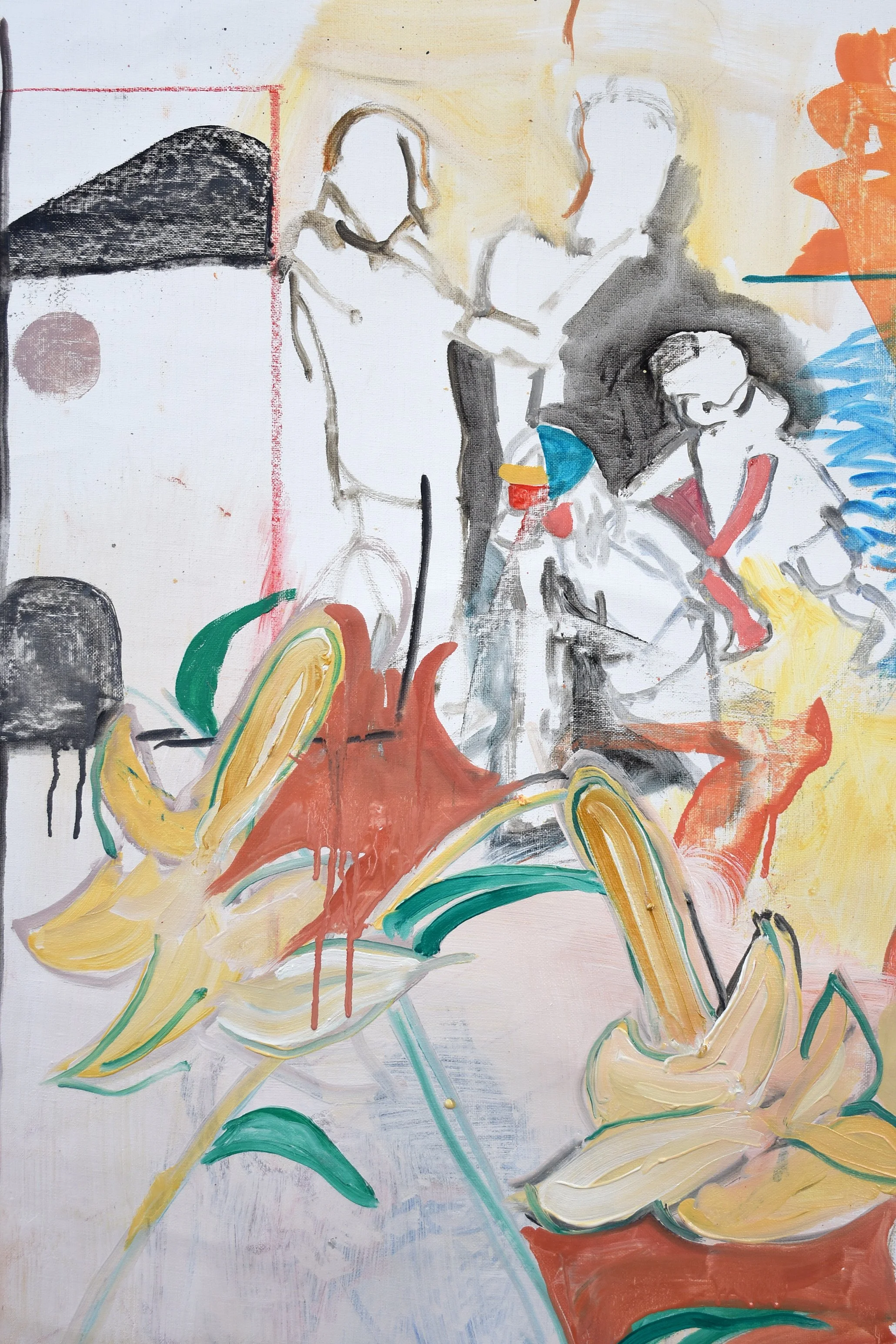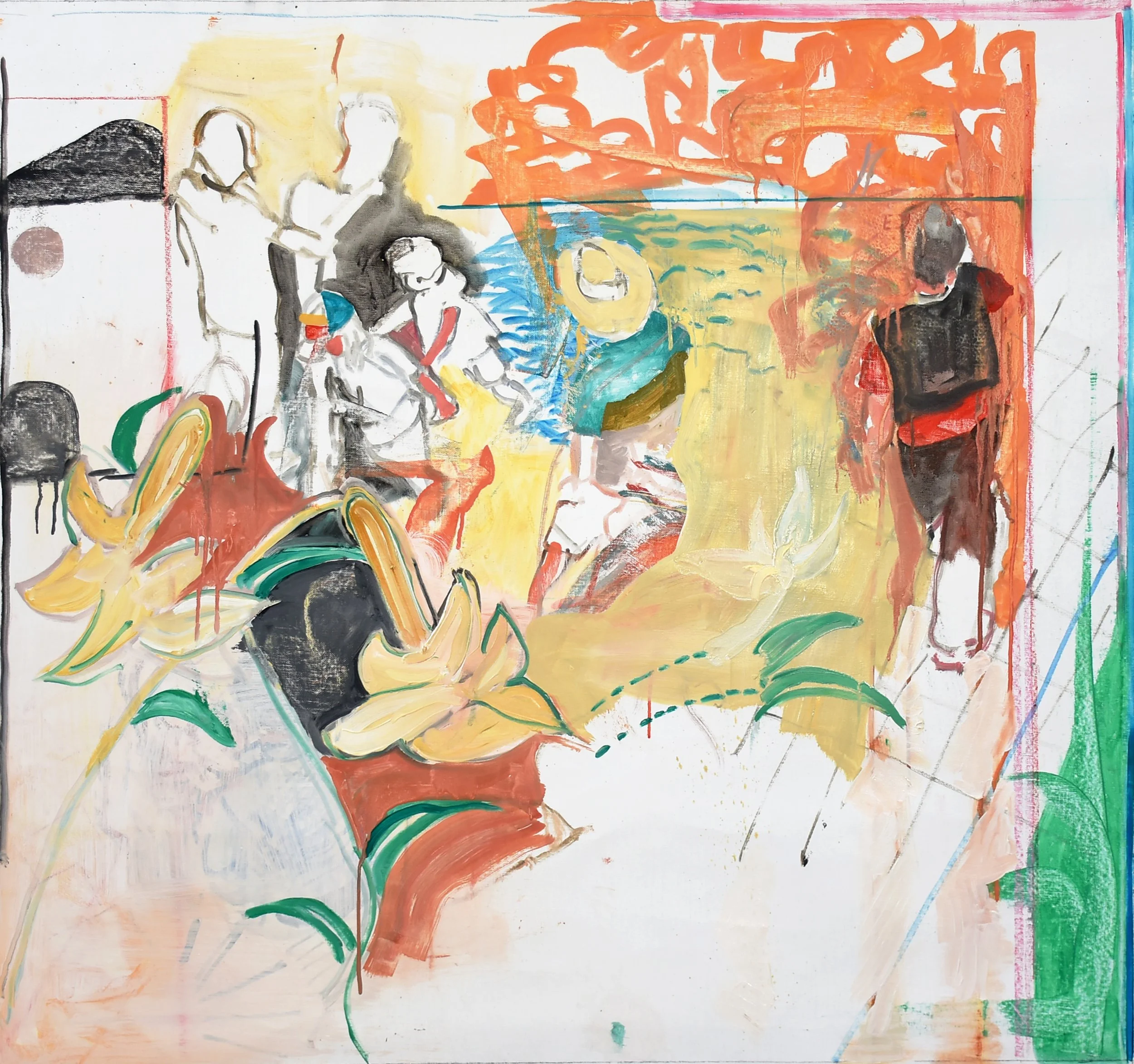 it reveals a delicate balance between abstraction and realism. the figures seen from above, along with the flower patters inspired by 18th C. japanese art, are fast becoming a part of my alphabet. the more i introduce them, the greater certainty i have about how to paint them, so that fewer and fewer brush strokes can communicate everything we need to know.