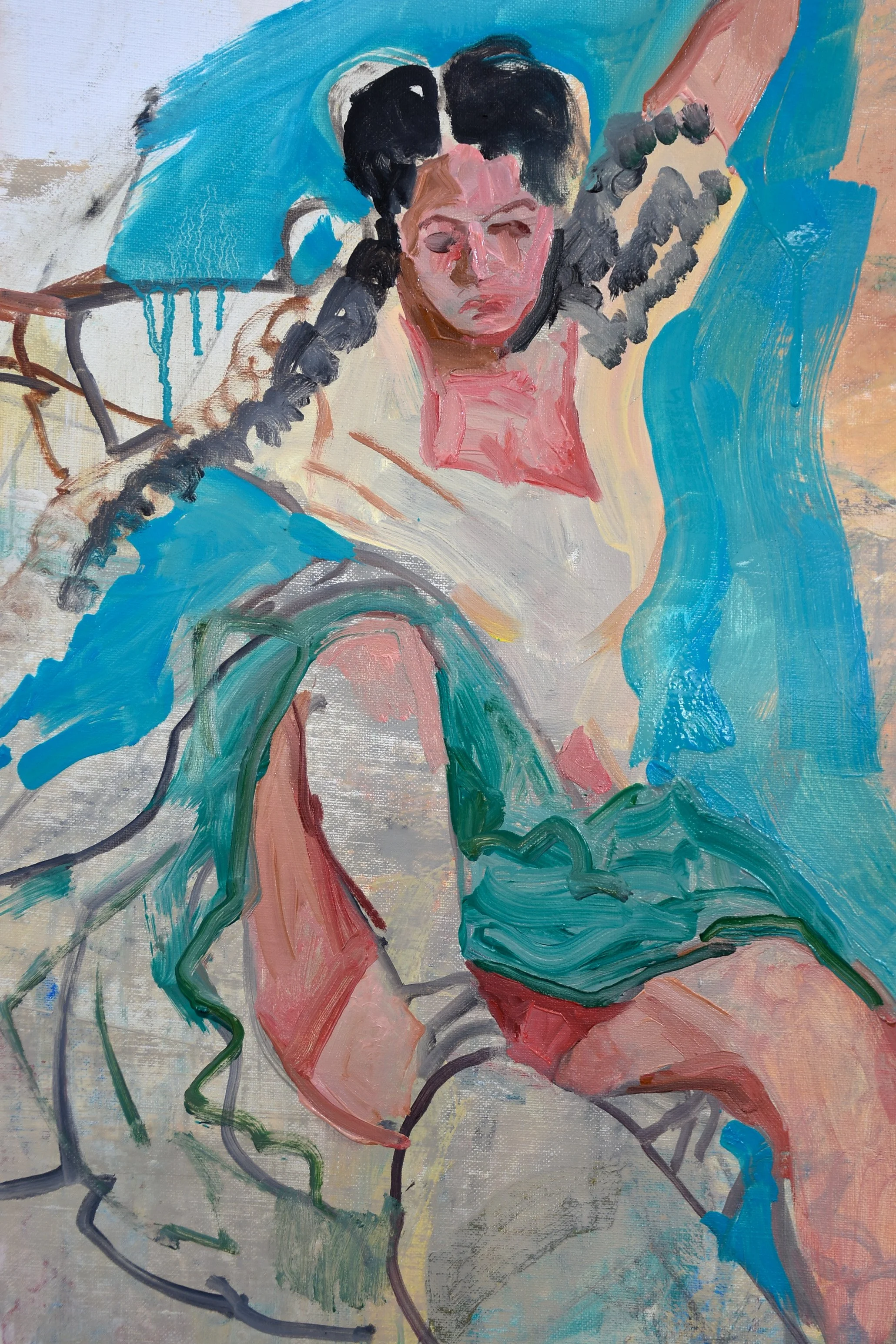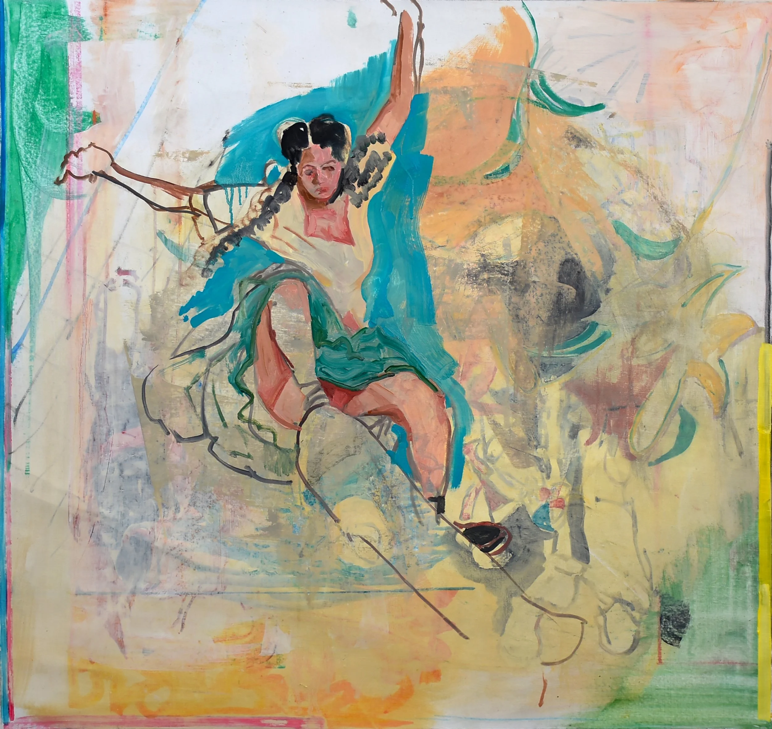 the skateboarder is now the centerpiece. she has appeared in previous paintings, including a couple of goaches on paper.