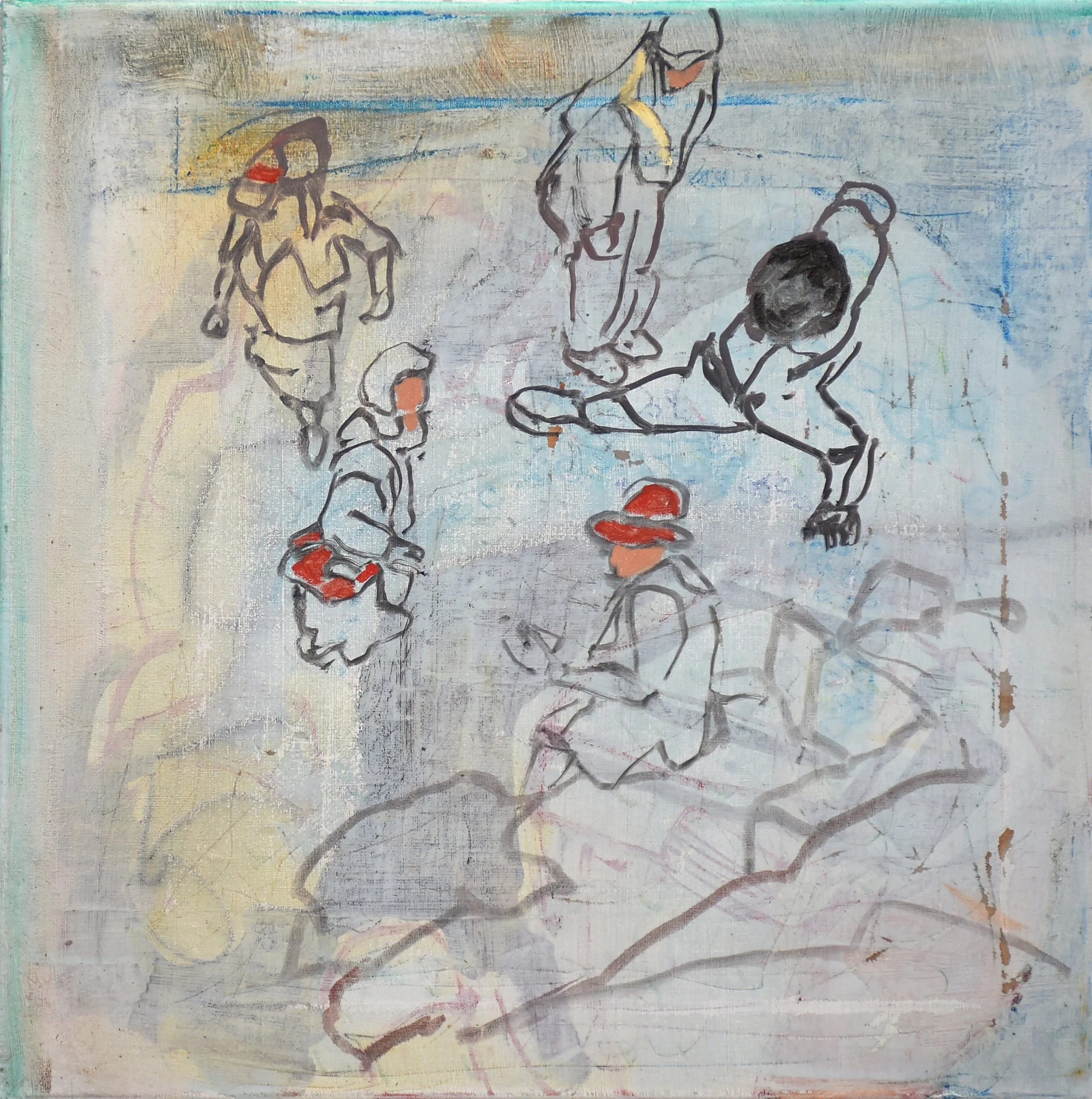 12:01 PM: this morning i worked on a new painting titled walkabout, 16x16” which is painted over a previous piece i found in my storage space, date and subject unknown.