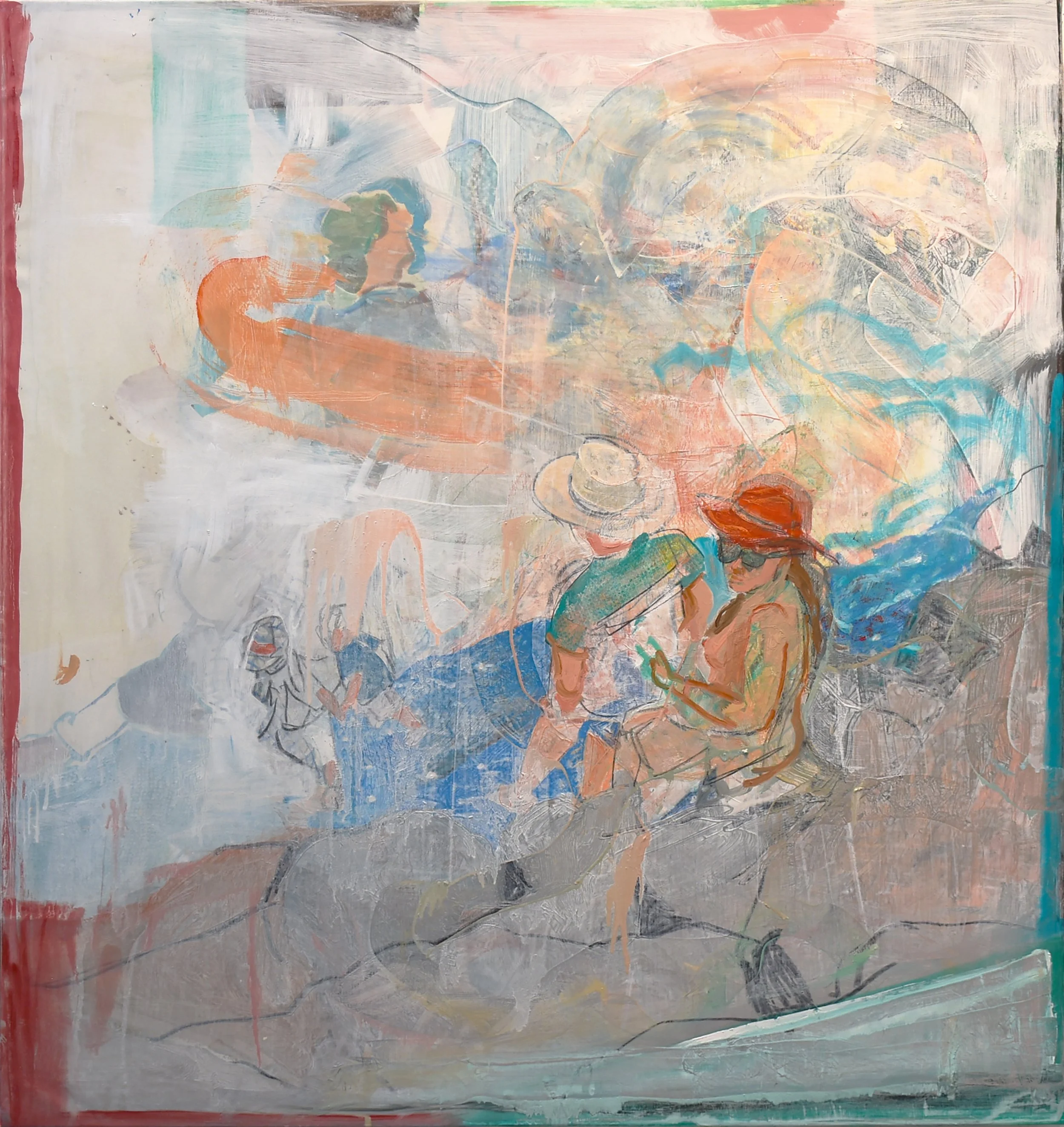 the swirl of strokes above, and the ghost images of previous versions add mystery to the painting as a whole. the newly added blue wavy lines to the right of the figure give us a hint that the female figure and her husband are overlooking the water; in this case, the river running through alamosa.