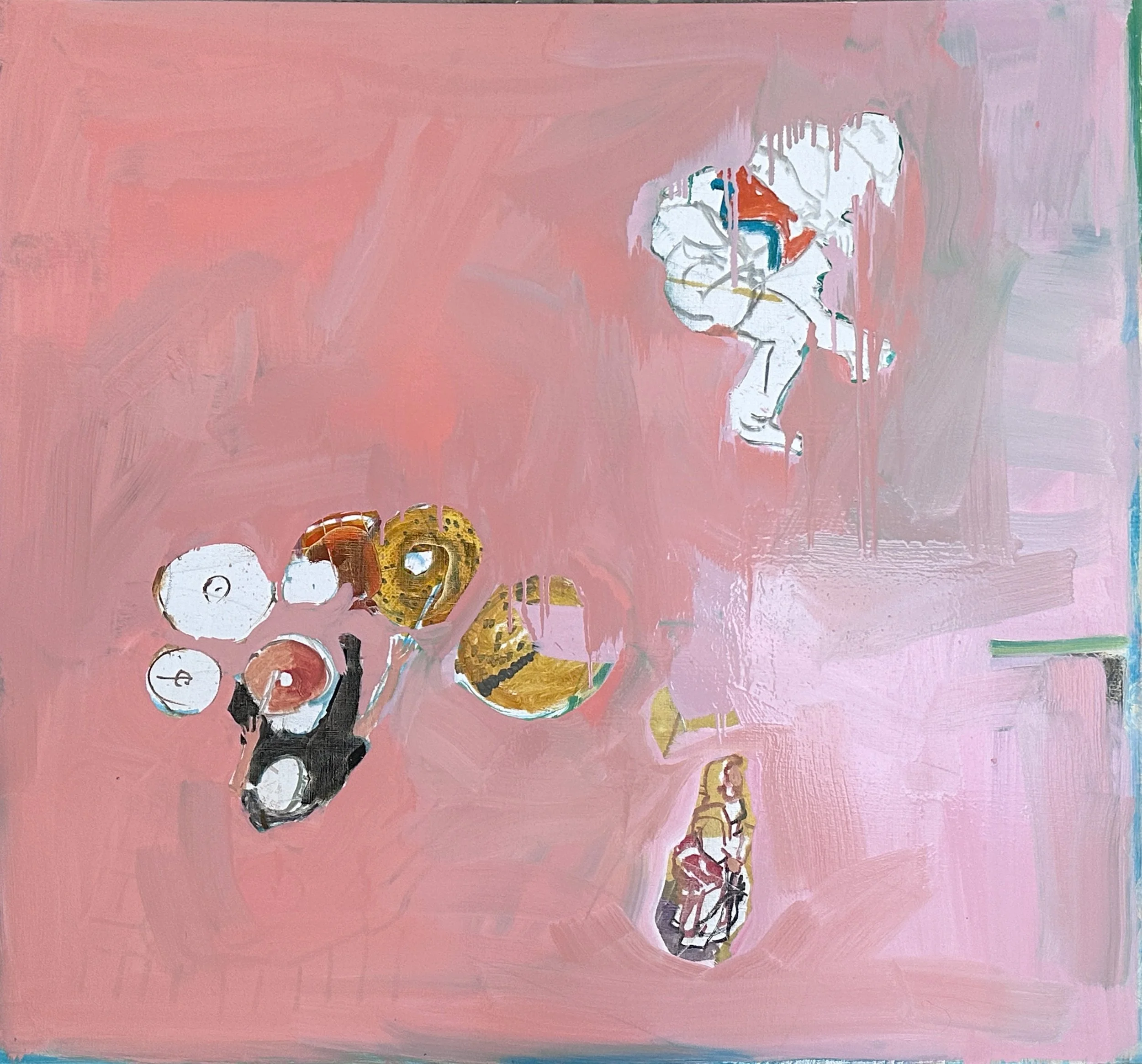 my first move was to mix up some pink oils in an old yoghurt container, consisting of titanium zinc white and two different reds. i applied it with one of my medium wide brushes, going around the figures i wanted to keep and painting over the ones i didn’t. yesterdays paint was, for the most part, dry enough to be able to pull that off without too much schmiring.