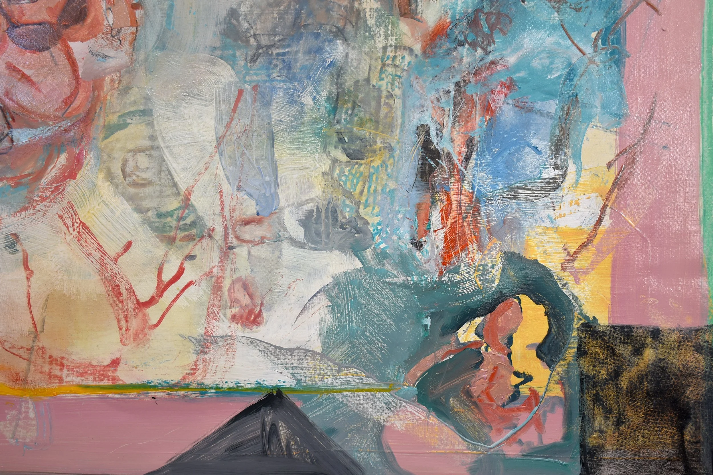 12:24 PM: didn’t think i’d be in my studio today, but here i am! i’m stoping early so i can get to an appointment. lots of scraping & rubbing out has happened. the black i introduced on the lower right is anchoring the composition at the moment, as well as the two female figures i introduced and the geometric areas of pink. tomorrow shouled be a full day of painting.