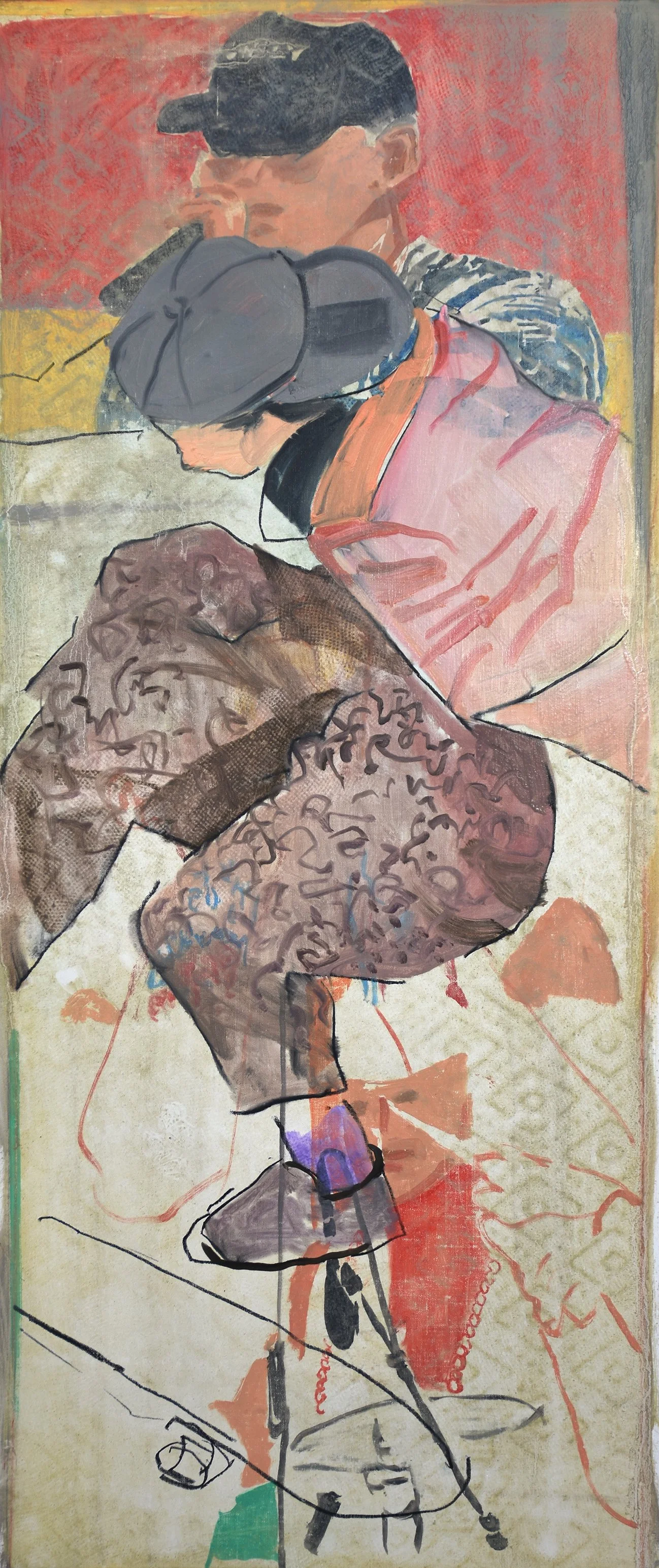 2:48 PM: this morning i dove into tokyo olympics 19, the painting i started yesterday. what i’m calling tarlification took place. what i mean by that is that i lay the painting down on a work table and repeatedly went over it with a wash of greys and ochres, followed by vigerous scrapping, until i got it to a point where it was ready for me to draw & paint into it.. i returned to the image i’ve been using in an number of this series, namely the jumping skateboarder with his grey cap, viiolet socks, pink shirt & brown patterned trousers. what i’m half jokingly tarlification refers to my ever developing porcess of removing a lot of what i know and replacing it with what i don’t know.