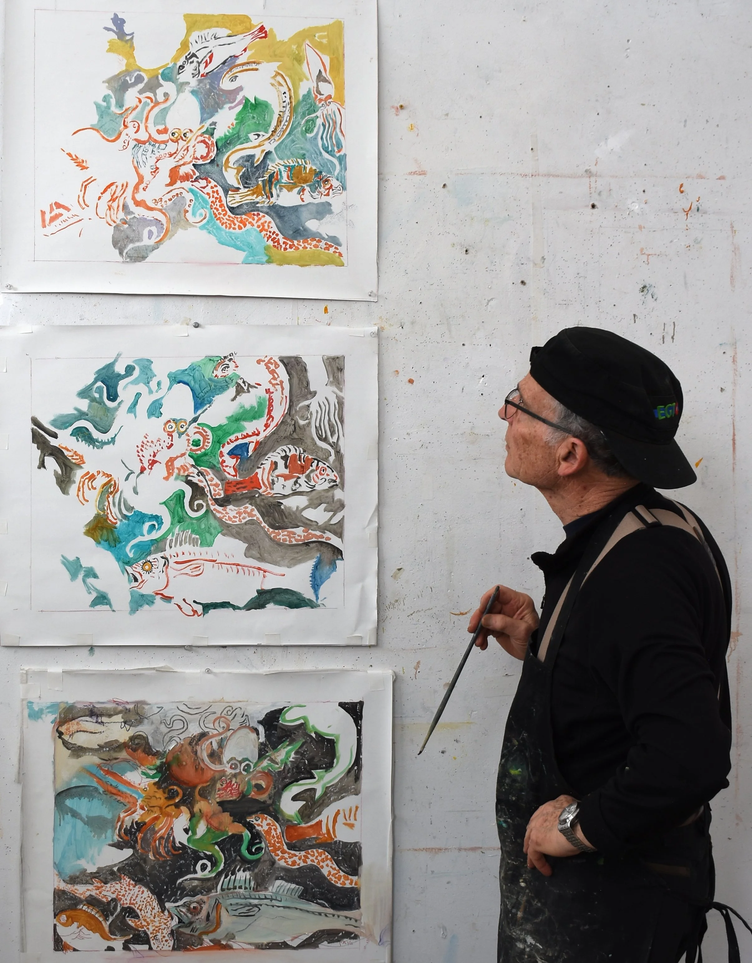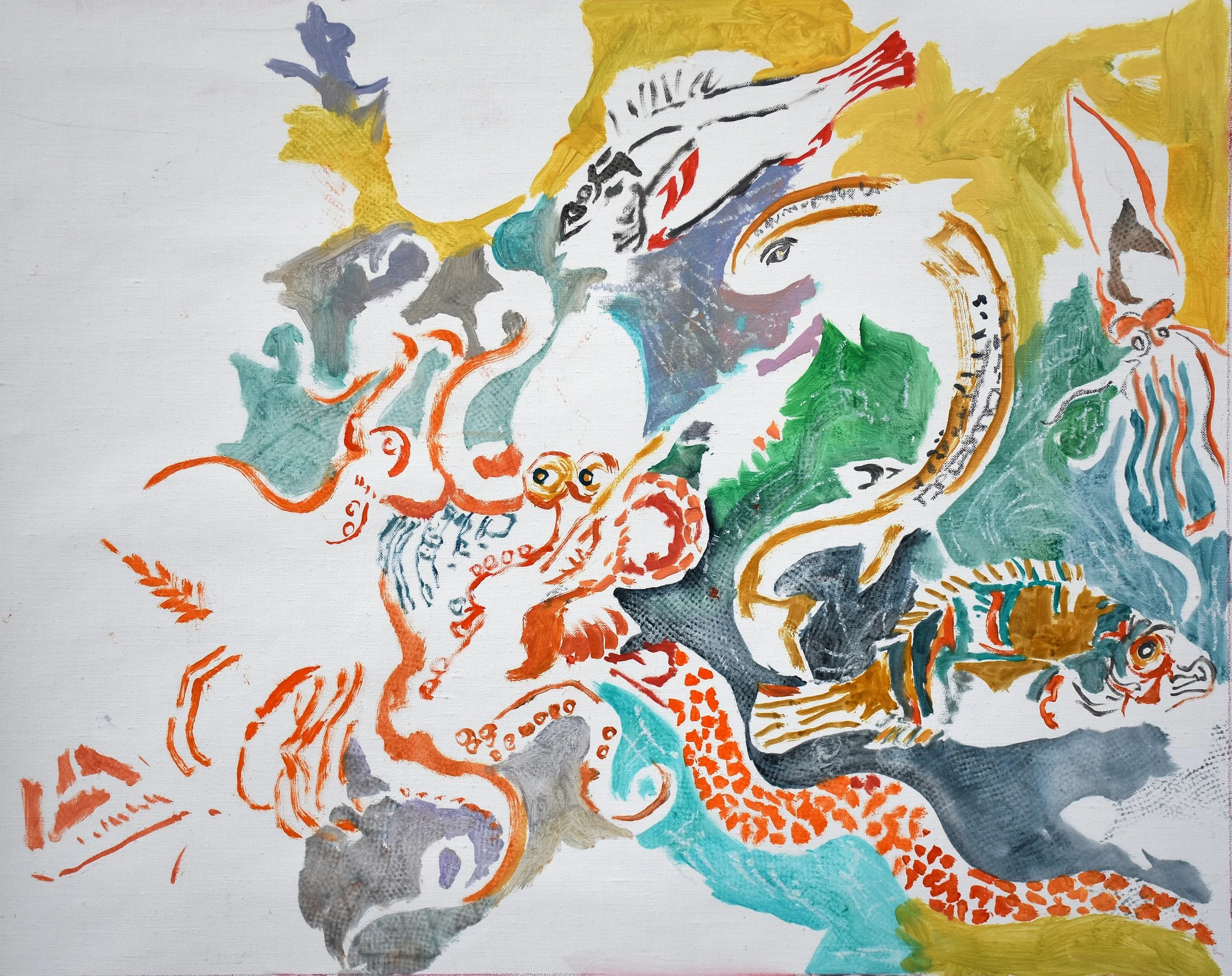 4:03 PM: this afternoon i did something i’ve never done before: i took part in a zoom meeting of our local firewise committee while working on this new painting: sea kinesis III. more about this later this afternoon; right now i have to get back to the house to make rice, as part of the prep for our dinner tonight.