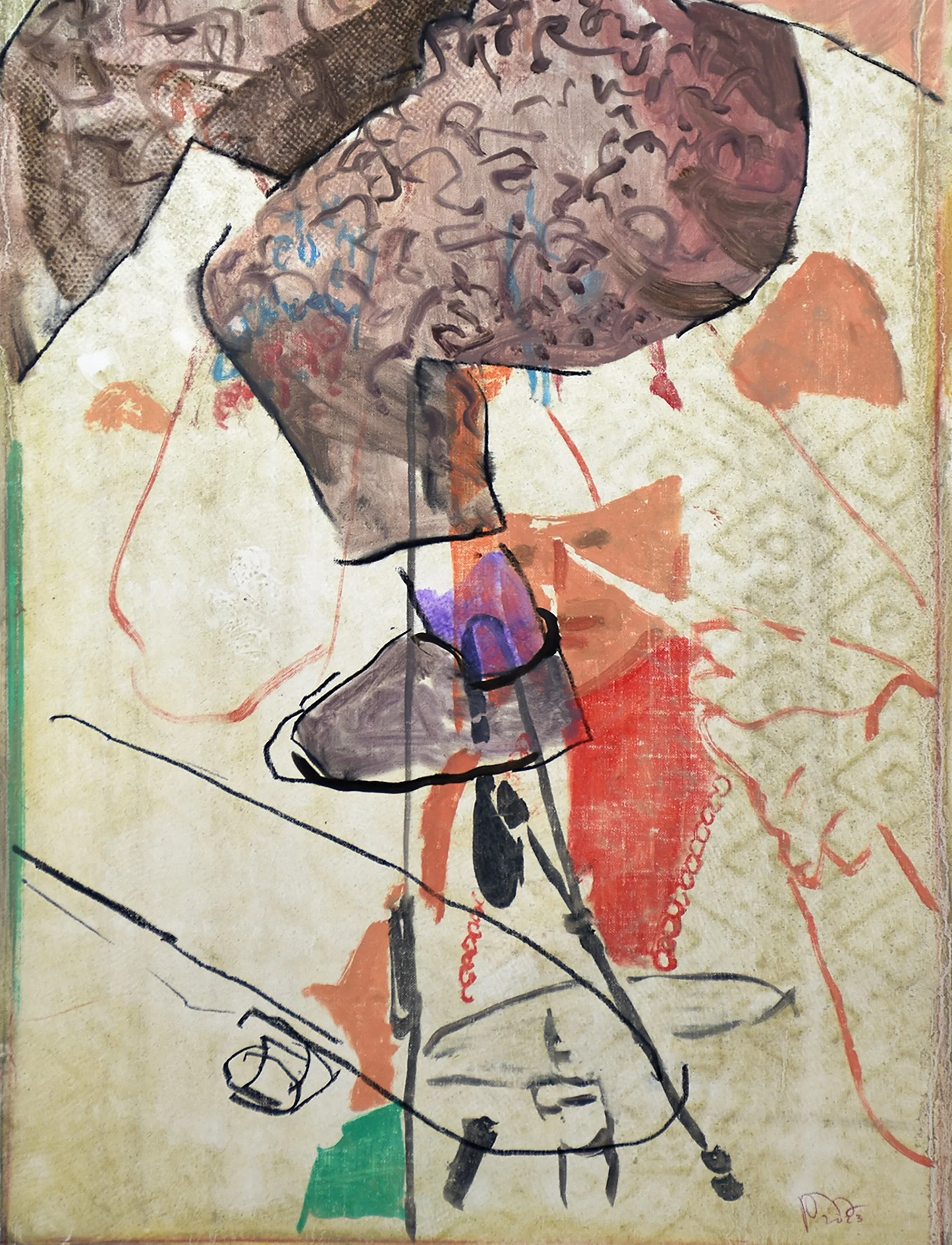BELOW: in the lower half of the composition, his brown trousers with that delicious patterning dominate, what i really love, which once again, as in the upper half, emerged unexpectedly at the last minute, are those marks surrounding his lower leg & foot. without that red & green, the whole thing would fall apart. and the way the skateboard is hinted at is masterful, in all humility!