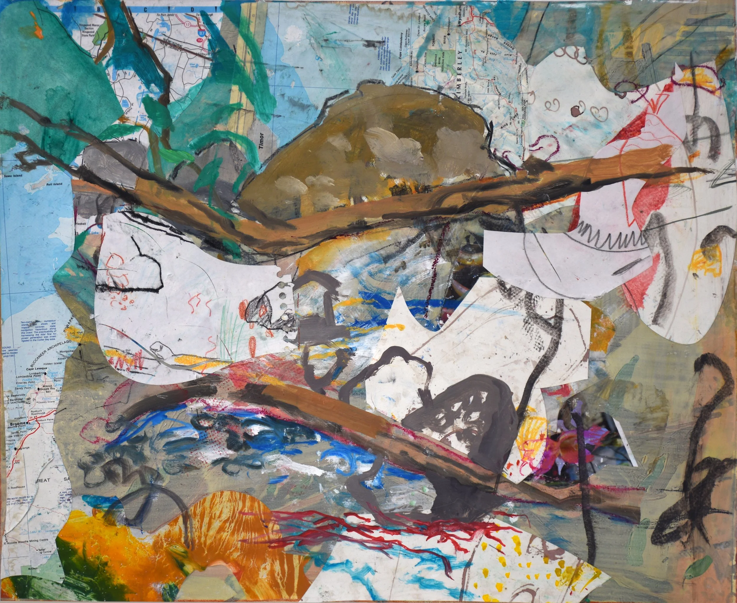 3:10 PM: i collaged the paper i had taped to this painting yesterday afternoon to see whether it worked or not. when i came in this morning, it was clear that the painting improved with the collaged piece, so i proceeded to attach it permanantly. the straight line where the collaged map above the rock at the top of the composition was bothering me, so i broke it up. there are i few other things i’m just now noticing, which i’ll address tomorrow morning.