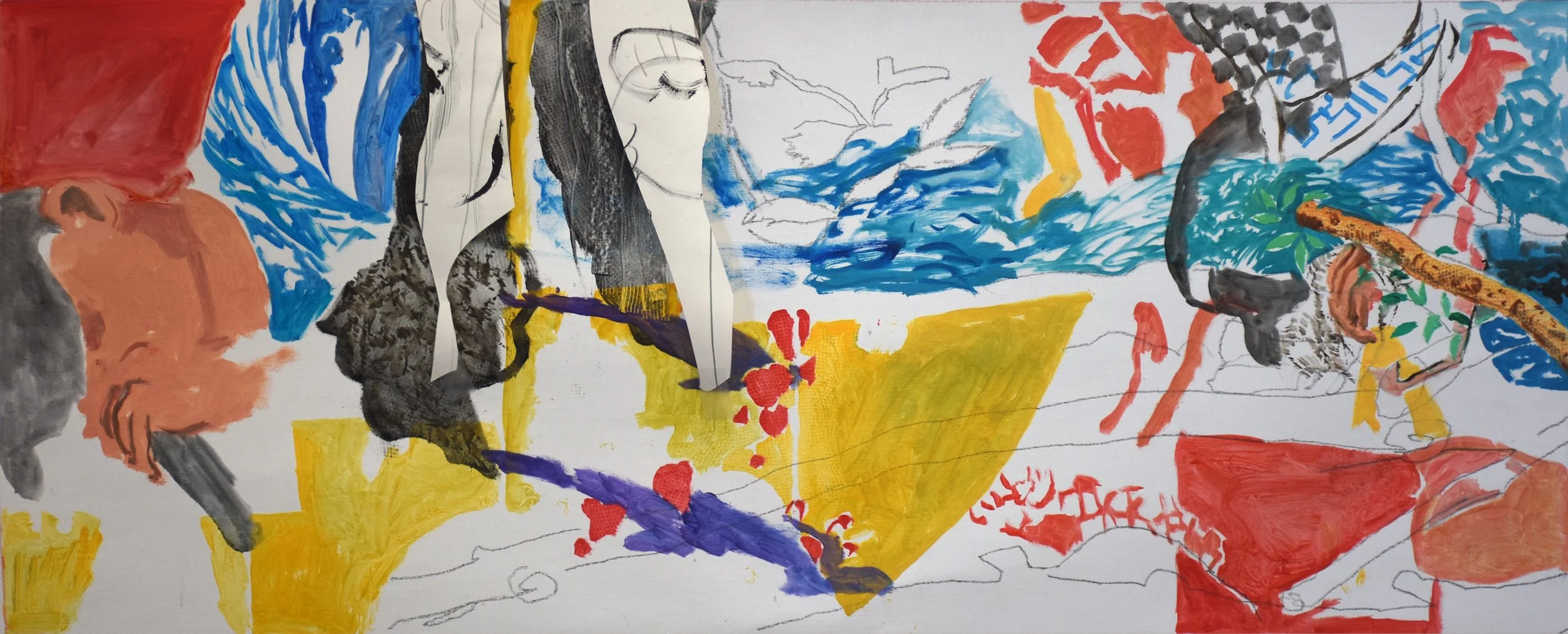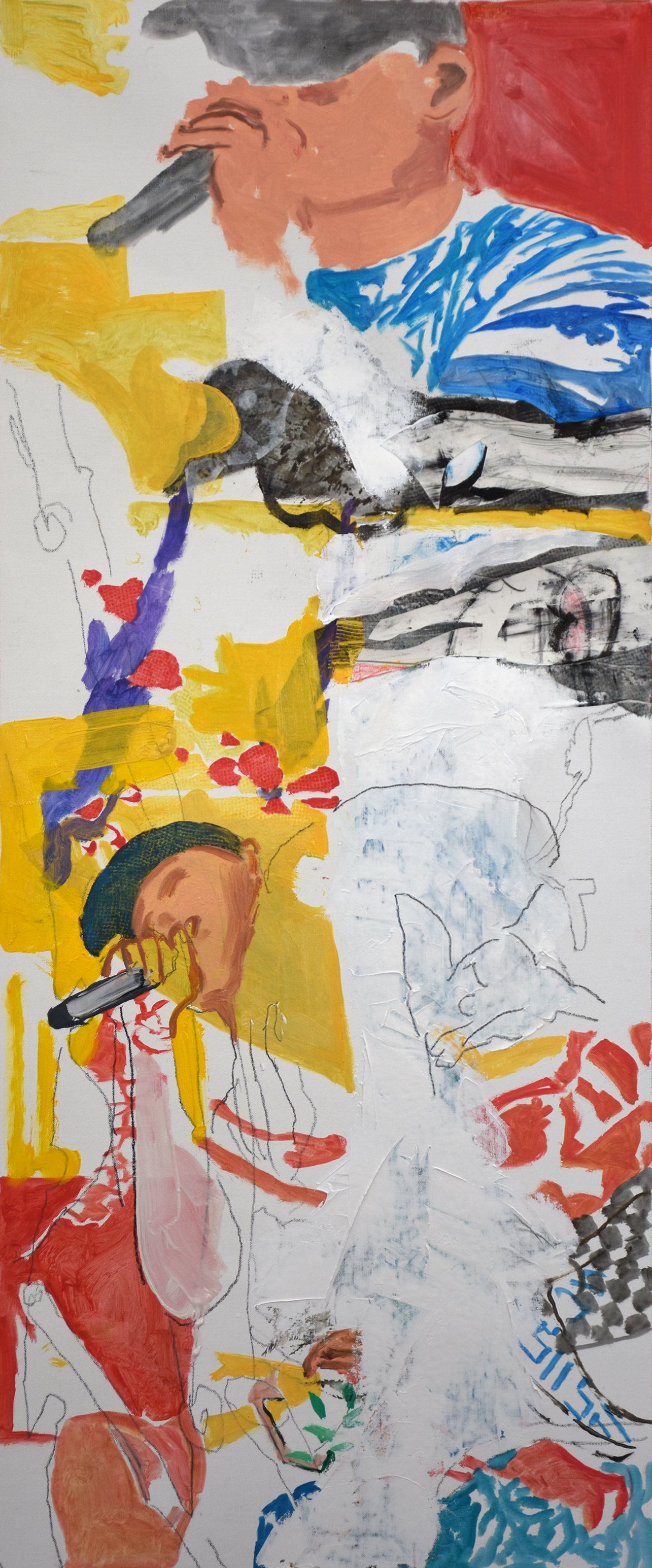 i took out much of the creek related marks, such as the flowing blue-green water and instead added a second singer with mike on the middle left portion of the composition. i also painted over most of the blacks, which were detracting from what has become a rather delicate composition. the reds & yellows carry the day now, with the only blue being the patterning on the shirt of the singer at the top, with a small blue accent of color remaining at the bottom right.