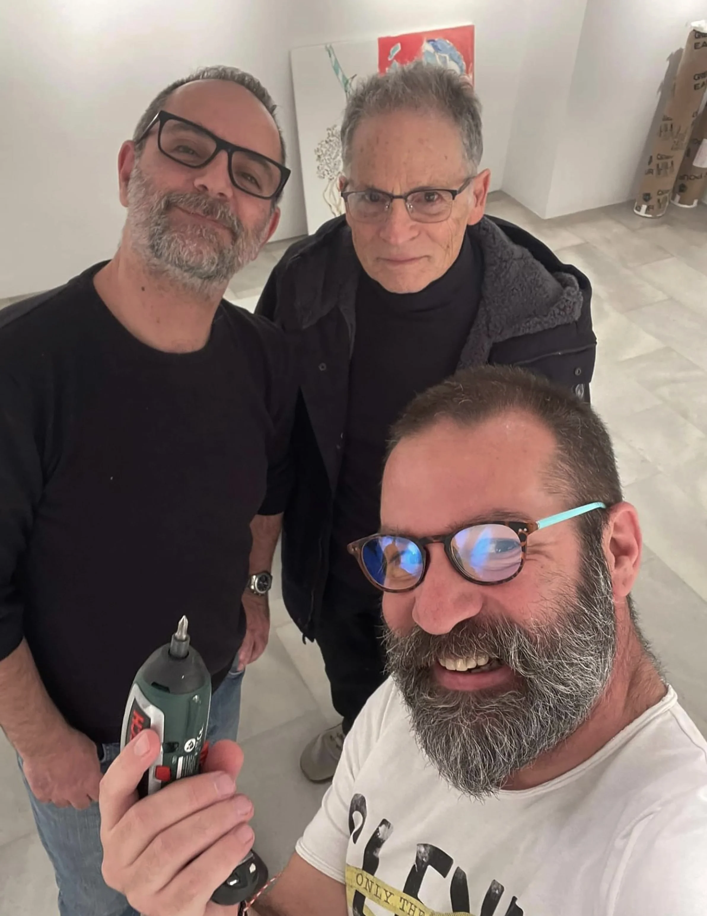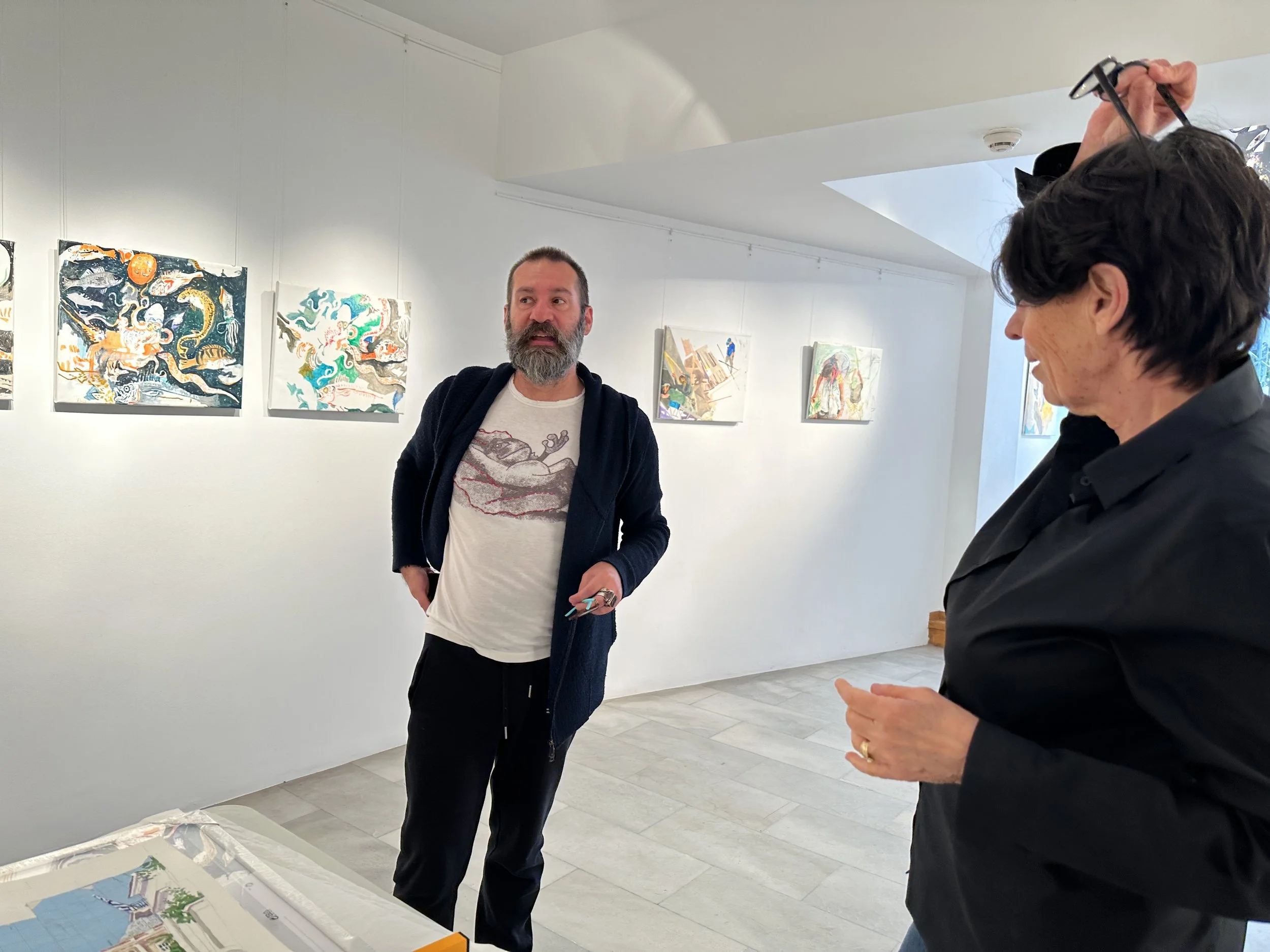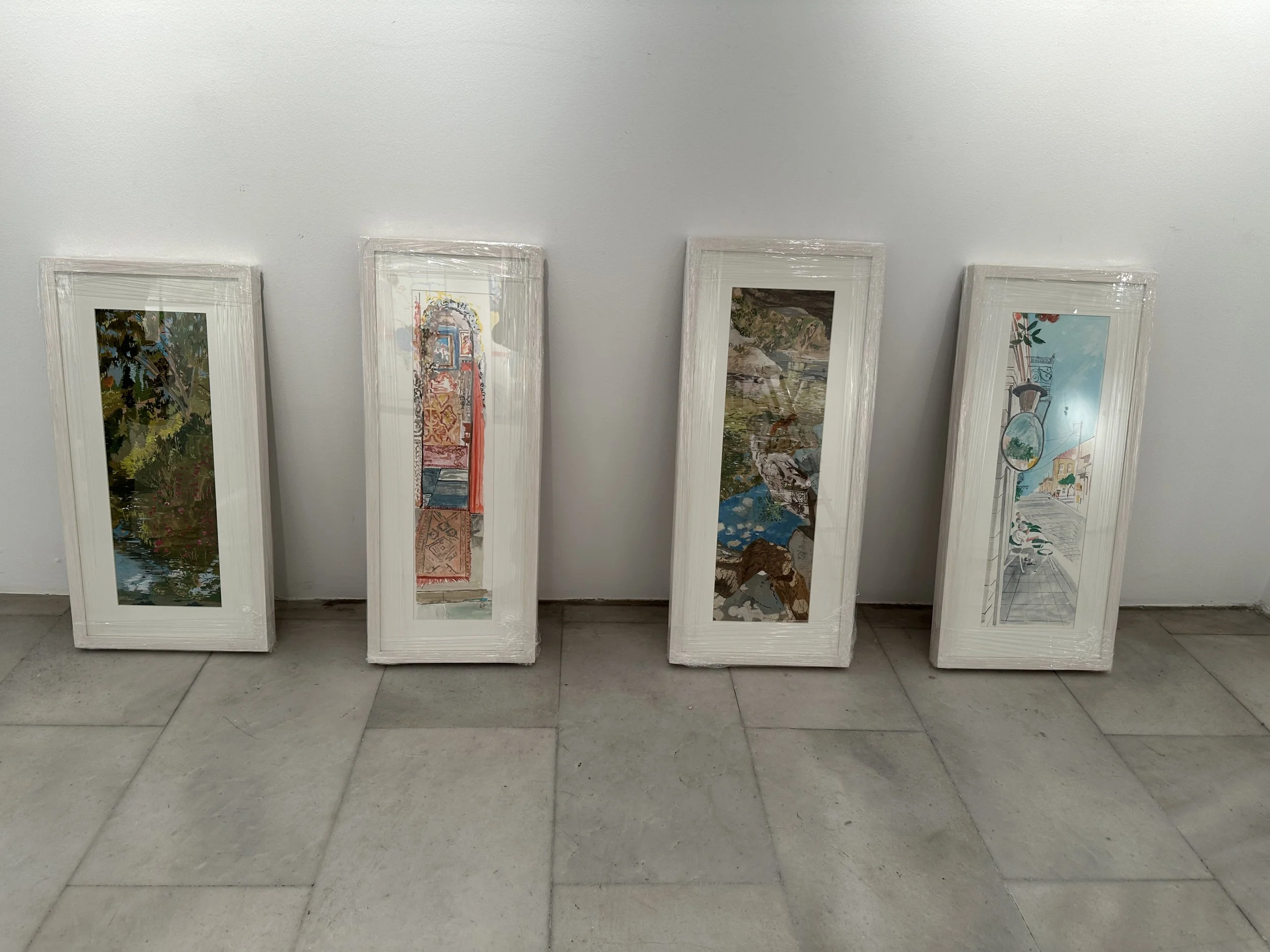 the oil paintings were stretched yesterday, thanks to the help of a local artist friend of the gallery director, yiorgos. and the watercolor/gouache collages have all been framed under glass.