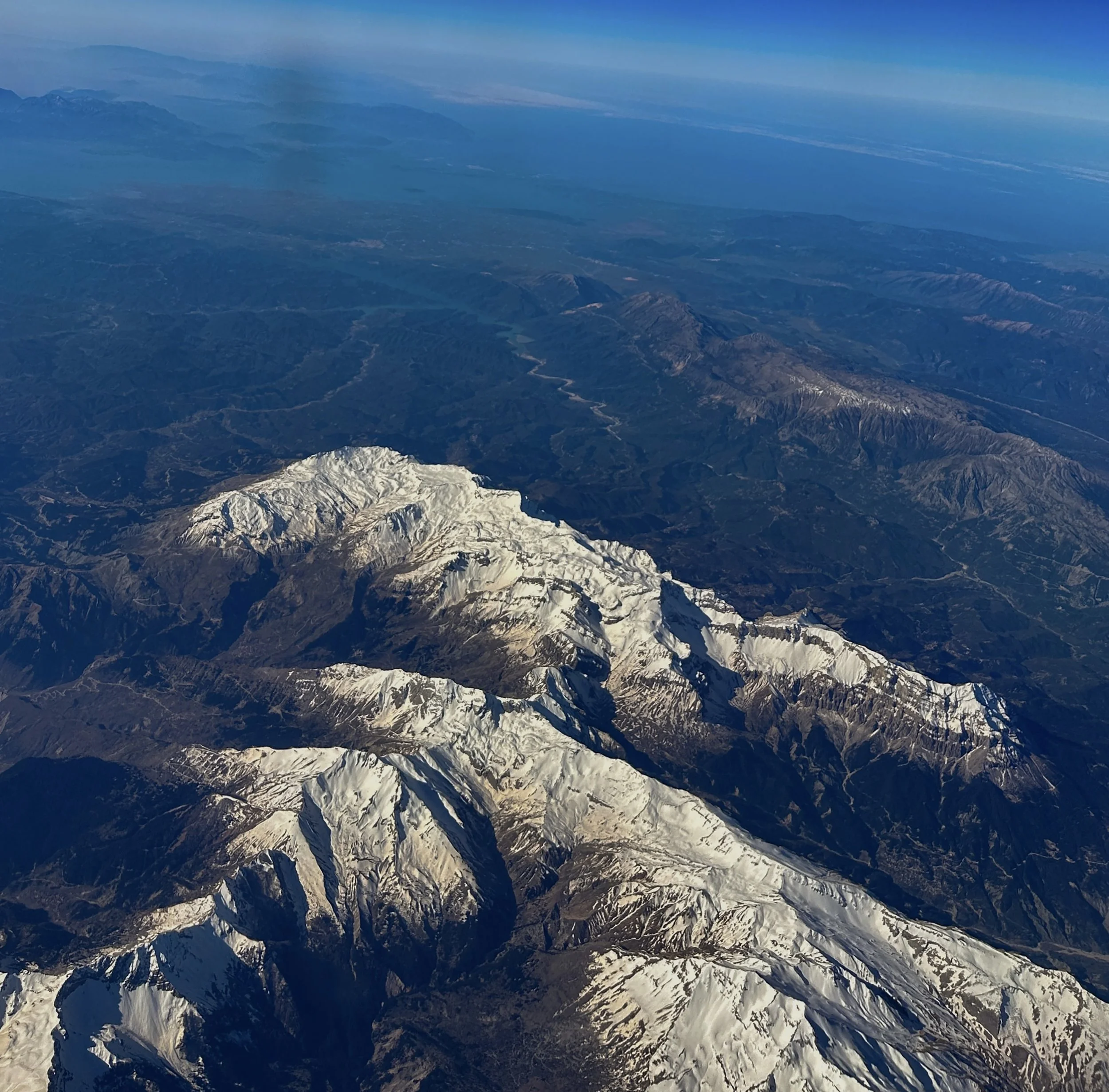 during our flight over the alps, i shot this photo. they’re snow covered, but barely, reflecting the general absence of moisture. to me they look like two huge dragons!