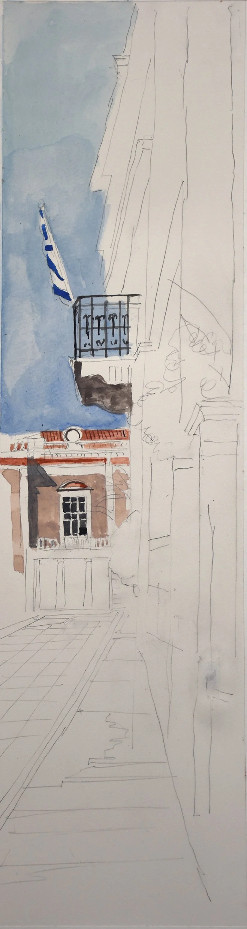 this one is based on a photo collage i made in the pre-digital era, looking down the main, marble paved street in chora, andros towards a stunning neoclassical structure, which had nbeen in disrepair and was renovated not long before a shot my photos. another neoclassical structure; the library, frames the image on the right.