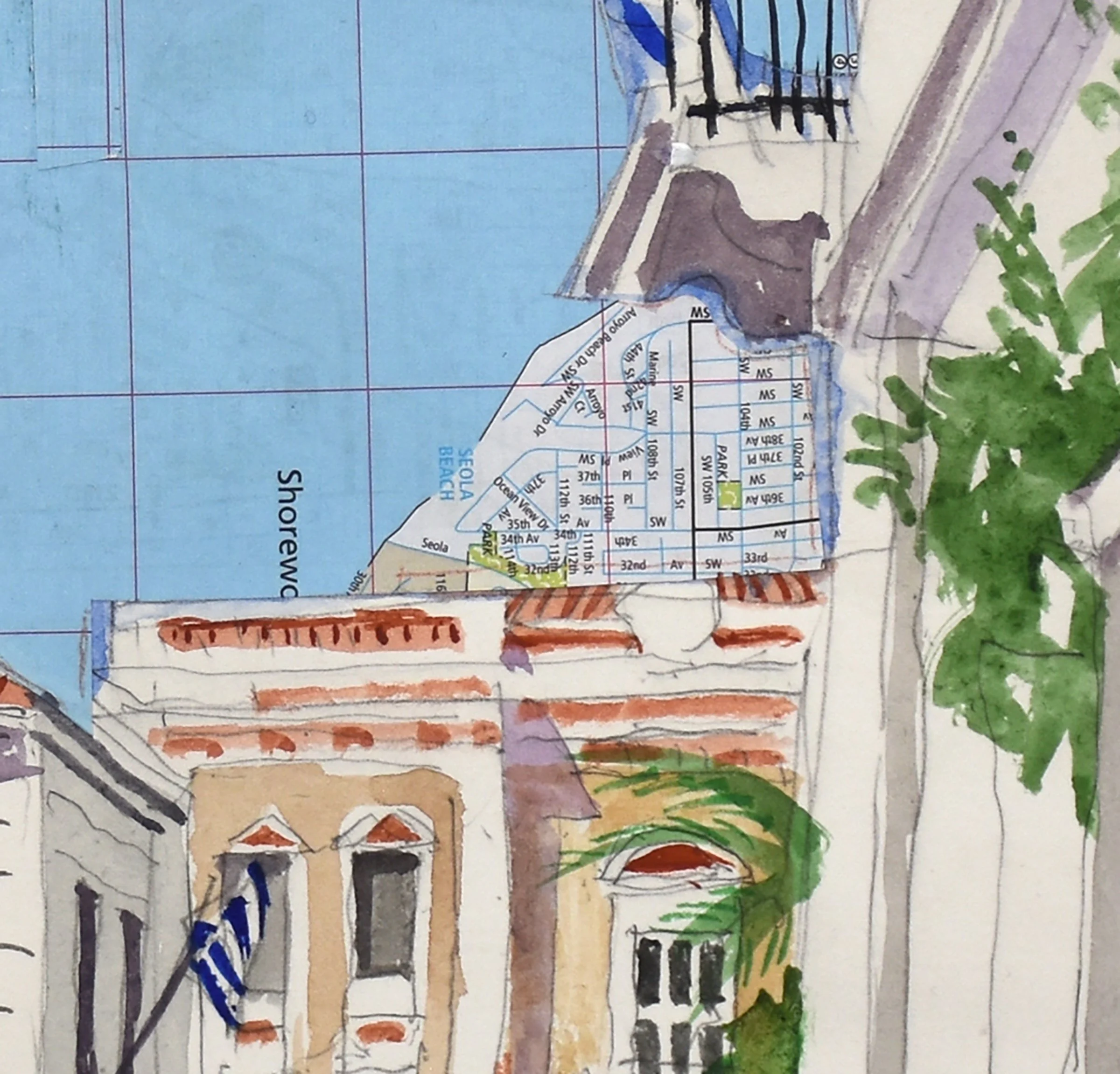 this allowed me to depart from the boring rectagle. then, as i began painting the sky, i found that too boring & predictable as well, so i cut a piece of a map of seattle into a shape that circumvented the outlines of the neoclassical structures, with a few bits that are not blue as a reminder that we’re looking at a composition, not a picture of chora.
