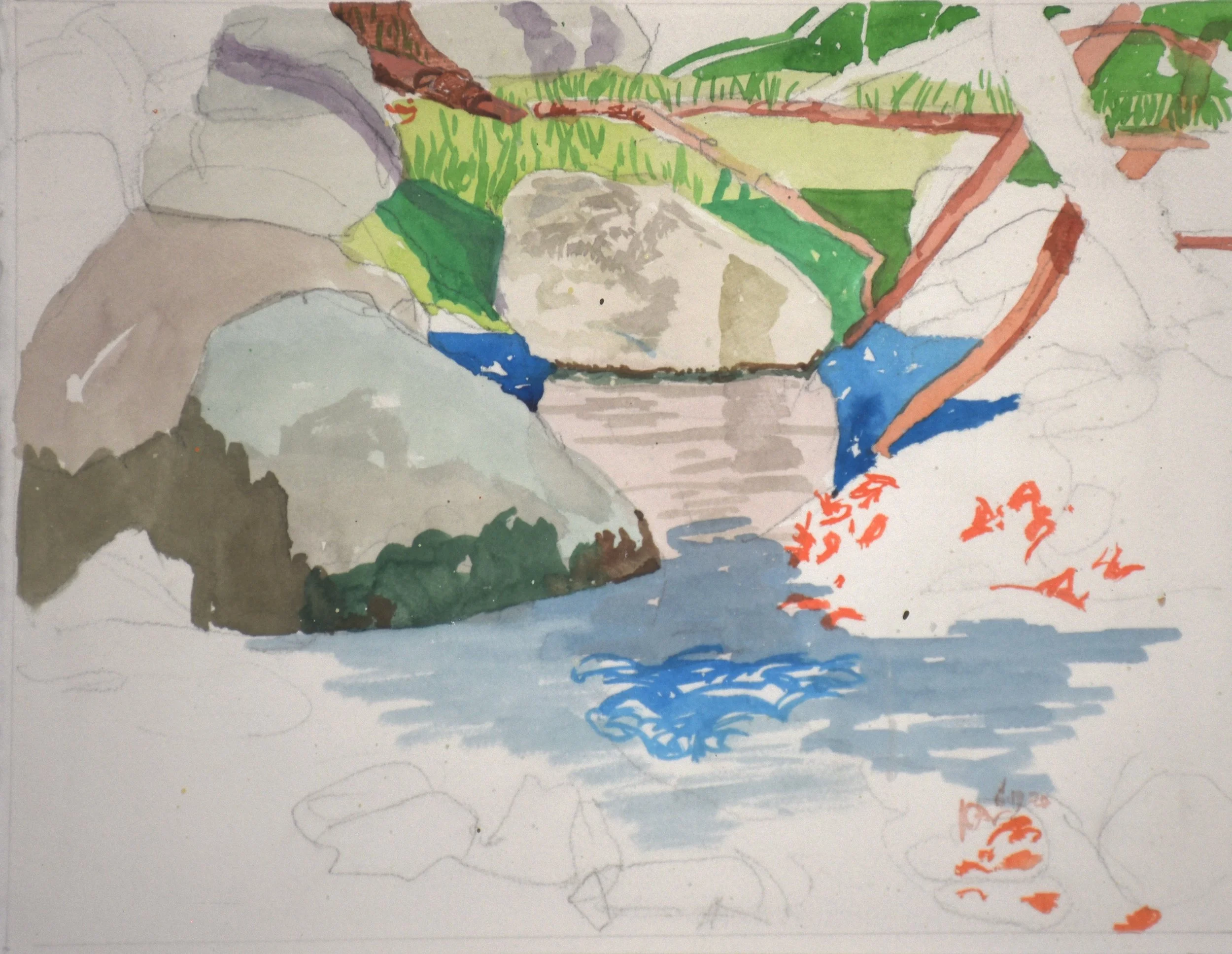 5:21 PM: this morning i was reading about archile gorky and somehow that led me to look critically at the 4 watercolors i just made in relation to some of the rest of my work hanging on the studio walls.