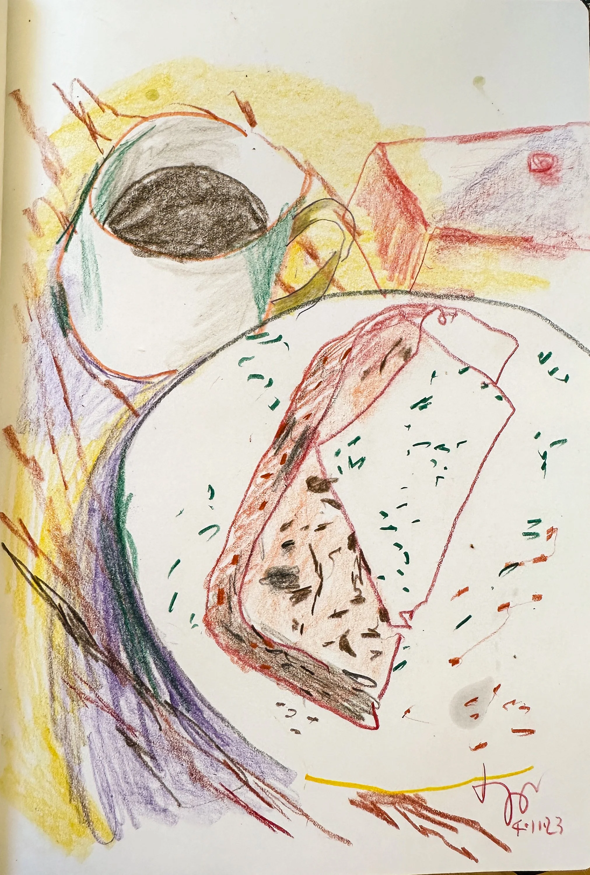 10:08 AM: a little while ago i had my morning coffee followed by matcha tea, with toast & feta. i made a little drawing of what i was eating & drinking, which you see here.