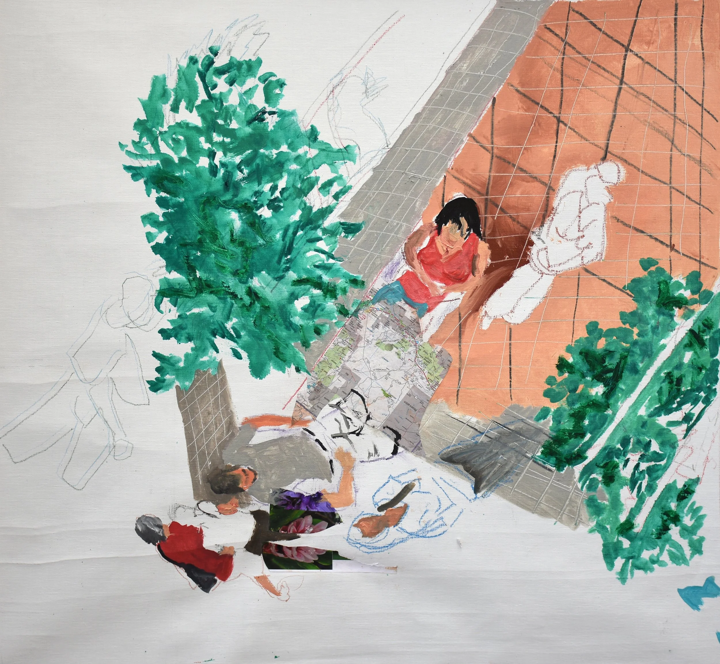 3:01 PM: at about noon i began work on the next stage of good doc IV, which has changed titles and is now skoufa. the trees are more developed as well as the figures, who were inspired by photos i shot about a decade ago from a balcony on skoufa street in athens, adjacent to kolonaki square. compositionally, it’s in alignment with paintings i’ve made fairly recently, especially my anschutz from above series, which you can locate if you click on the SERIES tab in the menu bar & scroll down.
