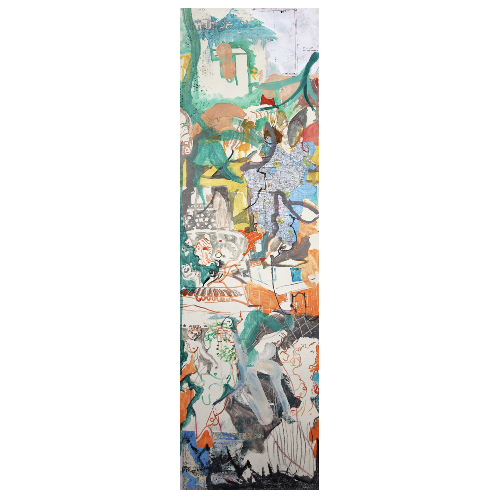 this morning i stretched benaki vista on the stretcher bars i ordered for it. then i dove back in to periscope, collaging some pieces of a seattle map and a few other pieces of paper with a sketch of the painting’s dimensions.