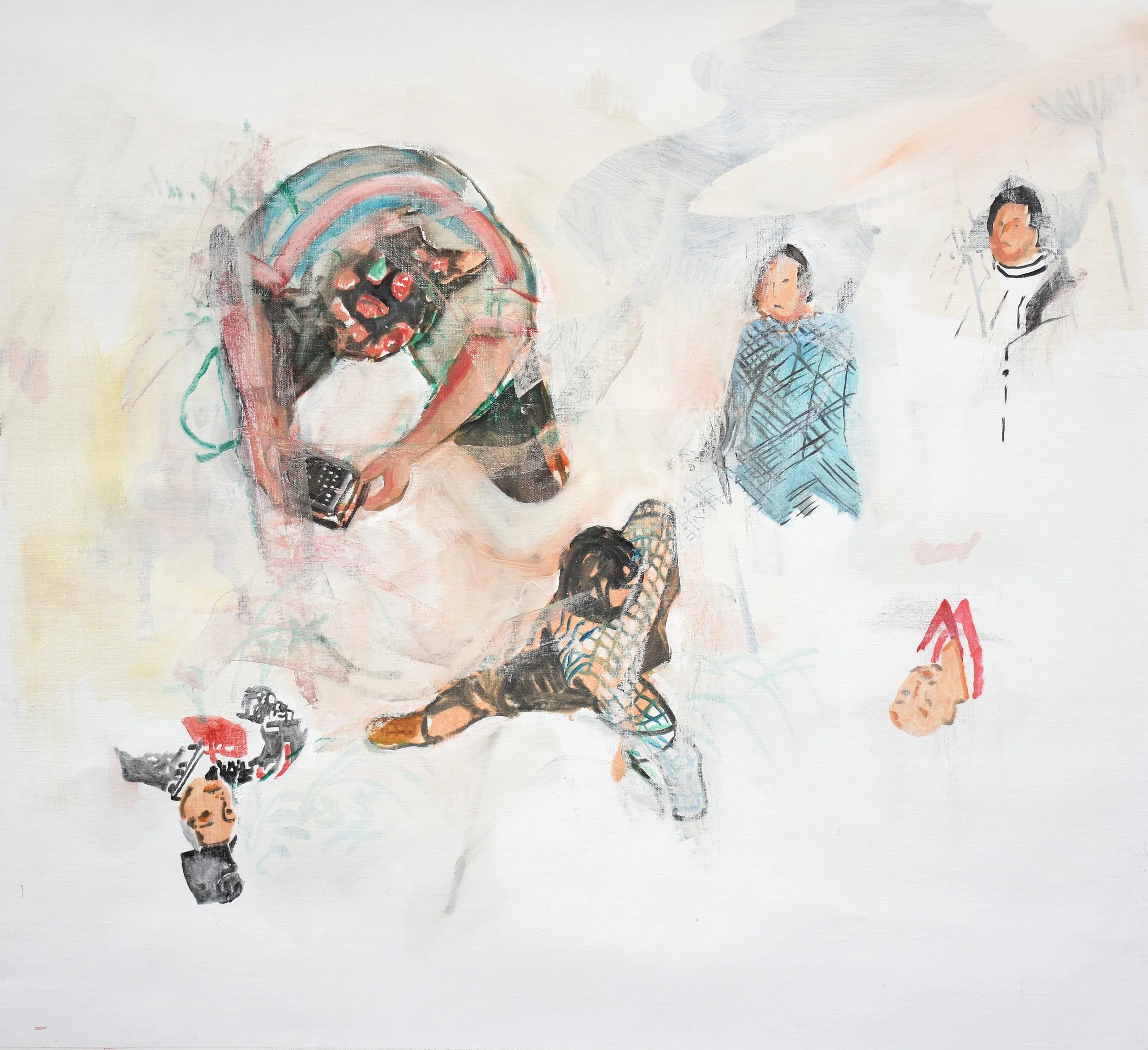 1:09 PM: when i first entered my studio today & glanced t jazz 6, the upside down head on the lower right seemed a tad too bright. so i toned it down with some white, which i then scraped over, and she’s done !