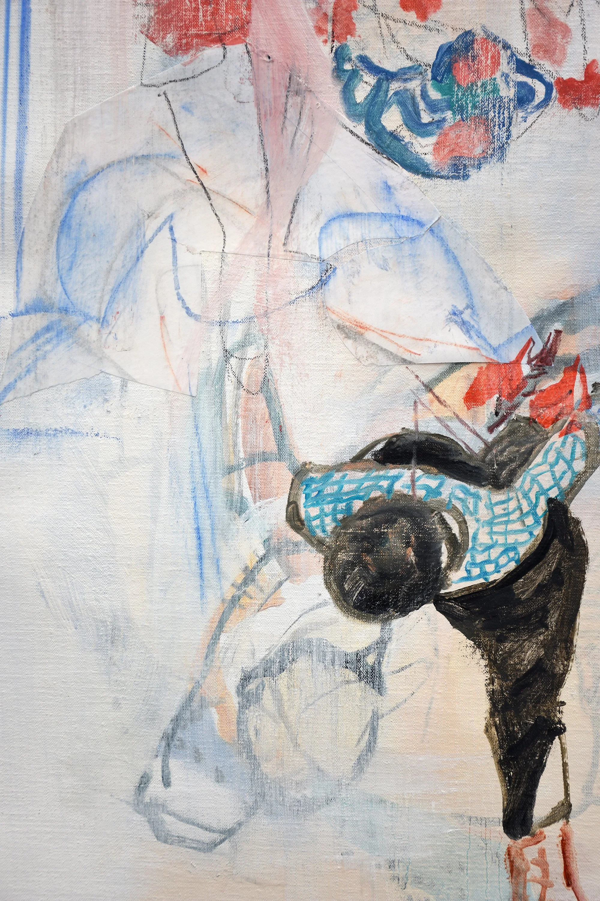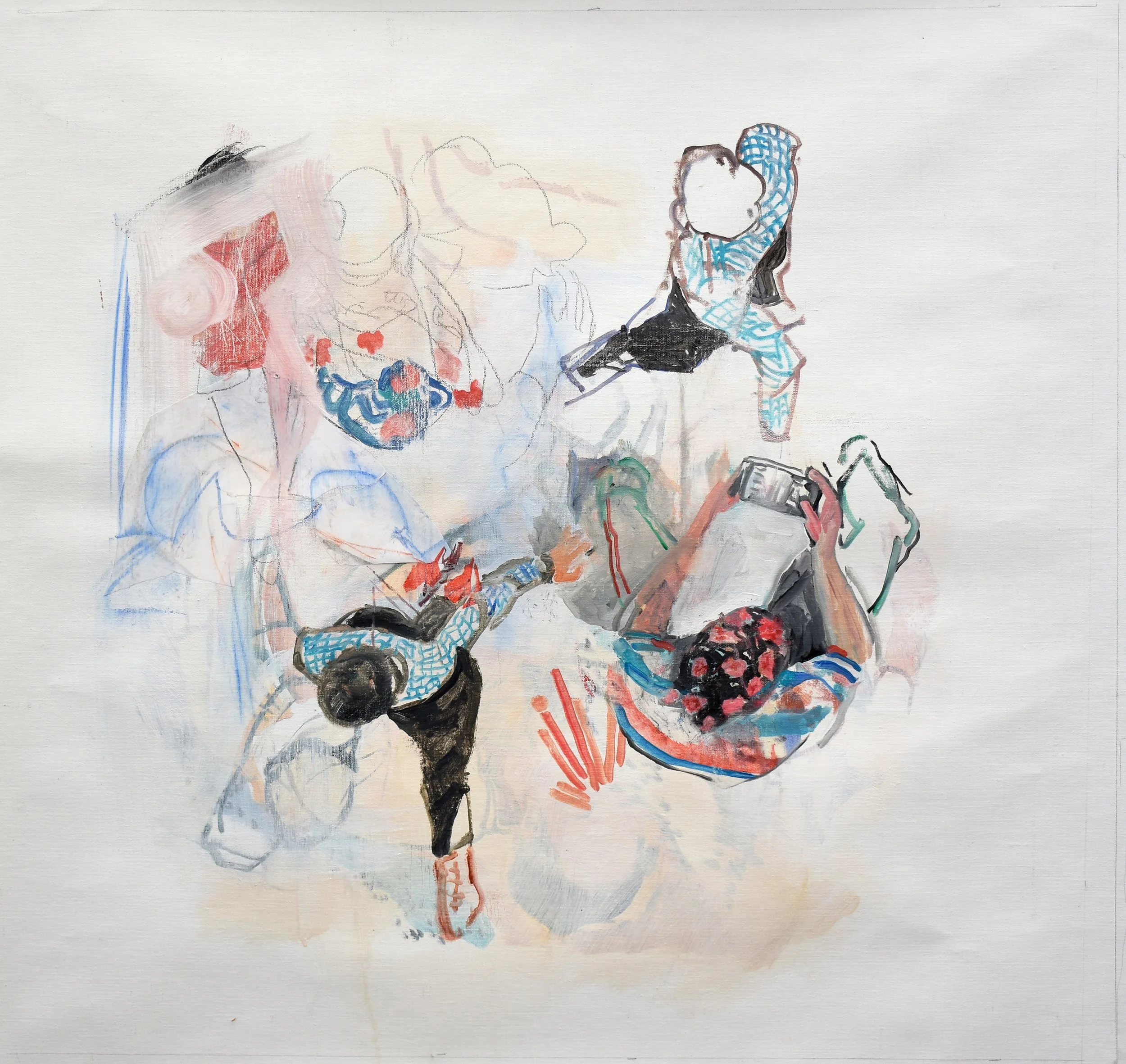 1:38 PM: after ging in to the post office & futzing around in the studio for a few hours, i got back into jazz 7. it now has 4+ figures, and works whichever way you turn it. as i gaze at my east painting wall, 5 paintings in the jazz series are tacked to the wall, the 6th one having been stretched & gone to the house, i see a definite progression. this one is, at the same time, more complex as a composition and simpler. it’s those unexpected marks & scrapes that bring it to a new level. not to imply anything negative about the others. i love observing the unfolding of jazz, which, in case you haven’t been following my blog posts, emerged from listening to thelonious monk. he may not have been a painter, but, in my case at least, was a painter’s muse. those pauses…here’s a quote about his style of playing: Monk’s playing style is very unique, using sparse voicings and omitting notes to add dissonance. Another distinctive element of his playing is an extremely strong time feel. His soloing usually relies on motifs and is often based on the melody of the song.