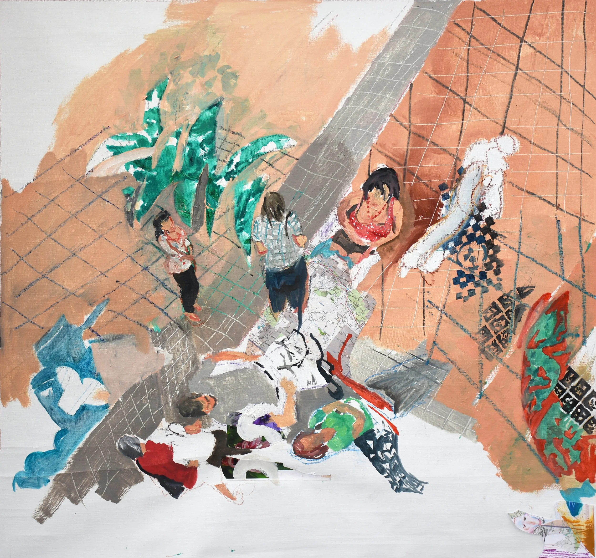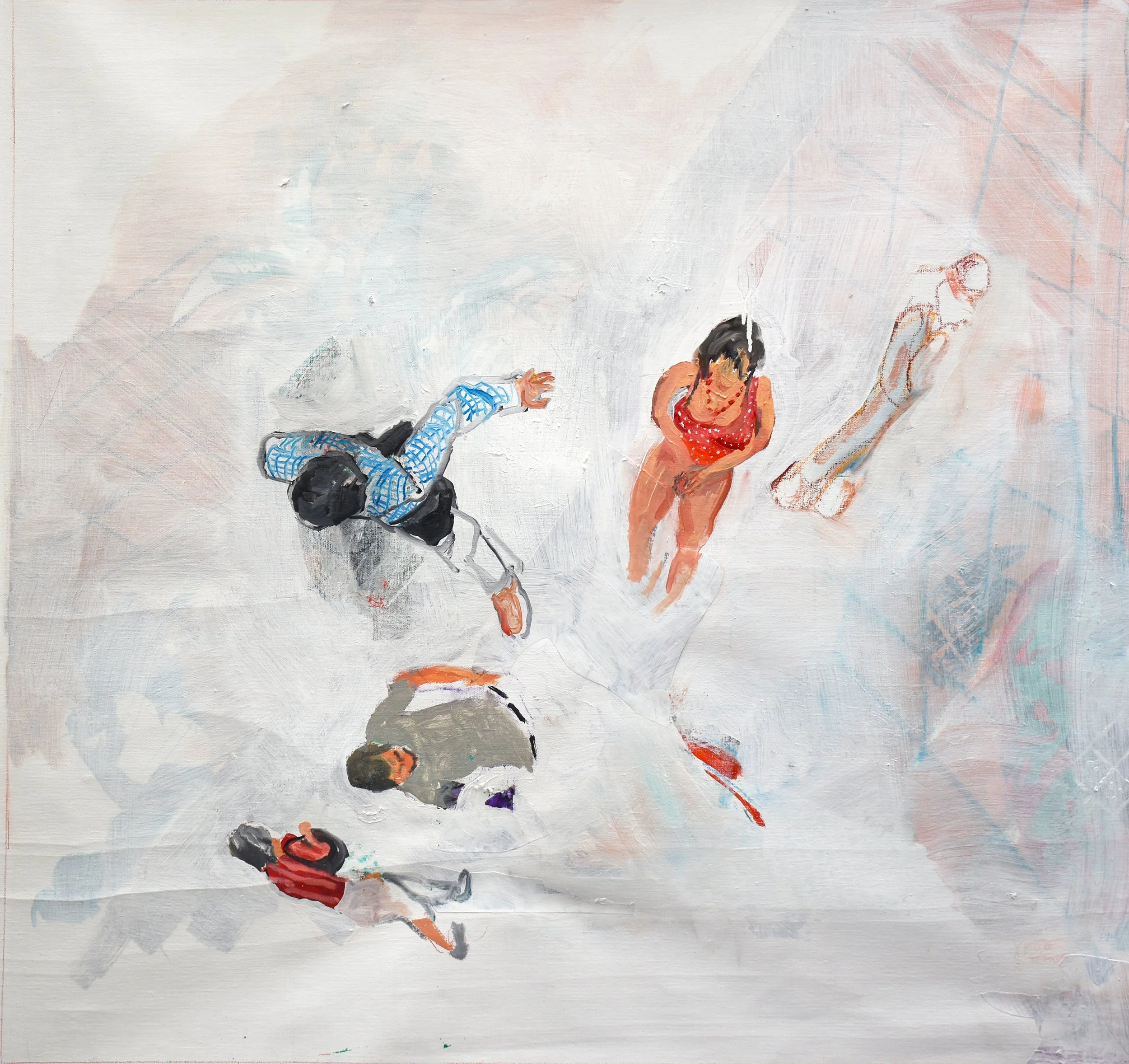 so what started out as a play on the image of people seen from above walking down skoufa street in athens has become an enigmatic grouping of figures, all viewed from above, moving about the white, 37x35”/94x89cm. space of the canvas. it’s not a dead white; beneath it can be discerned another layer of paint with a barely visible composition, adding warmth and mystery to the painting.