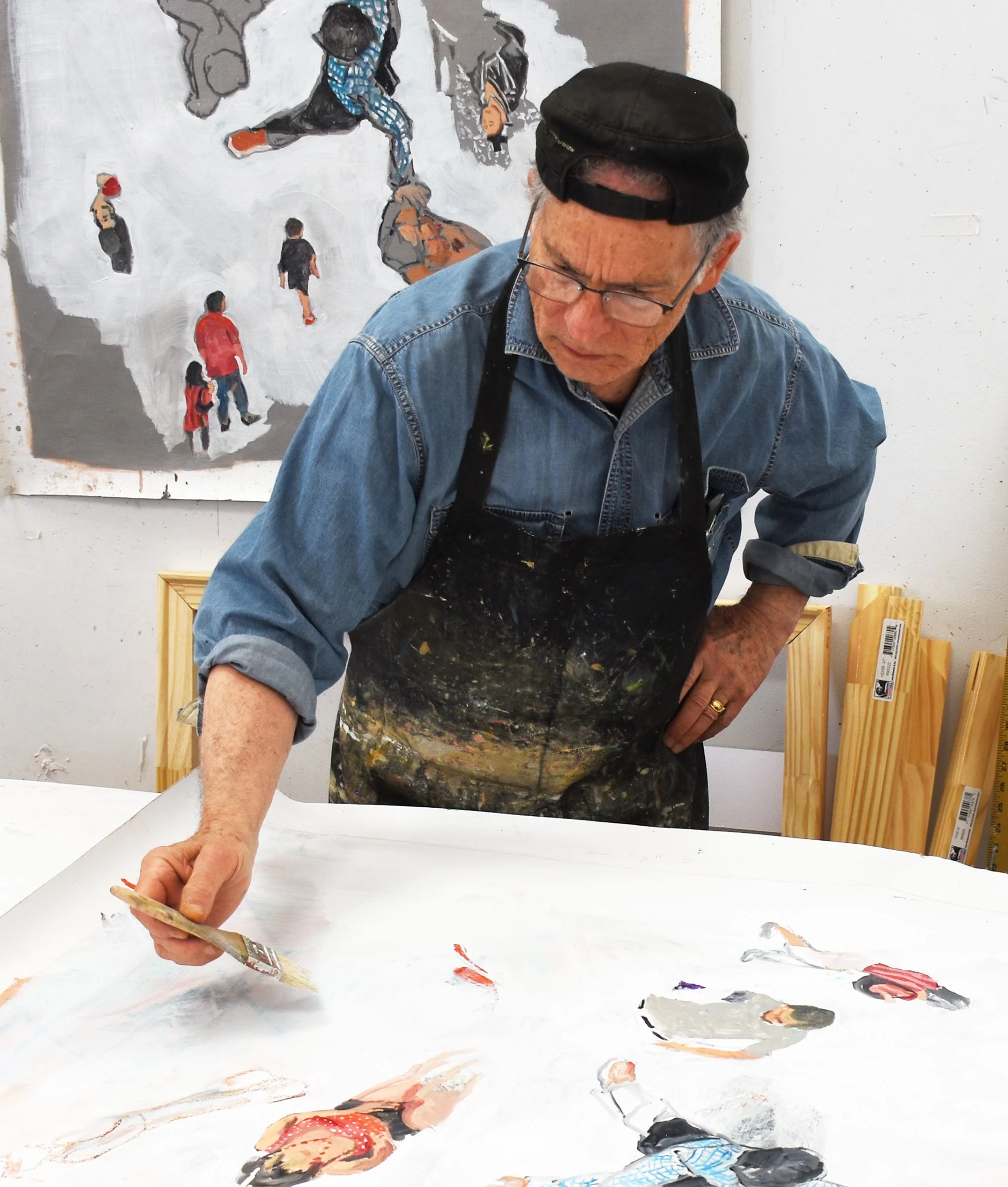 11:04 AM: usually, at this time of day i’m just getting to work. but today mikela had to leave for school at 8am, so i got ready early & she dropped me at the studio about 8:15. after having my breakfast, i got to work on the 4th painting in this current series, formerly titled skoufa. that title derives from the original photos it was inspired by, shot from a second floor balcony in 2010, when i had a solo show at skoufa gallery. i whited out most everything but the figures, and went over the figure in the upper middle, which i felt was extraneous to the composition.