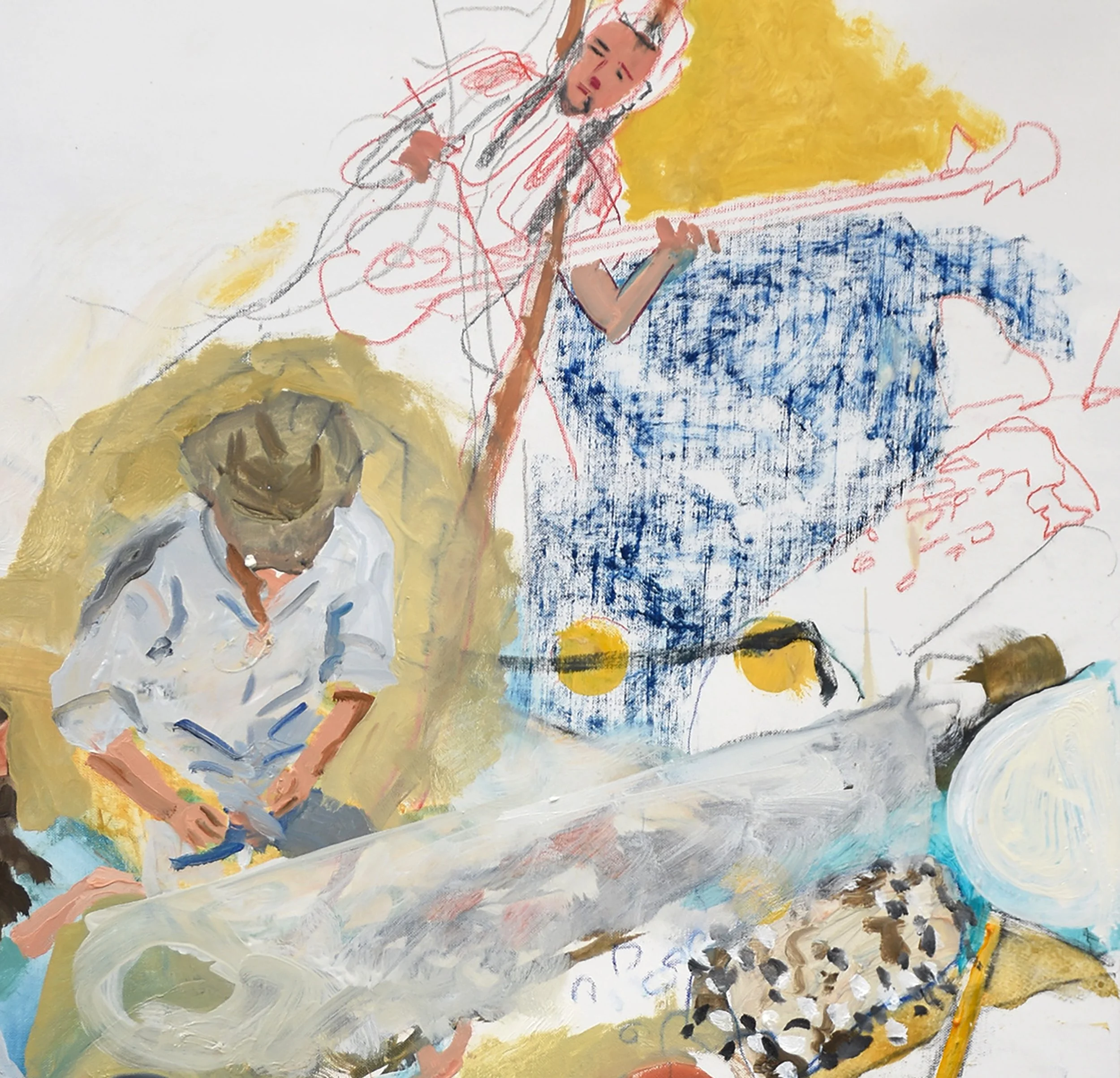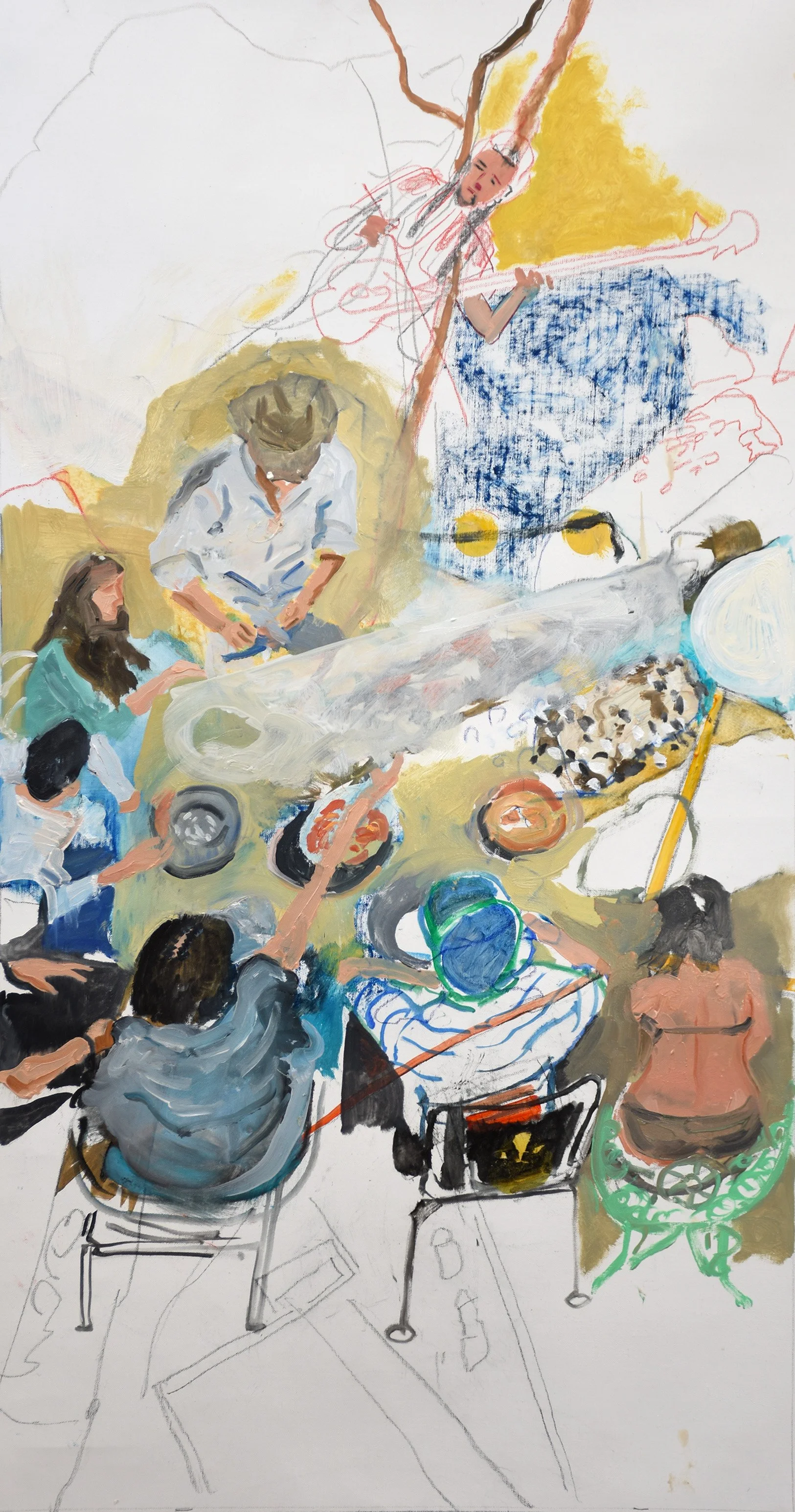 i was intending to extend the table with it’s plates full of food and add dditional figures in the upper right, painting over the blue oil pastel. but now i’m leaning towards not doing that, remembering that it’s a composition, and evaluating it in that light.