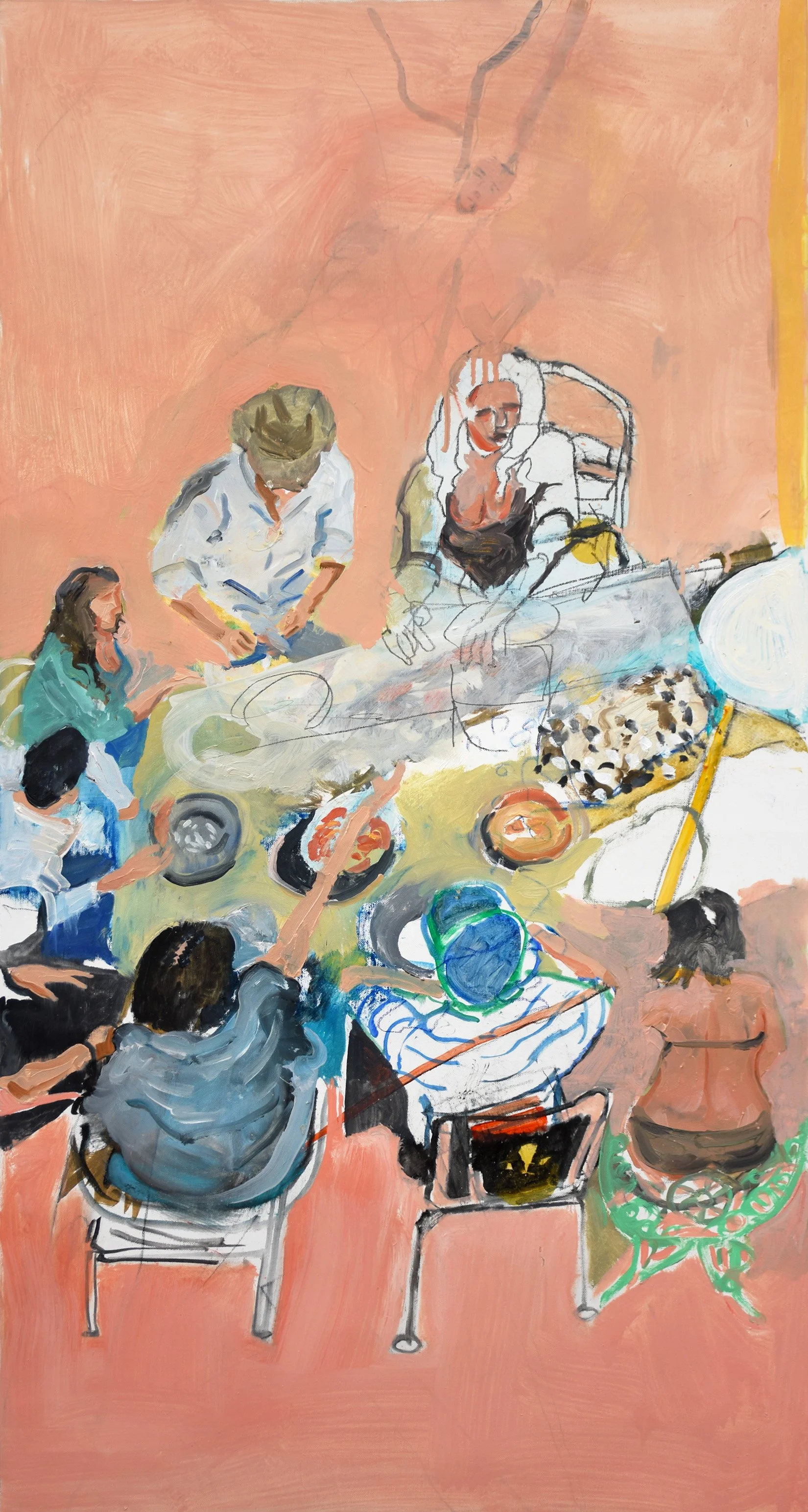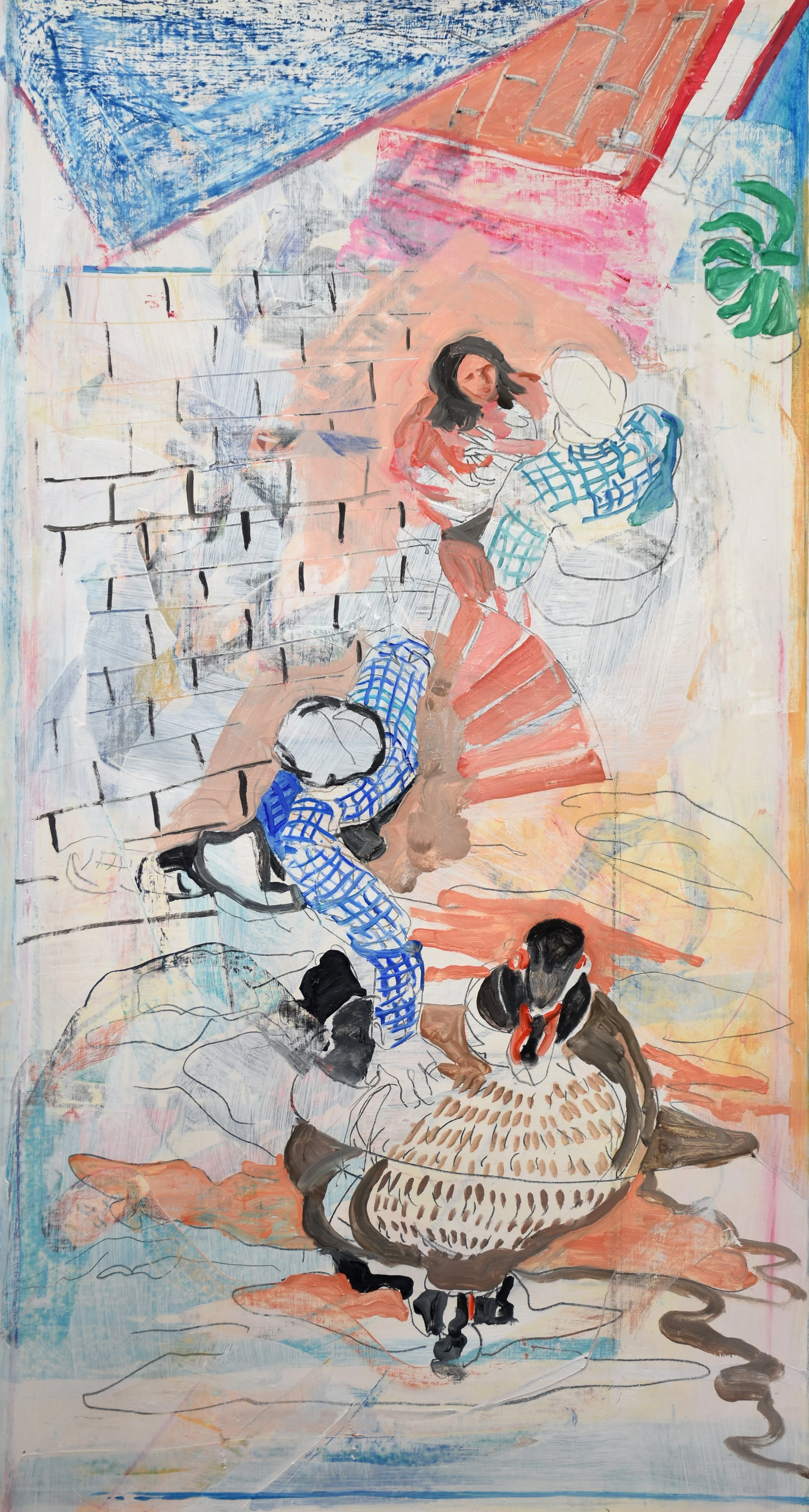 hu 1, which i whited over and started anew yesterday, has progressed substantially, although it’s still very much in a formative state. the white i used to cover the underlying hu 1 was still not dry, so it picked up whatever color i was applying today & kind of greyed it all. the walking, plaid shirted figure of the good doctor has once again twice entered the composition. however in the as yet partially defined figure on the upper right, he’s not walking, but rather interacting with his girlfriend, also ill defined for the moment. the swimming duck below is reflected in the water. it’s too early in the process for this new composition to have jelled, but it’s showing promise. so tomorrow, when the white will have dried more, it will begin coming together.