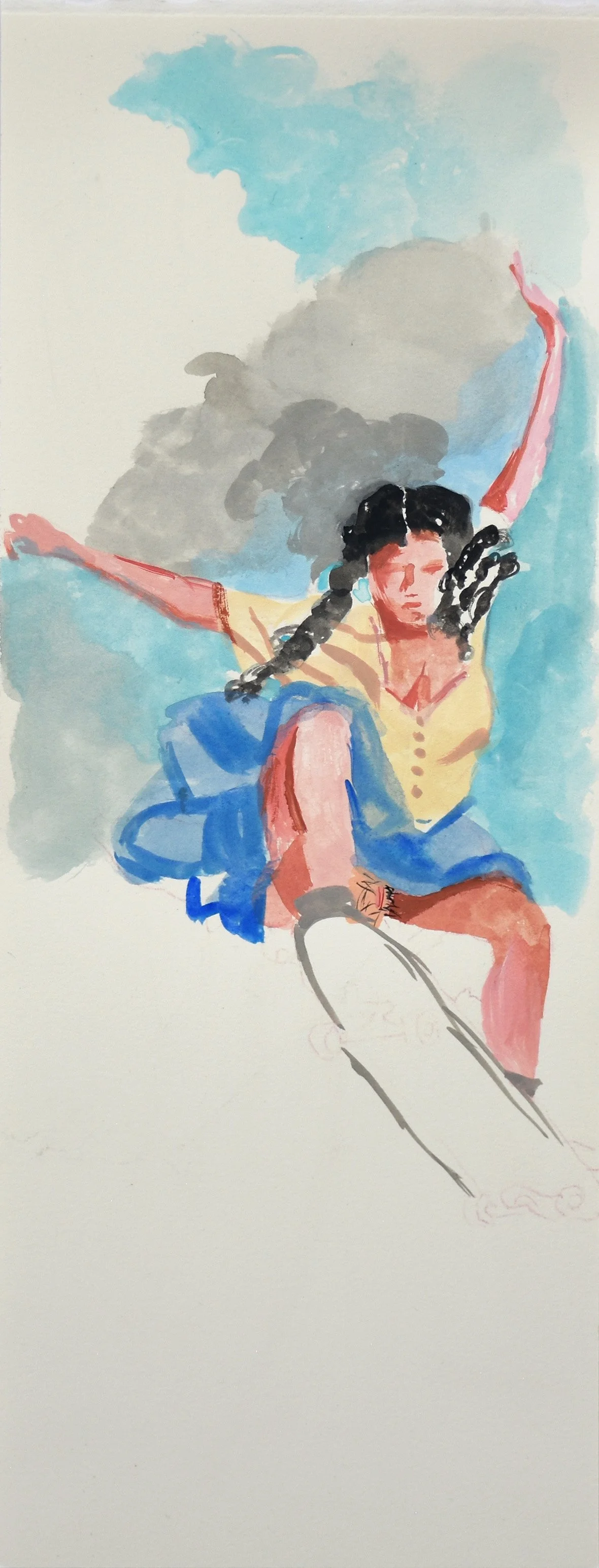 3:28 PM: i’m interrupting my recent series of 38x20” oils to make a few paintings of skateboarders this weekend, for a prospective client who expressed interest. i’m about 70% through the first one, titled simply: skateboarder 1. they will all be 16x6” gouache on arches paper.