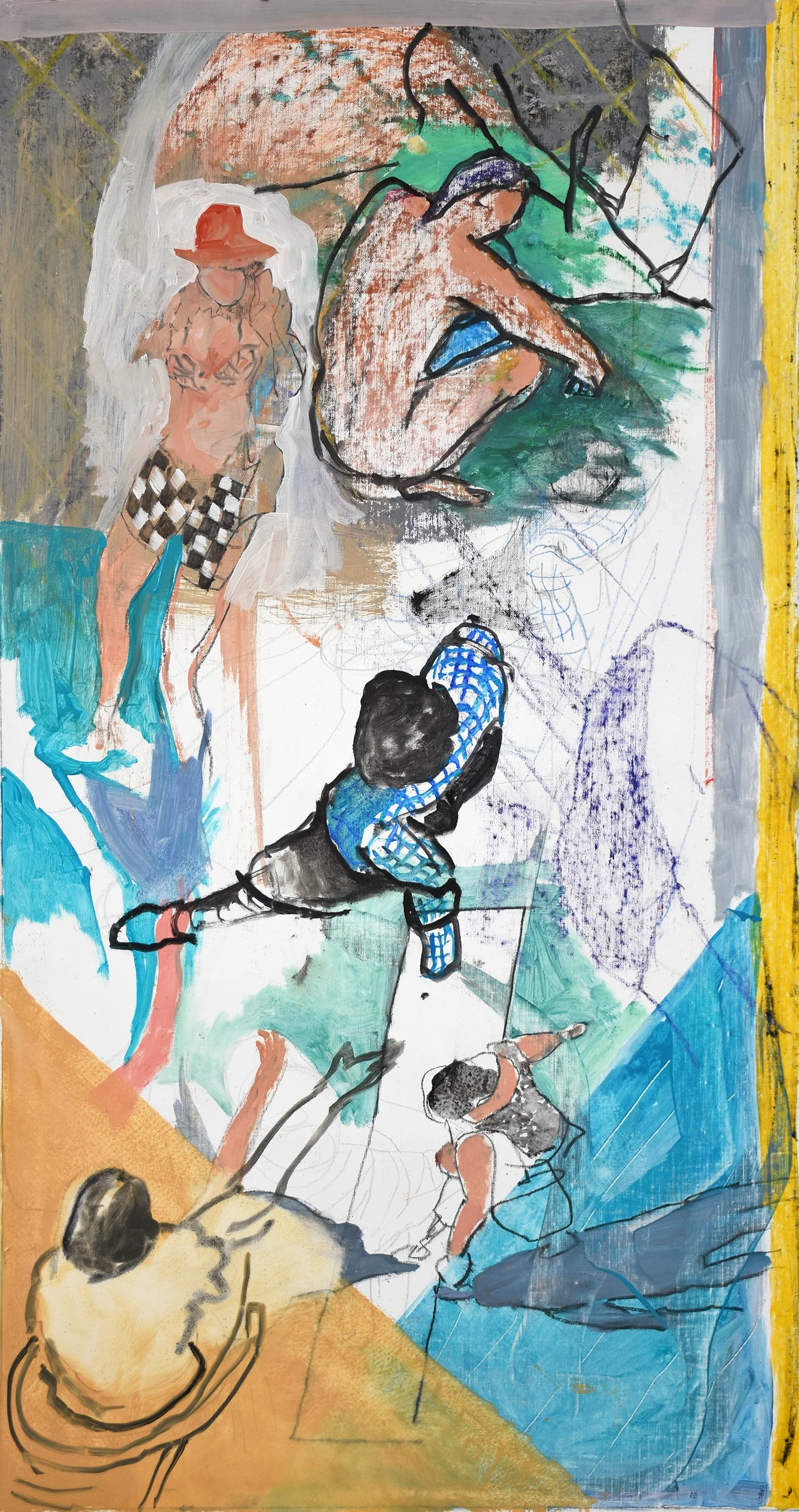 all that is well and good, but it’s the composition that i’m focused on, which is now doing some interesting, playing on spatial relationships. it causes the eye to jump from one plane to another and may give you the feeling that you just may tumble over the edge and fly down to a lower level. and that’s because there is a lower level! i riffed off the photo of our home’s interior, shot from the upper level. so that’s the origin of the crouching figure, seen from above. the diagonal lines just above the crouching figure are the iron bannisters running along the stairs going up to the top floor.