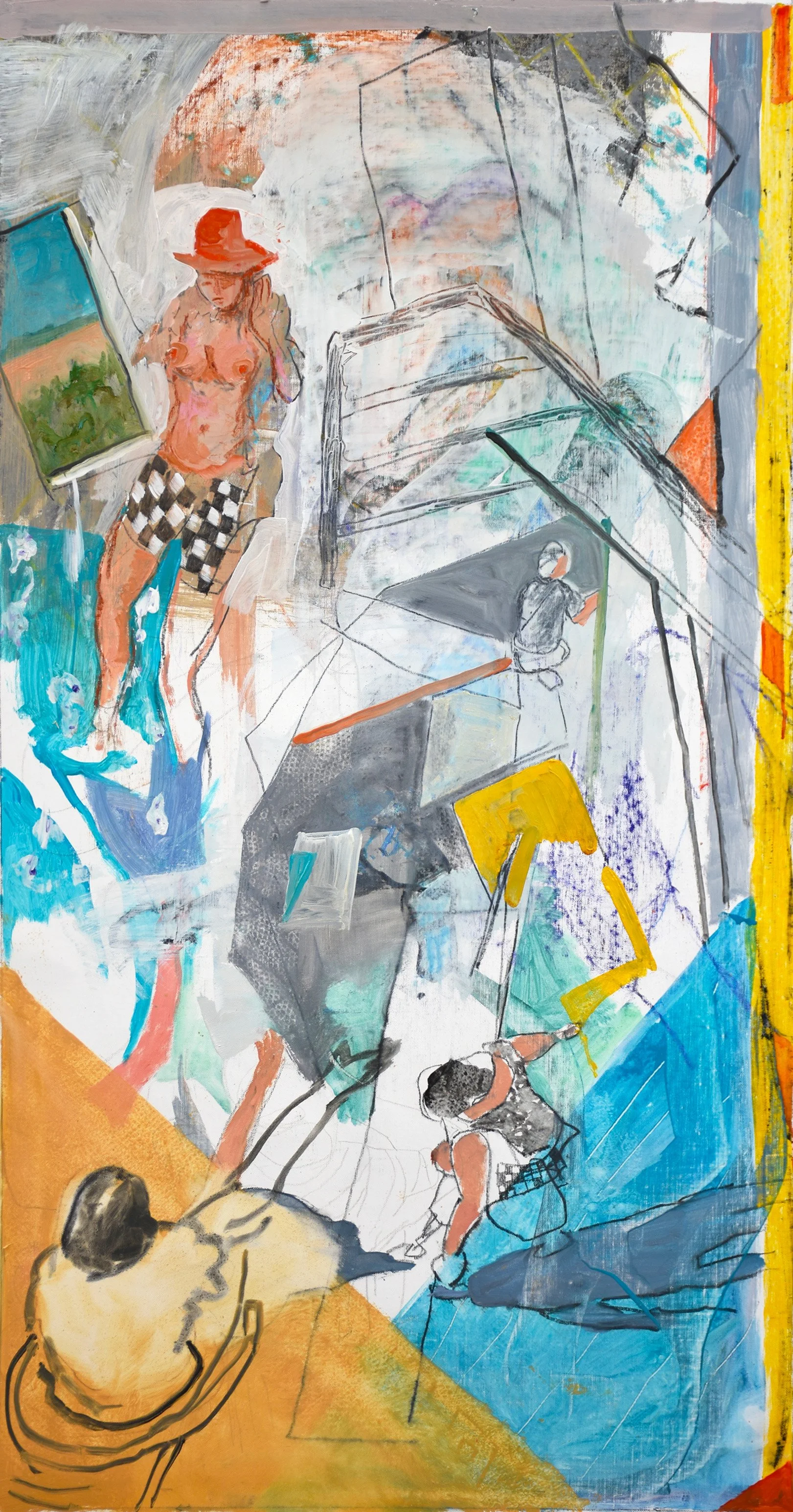 so, looking through the window you’re transported 40 miles across the valley to the san juan mountains. shifting your glance just to the right is our interior, seen from above. the seated figure on the lower left is the only one anchored on that yellow ochre triangle of floor , calmly observing it all.