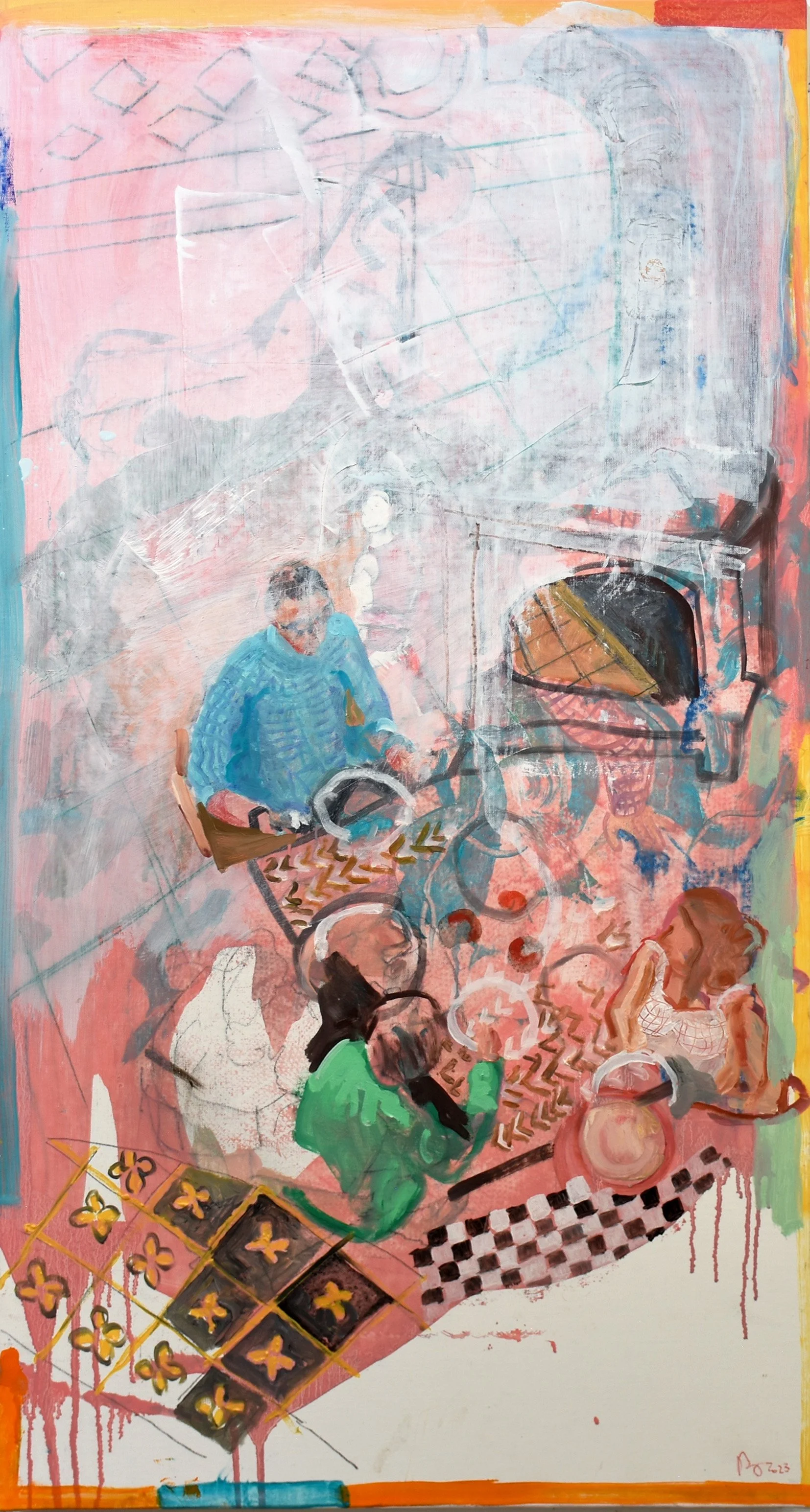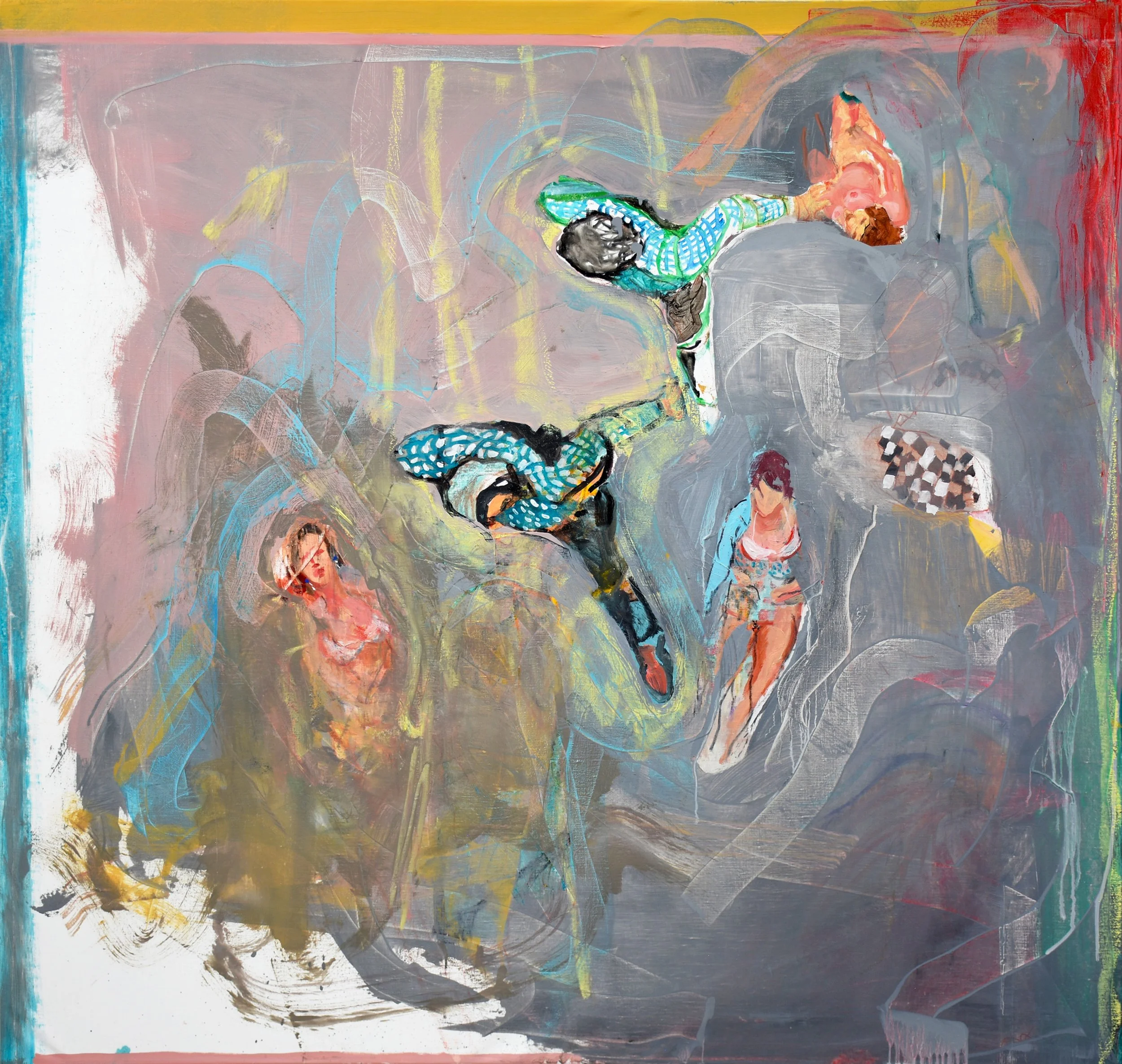 jazz 13 seems to be an ongoing experiment in ways the entire jazz series could go to another level. if i had to use one word to characterize that, it might be fluidity. i’ve been working into, the making fluid, curviliniar movements with the palette knife, creating a subtle play of movement across the canvas as well as greater ambiguity in the human figures scattered throughout the composition.