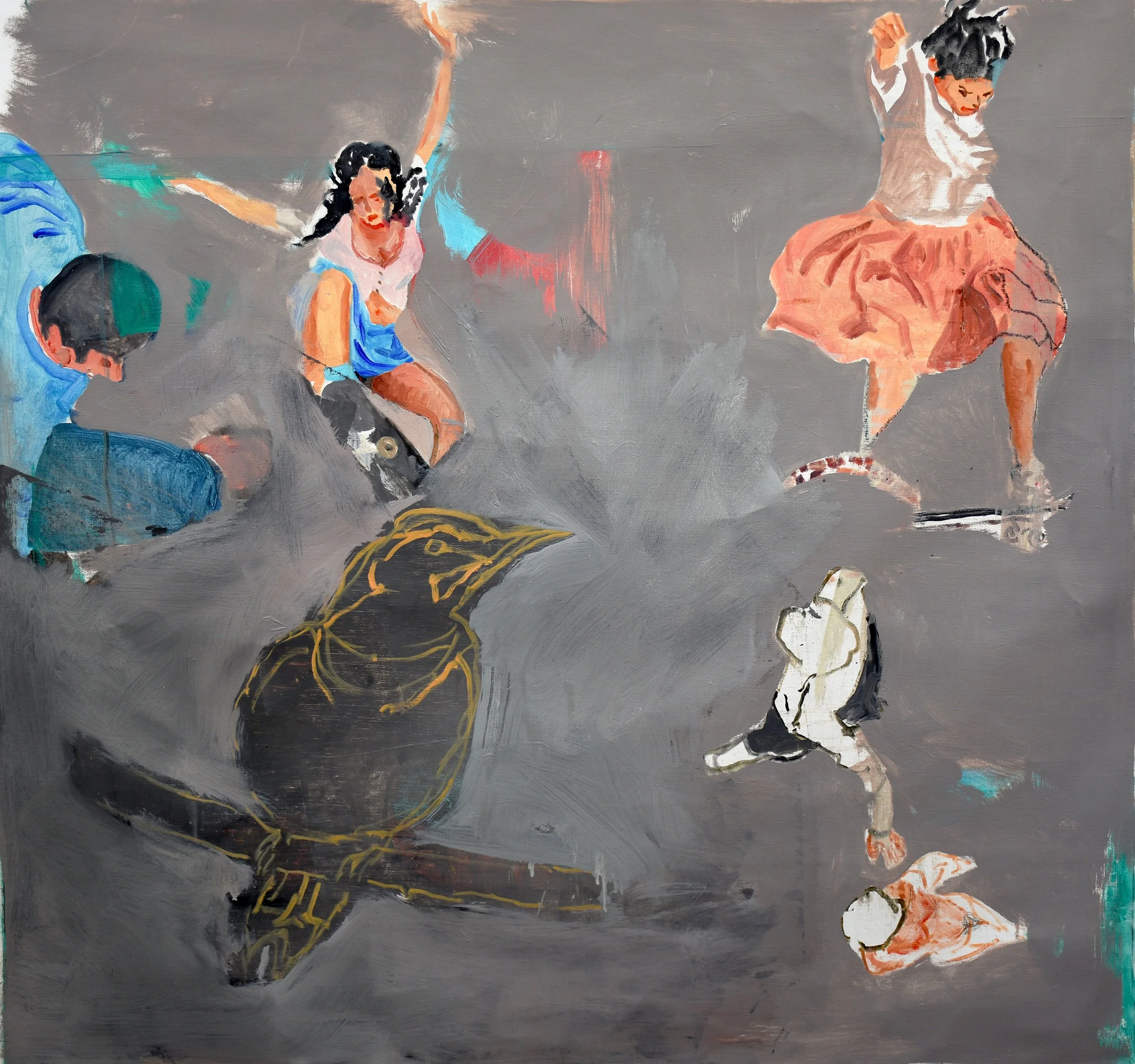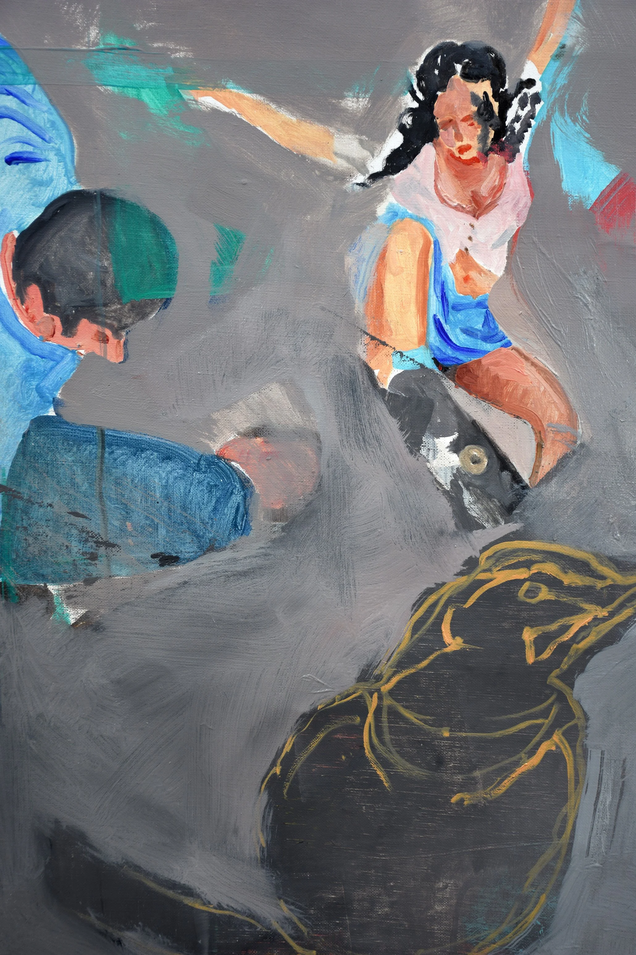 2:03 PM: the lower left portion of jazz 15 was bothering us both. so, after gazing at it on my studio wall for a couple of months, i greyed over that area of the composition and, just moments ago, sketched in a bird; the same one who first appeared in u.s. open 2. it will likely be overcast tomorrow, so i won’t have great light, but nonetheless i plan on giving the bird his features: beak, feathers, claws and those wonderful spotted patterns he/she sports! here’s the painting as it looked before i greyed over it, and moments ago.
