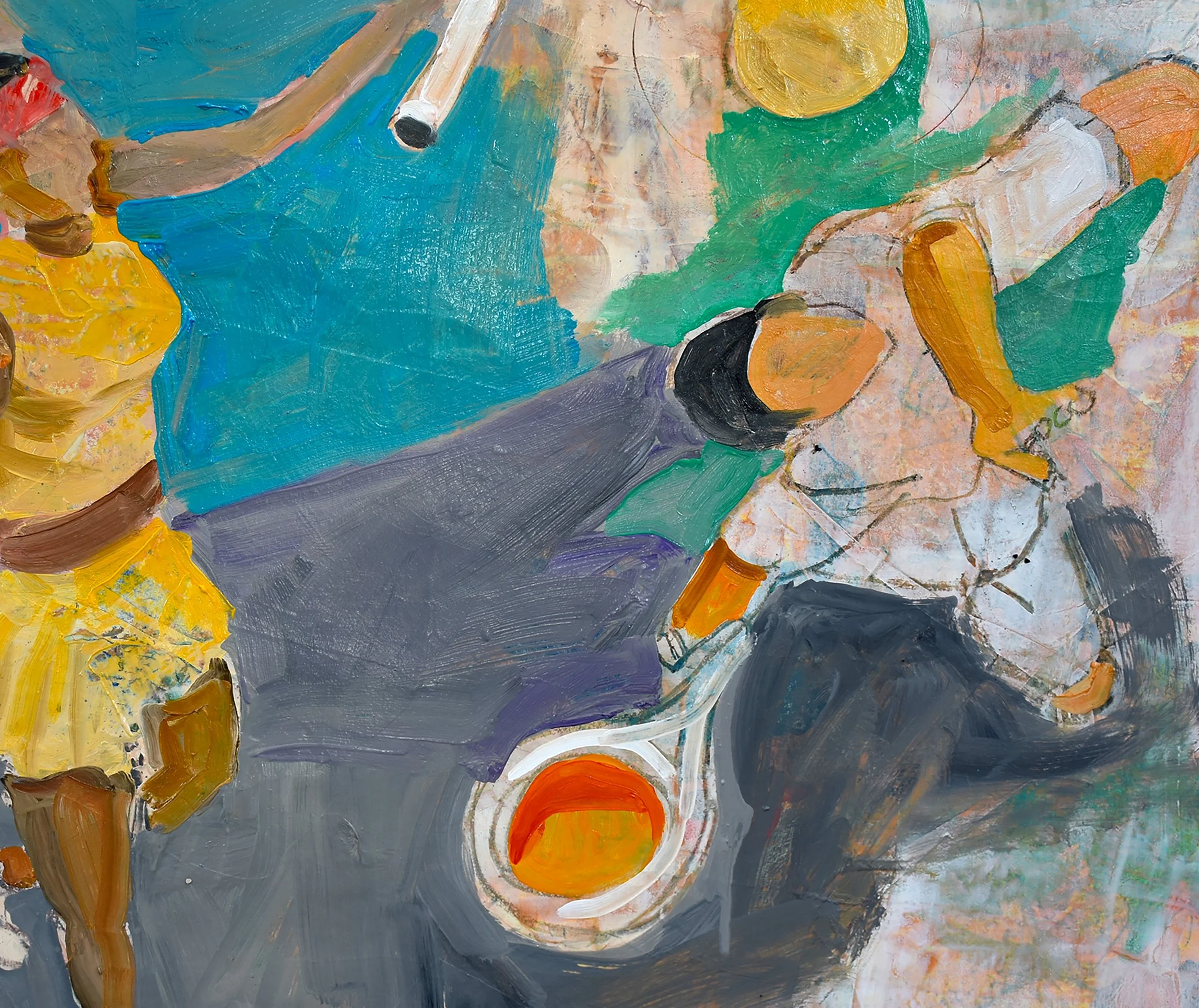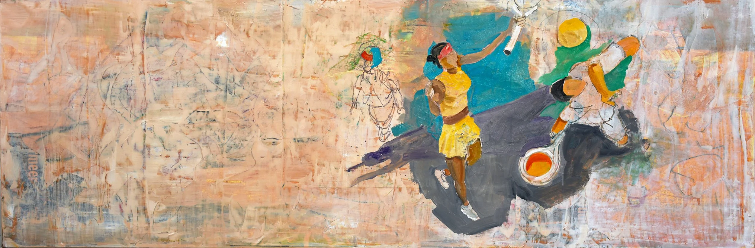 3:10 PM: i decided to devote my time today to jazz 18. it had been painted over several times; once with siena and then with white. then it was scraped, creating a surface i felt was ideal as a base for introducing figures; in this case tennis players from the u.s. open. i’ll continue working on jazz 18 tomorrow, perhaps introducing more figures in what is becoming a frieze-like composition.
