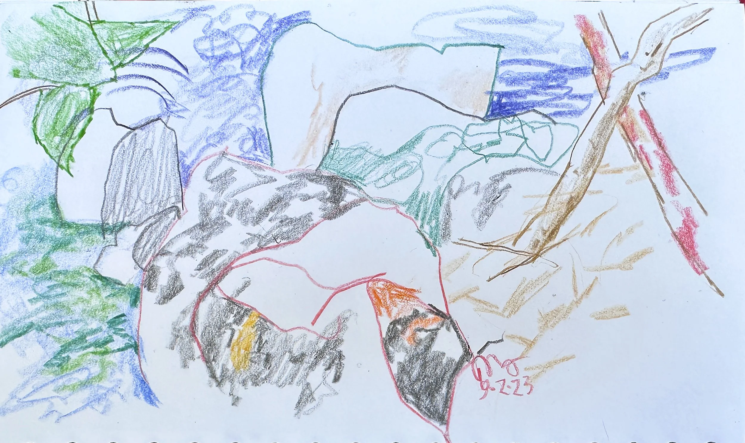 so i’ll wait till tomorrow morning to satrt something new. we took our trail walk this morning, and i made another study of the creek using my colored pencils and a small drawing book.