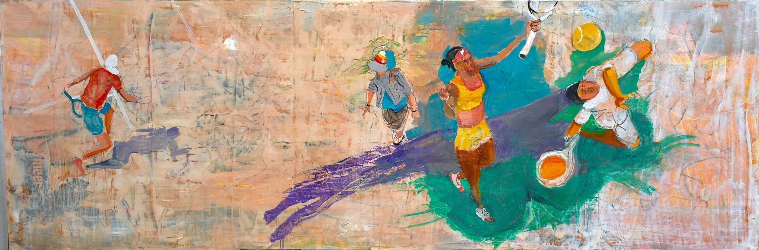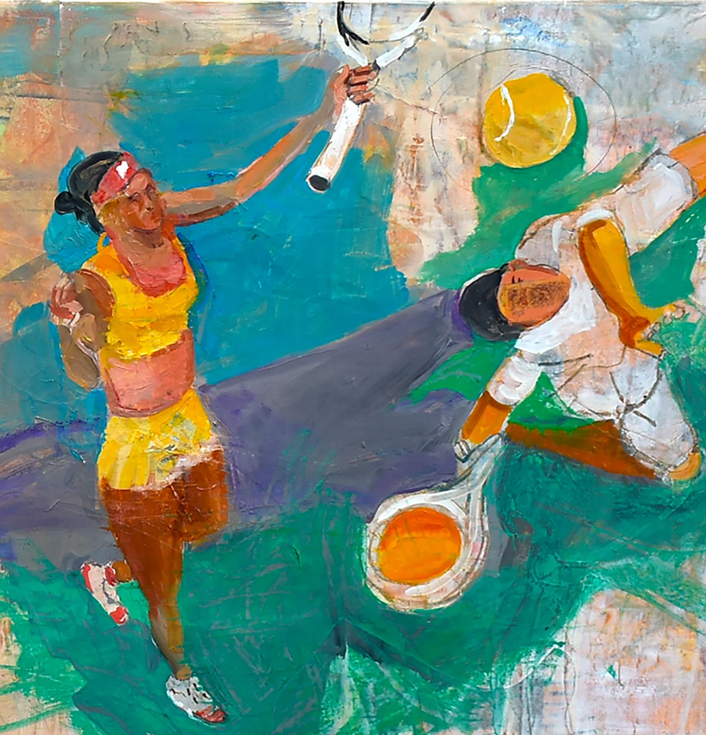 2:06 pm: as i gazed at jazz 18 this morning, thinking it was resolved,i had the urge to do more to the central female tennis player. i made quite a few changes to her body & outfit. then i made more changes to the background colors, adding more greens & extending the shadow of the male player on the right. as usual, i’m not yet sure what i did was good…domani.
