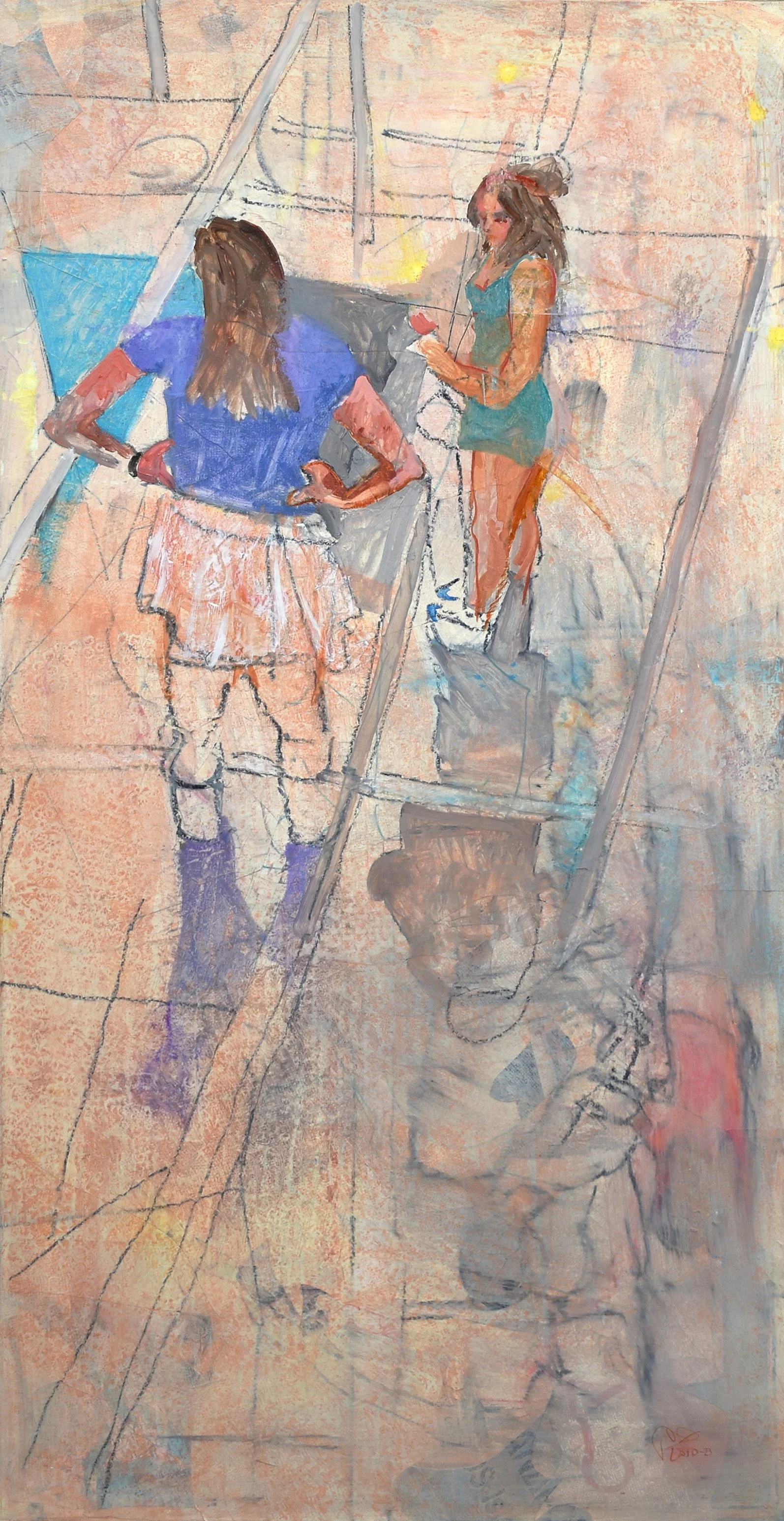 3:24 PM: today, as i gazed at one of my ano kato series of paintings, which was in a 2015 solo show at gremillion fine arts, houston, i was moved to make some changes to one of the female figures. the composition is set in one of the galleries at MOMA, in a view from above. the figures stand on the glass floor, which allows a view of the gallery just beneath this one; totally up my alley!
