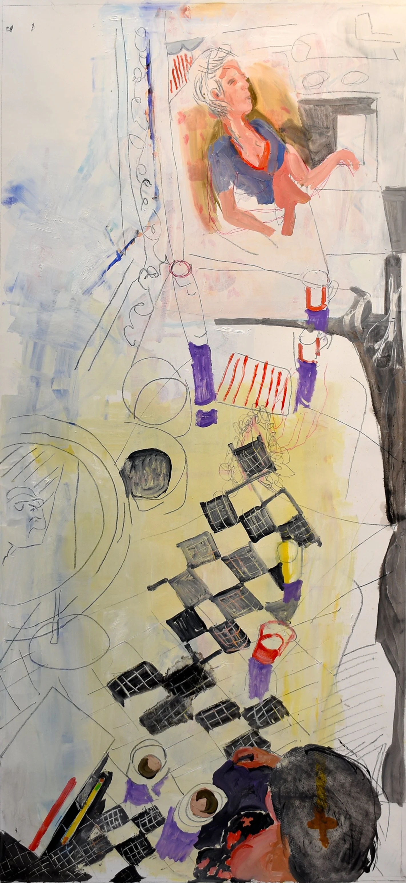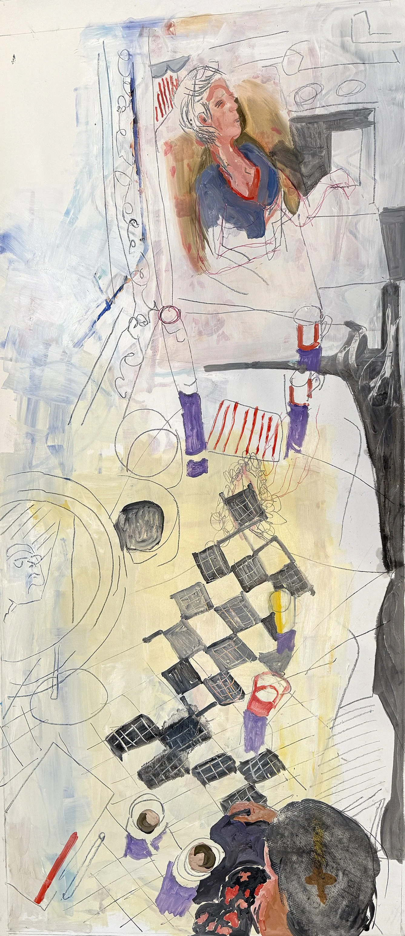 2:04 PM: i worked mostly on the lower portion of the composition over the past few hours, although i did add arms to the female figure at the top. slowly is holy, especially in a delicately balanced compostion such as this. i need to do a bit more to the area just beneath the upper figure to unite it with the rest of the composition. but, as much as ossible, i’d like to maintain the simplicity and spareness, allowing the viewer space to invent the rest.