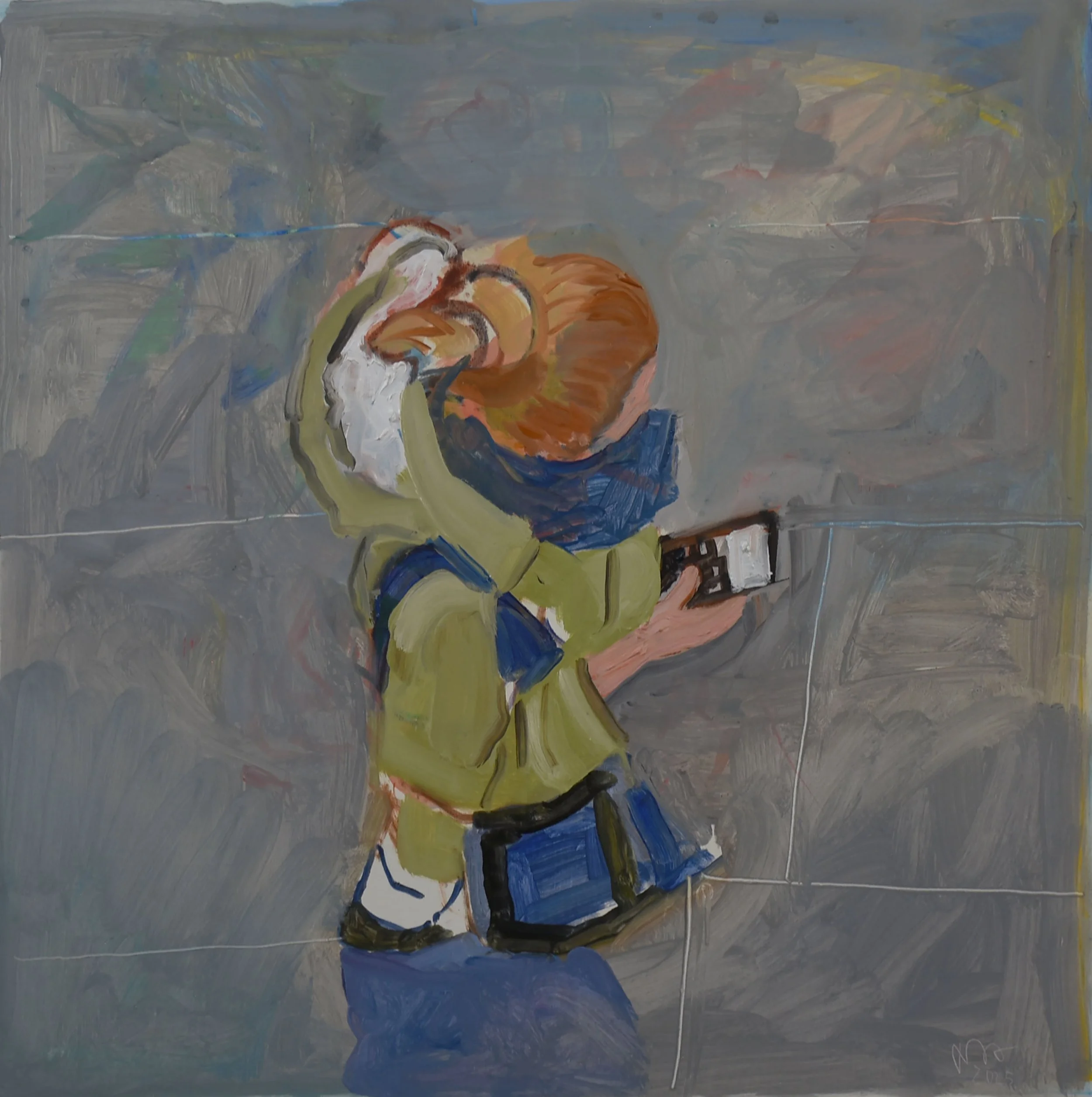 11:38 AM: yesterday’s’ version of 11/16/25 oil wasn’t working me, so i scrubbed whatever remained wet and then went over it with a warm grey. i introduced the figure of a woman viewed from above, with a blue bag over her shoulder, walking while looking at her phone.