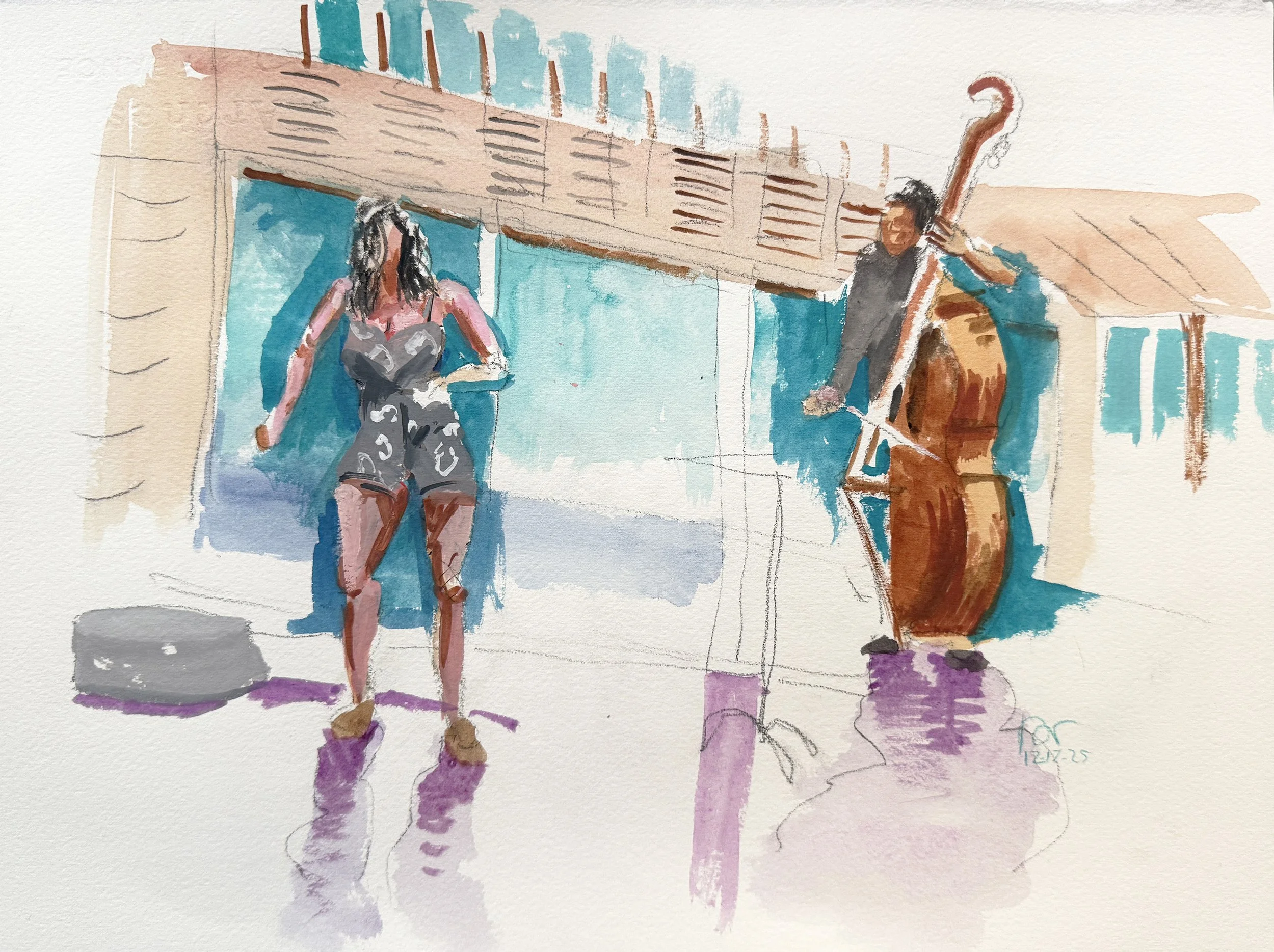 2:40 PM: today i made the second in my jacobs pillow series of gouache/watercolors. the interior of the jacobs pillow is the same as in yesterday’s jacobs pillow 1, but the dancing figure is different, and there’s a cello player to her right. there will likely be 4 more.