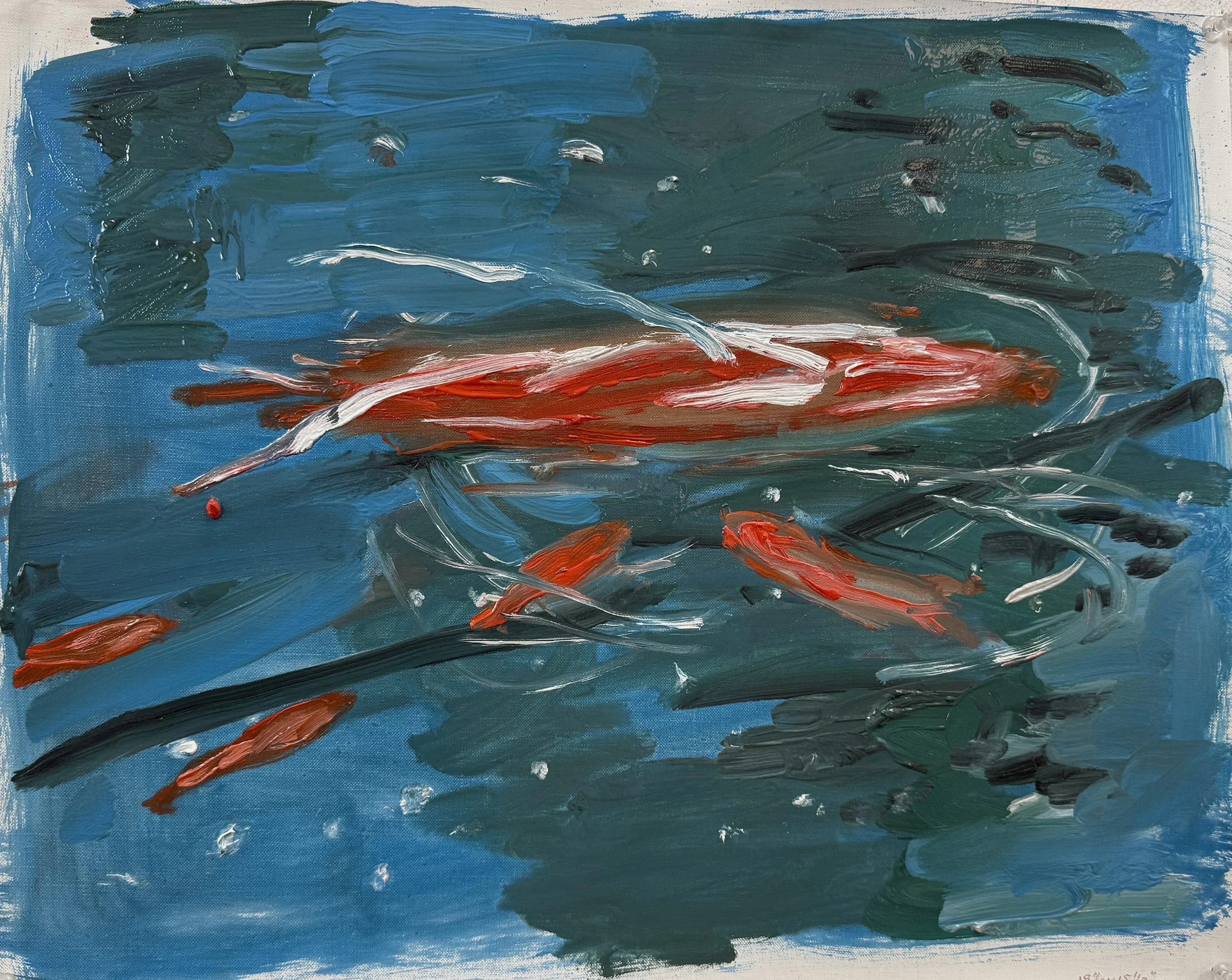 i started a new painting titled goldfish swimming today. unlike figures in motion, it was painted with large bold strokes of the brush; a delight to paint!