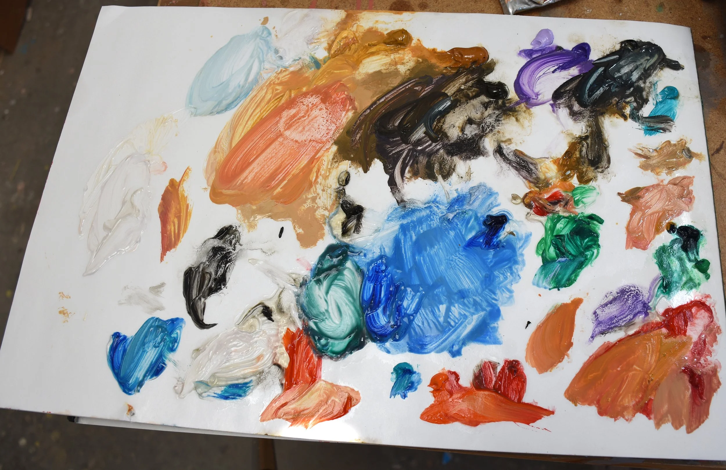 11:03 AM: every day is a new adventure. today when i entered my studio, jazz 1 struck me as way too busy, and for no good reason. so, even though there were areas that hadn’t completely dried, i went over everything but the figures with a layer of titanium white oil. it did pick up a little of the still wet reds & yellows i applied yestereday, but not enough to really matter.