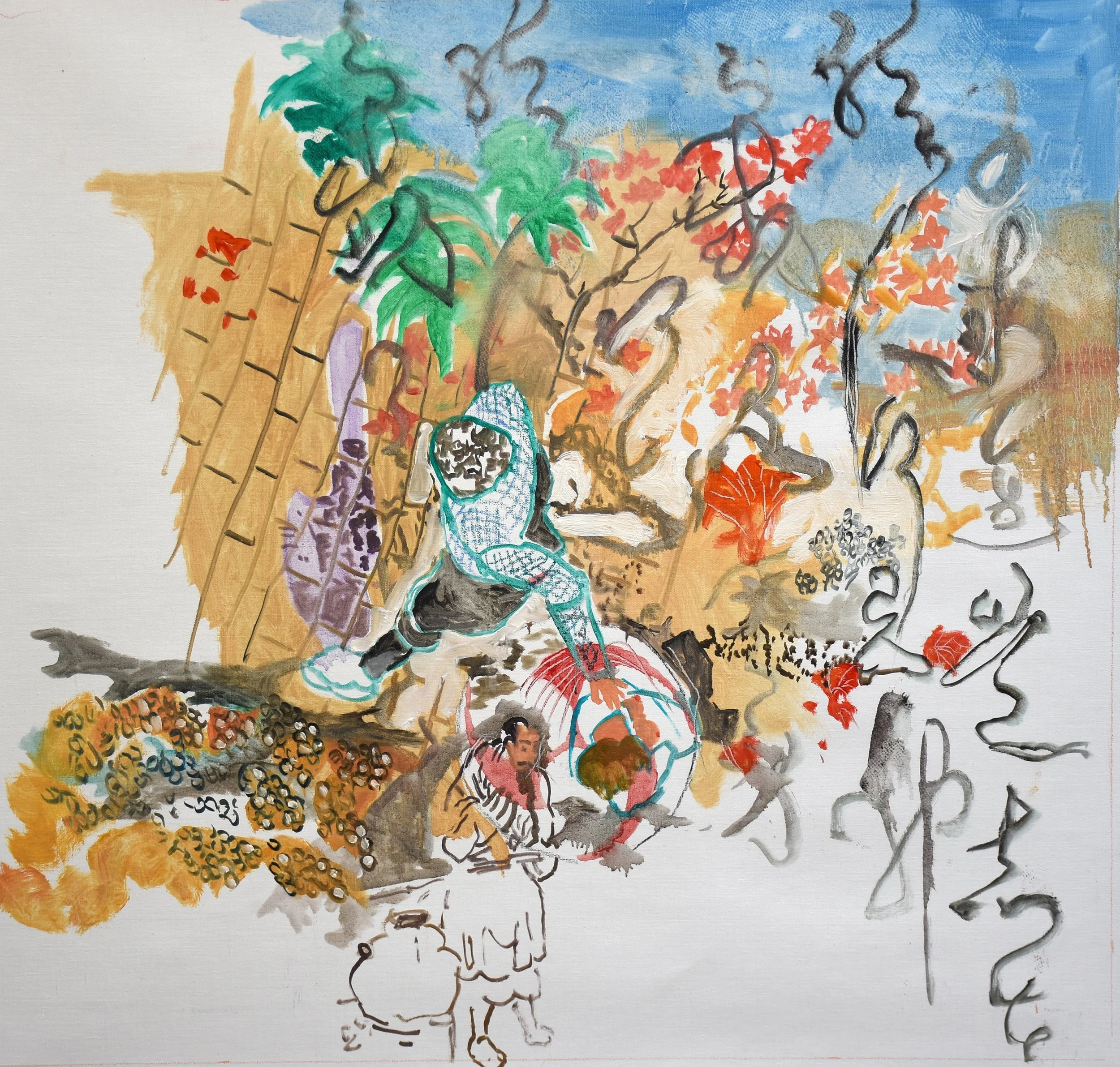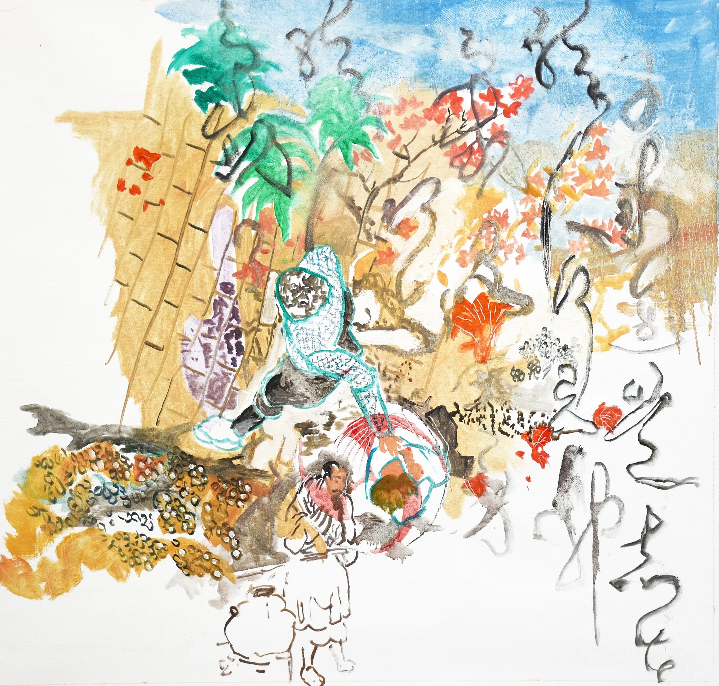so now, from my 20 foot vantage point, it’s as if the figures; some right side up, others upside down, inhabit an otherworldly space. the wrinkles, by the way are because it’s just tacked to the wall; once i stretch it, they will dissapear. i’m going to leave it for now and work on something else.