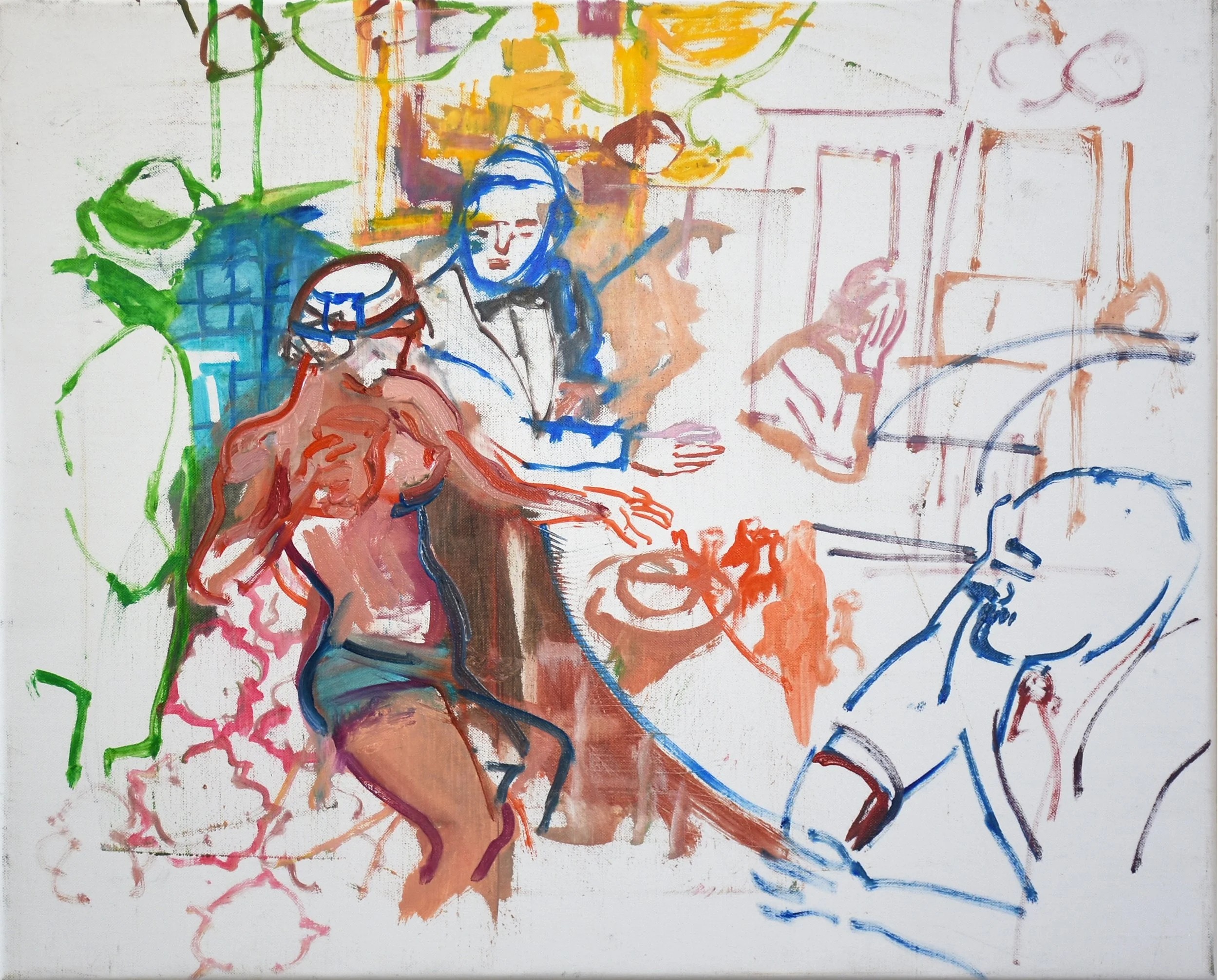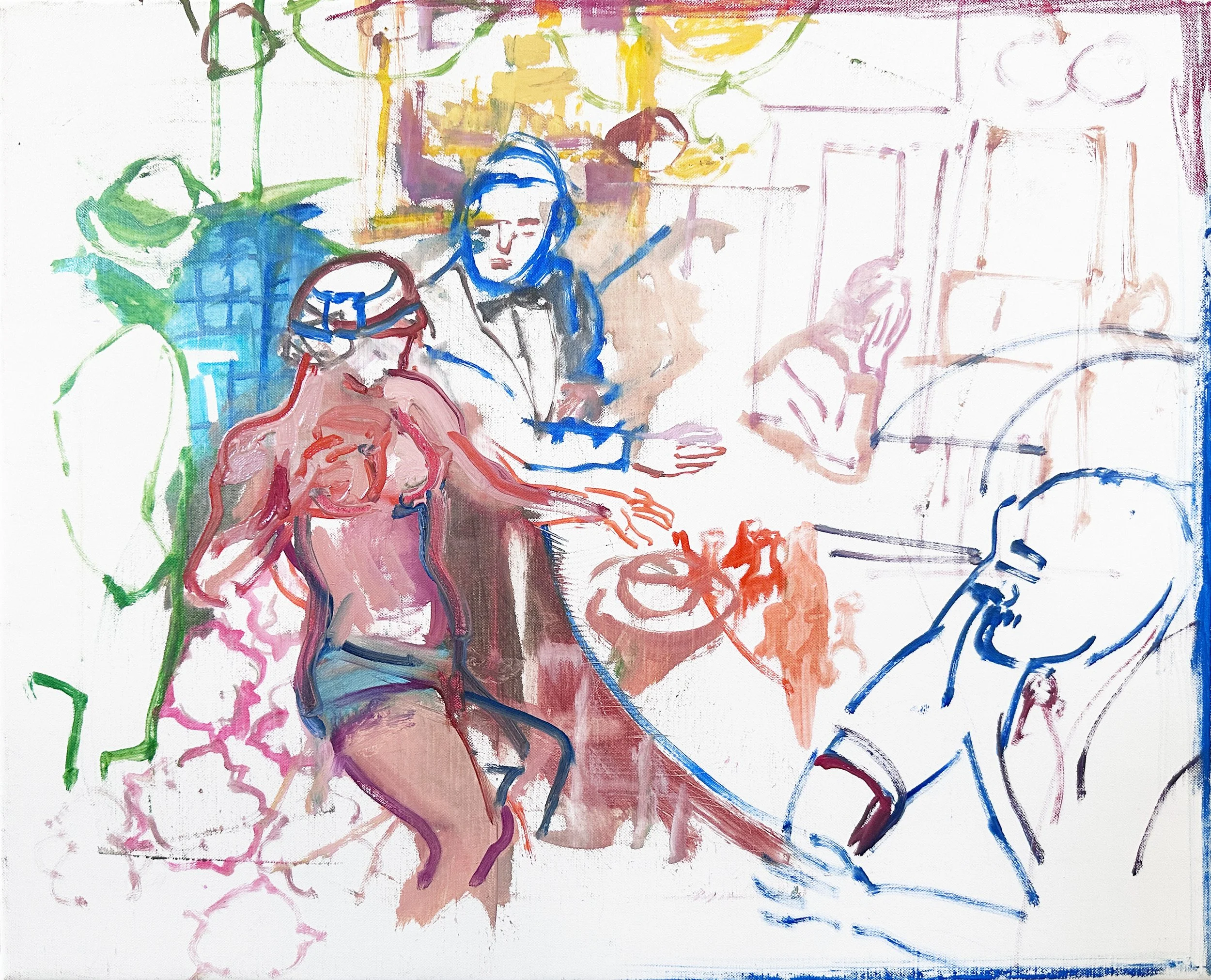 2:26 PM: i was having issues with the piece of collaged paper on the mid-right, which wouldn’t stick to the canvas. so i read up on it and learned something i’ve wanted to know for a long time; how to collage a piece of paper to an oil painting on canvas. the solution was simple, and i happen to have the recommended PVA size.