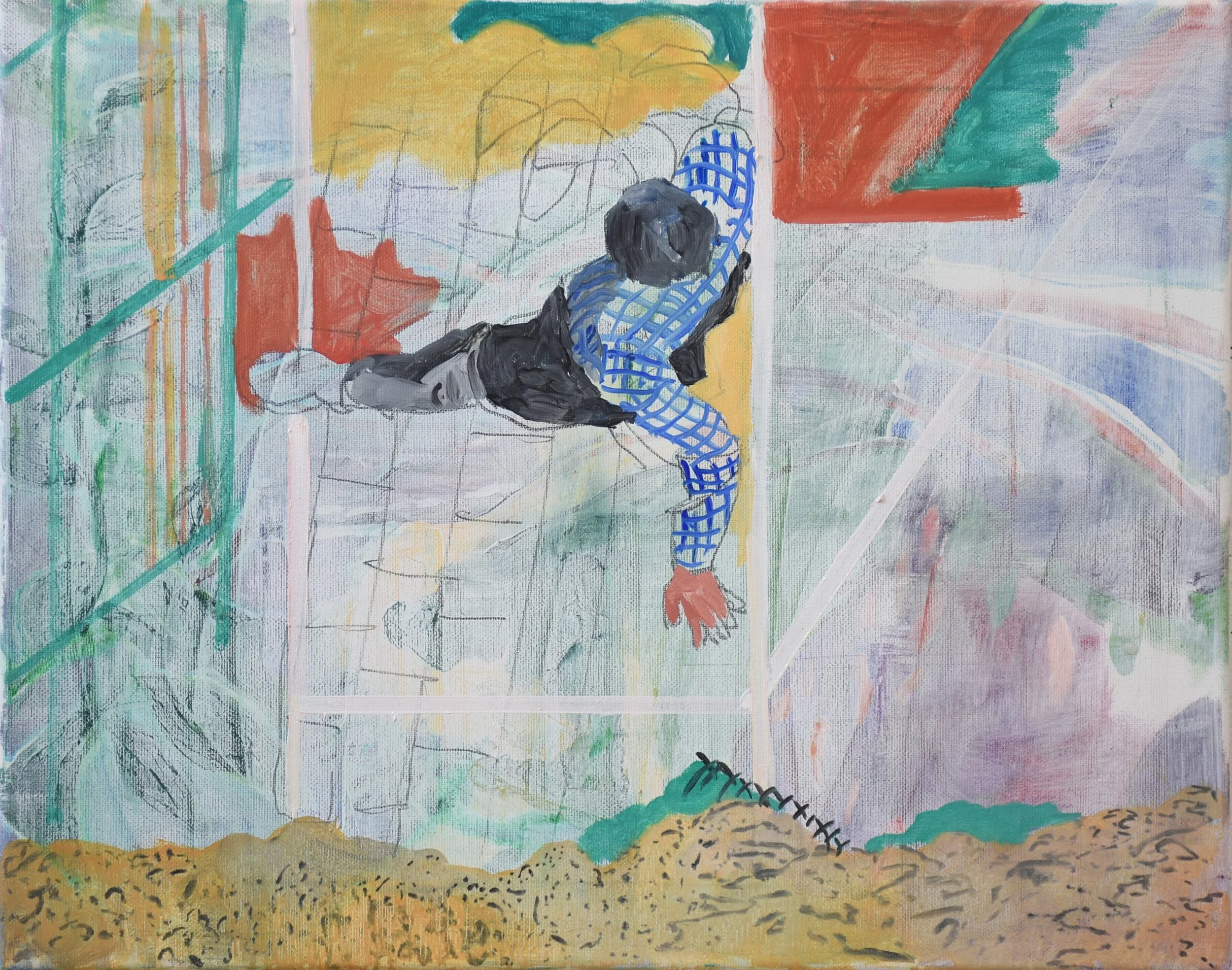 once i had accomplished that by tracing the shape i wanted and cutting it out then mounting it on the painting, i worked into it. the result is different than before, and i think much improved! imy original intention was to hide the figure of the jumping female skateboarder, and what i had done on the other piece of paper that wouldn’t stick was ok, but not fully integrated into the composition, which it now is.