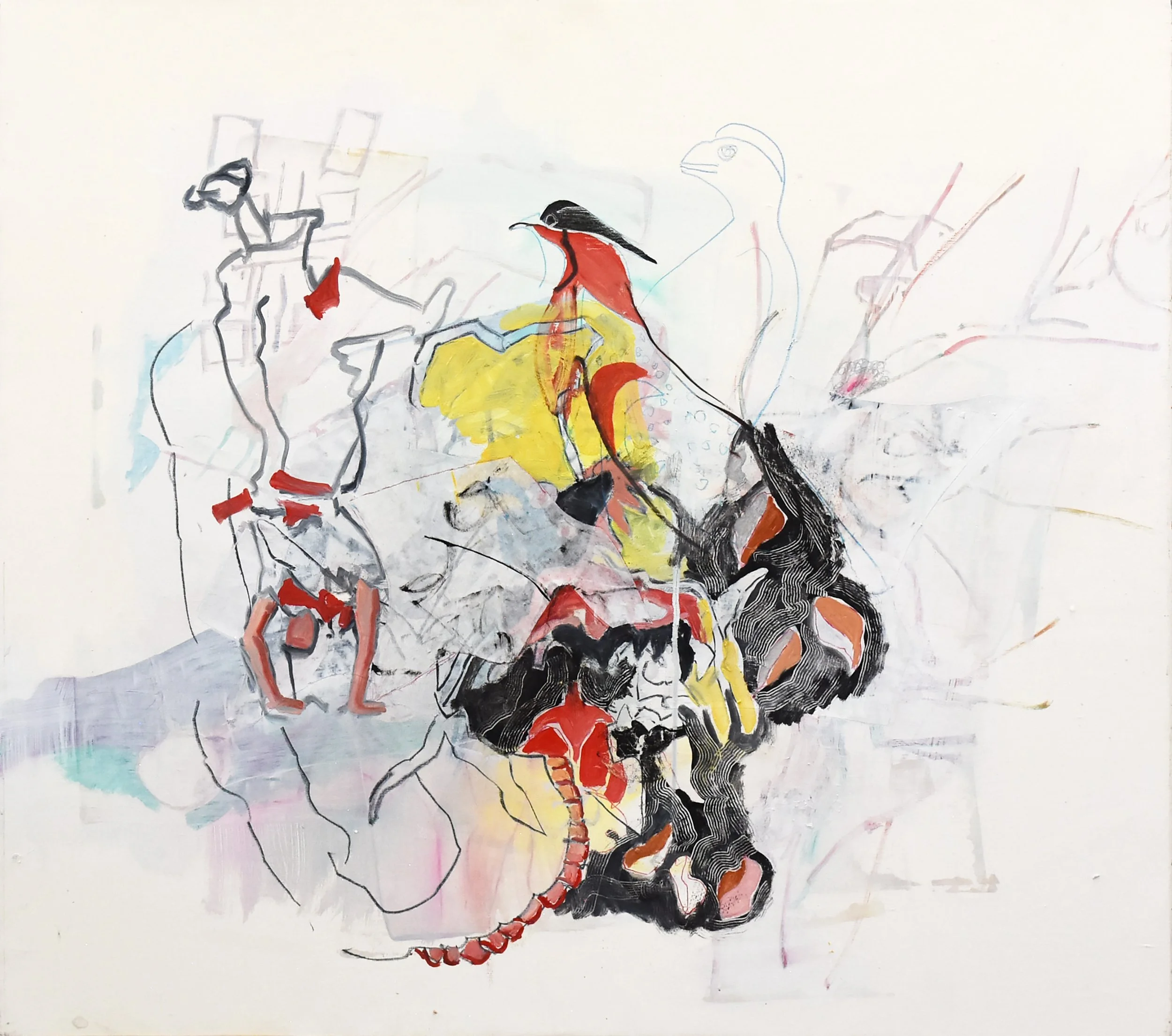 2:11 PM: yesterdays version was interesting, but too specific and descriptive. ok, so there’s a girl doing a handstand and thbeginnings of a bird…more and more, i’m learning to integrate my passion for painting figures in motion; for creekscapes with pure, painterly marks, giving the viewer space for his/her own creation of a painting. the newly collages calligraphic marks on paper contribute greatly to this integration. they were deliberately placed over more descriptive areas of the composition.