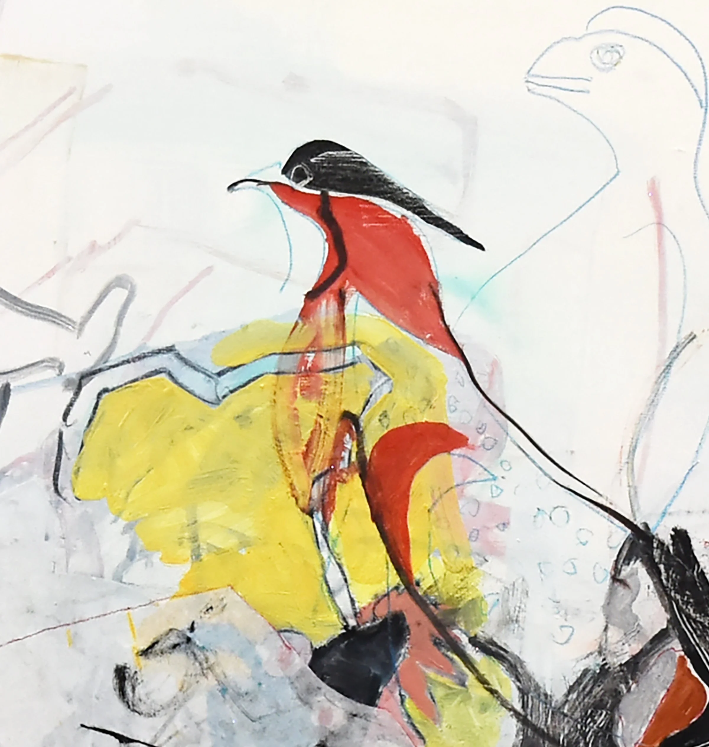 2:53 PM: i took celebration 21 to the next level today. i collaged a piece of paper with some calligraphy in the central area of the composition, and began adding two birds inspired by an ancient roman mosaic. i like what happened; that said, it needs more work to reach resolution.